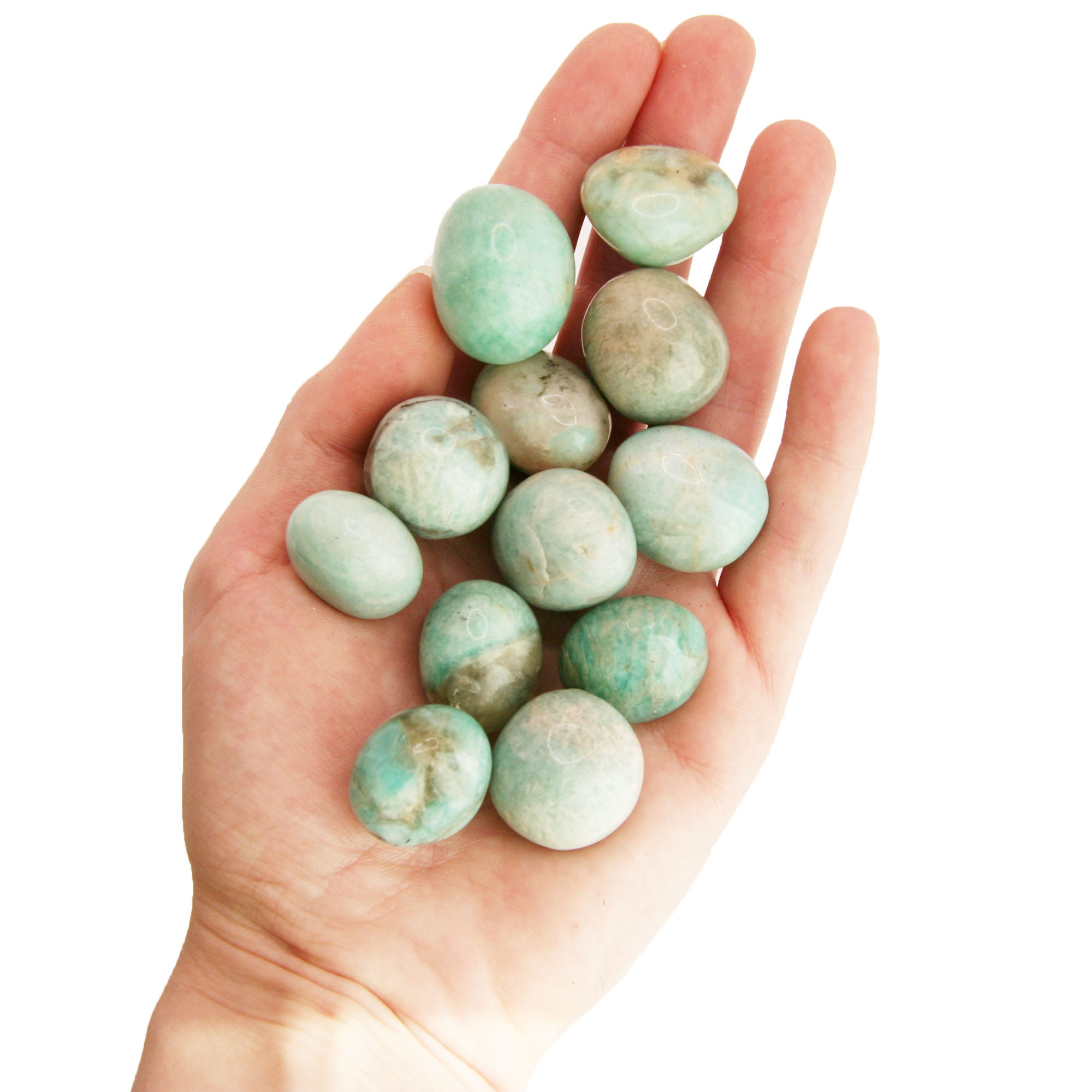 Otoczaki z amazonitu w rozmiarze 25-30 mm mają komfortową wielkość i są przyjemne w dotyku dzięki gładkiej powierzchni. Ich kojąca barwa sprawia, że są chętnie wybierane jako kamienie do noszenia przy sobie, wspierające spokój i równowagę. Stanowią również atrakcyjny element dekoracyjny, dodający wnętrzu świeżości, lub cenny dodatek do kolekcji kamieni bębnowanych.