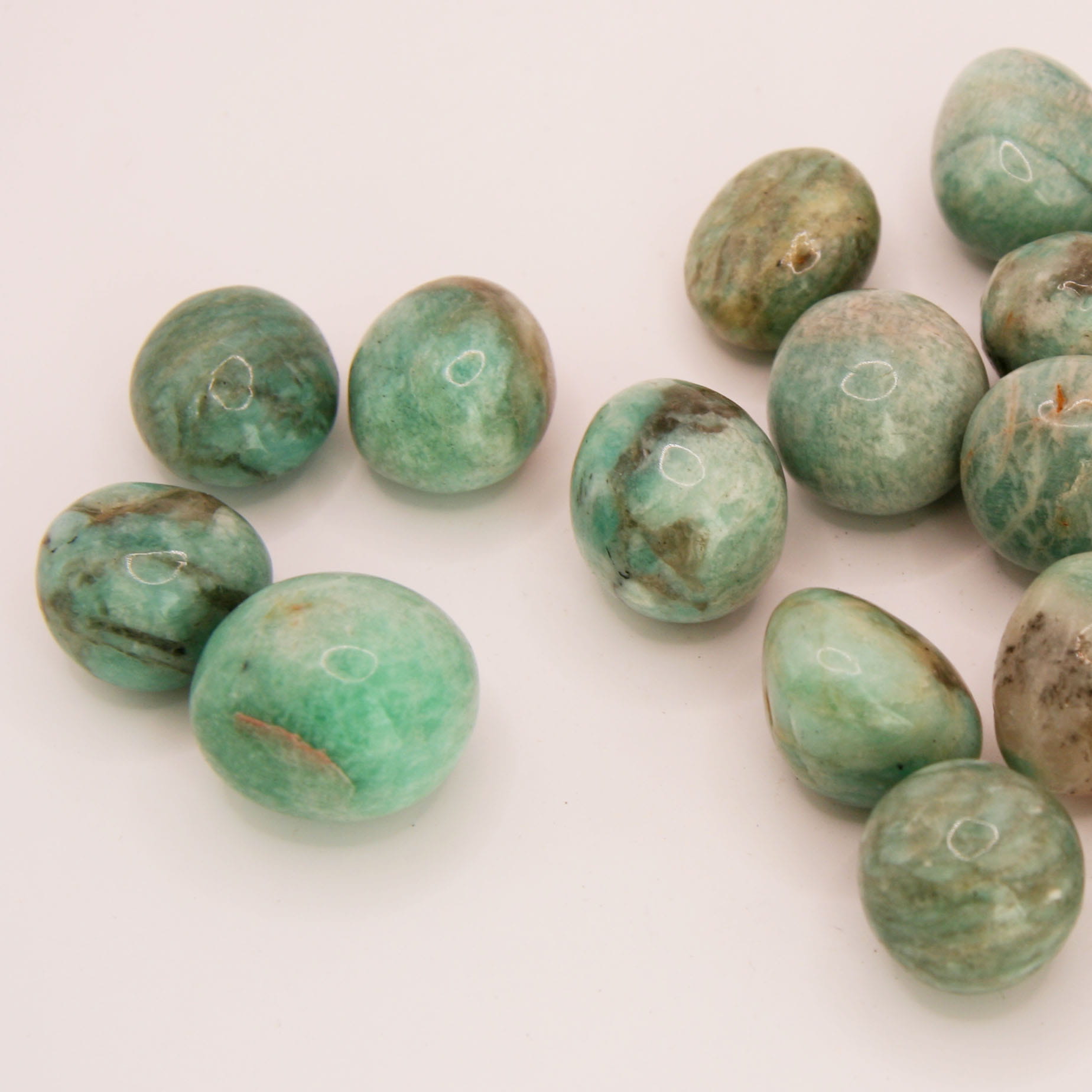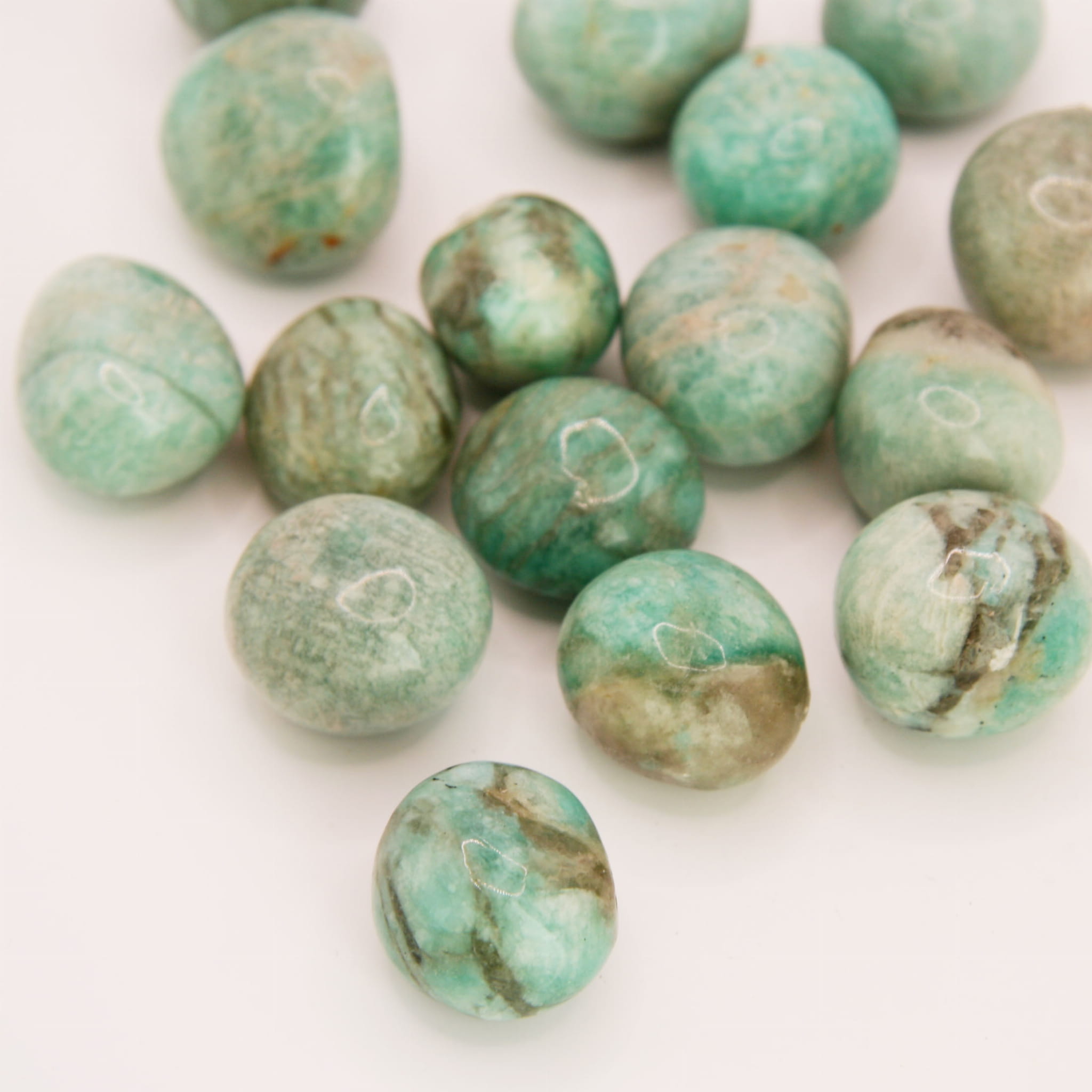 Oferujemy polerowane otoczaki (bębnówki) naturalnego amazonitu, w rozmiarze od 25 do 30 mm. Kamienie te, o gładkim, zaokrąglonym kształcie uzyskanym w procesie bębnowania, charakteryzują się pięknym, zielonym lub niebiesko-zielonym zabarwieniem. Ich powierzchnia często jest urozmaicona naturalnymi, białymi smugami lub nieregularnymi wzorami, co dodaje im unikalnego charakteru. Każdy otoczak jest niepowtarzalny pod względem dokładnego kształtu, odcienia barwy oraz układu wzorów.