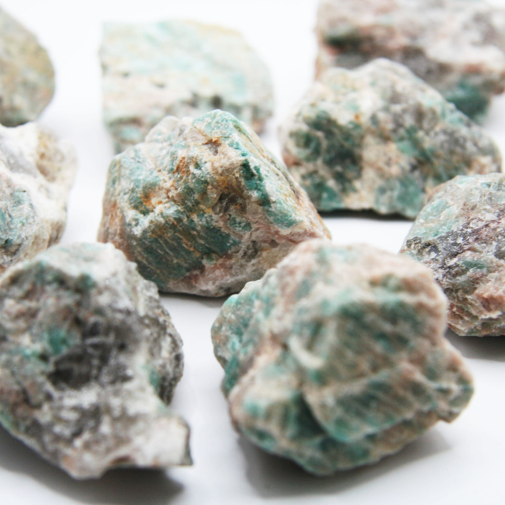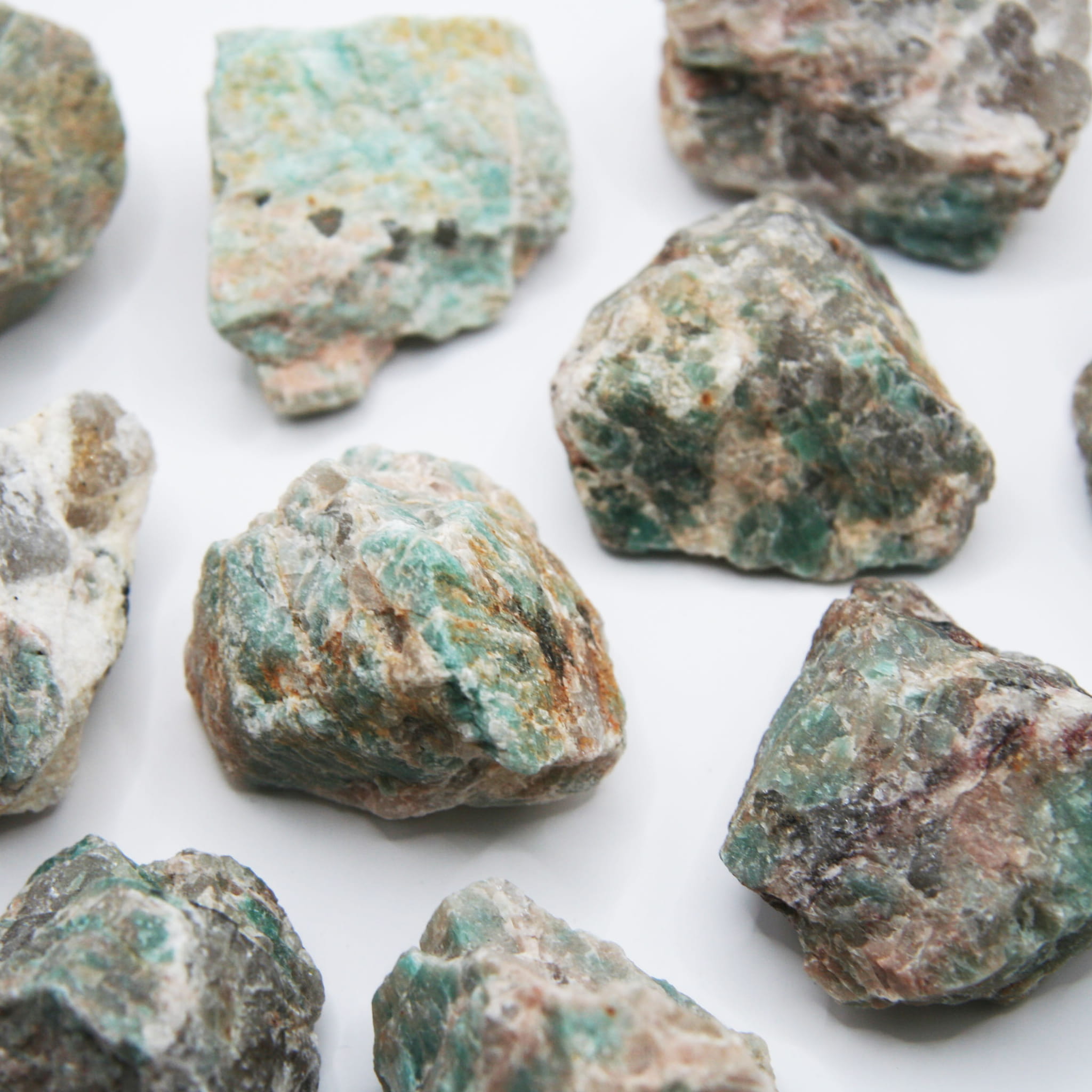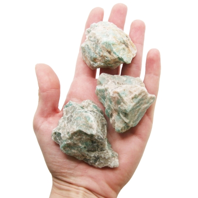Oferujemy naturalne, surowe bryłki amazonitu o przybliżonym rozmiarze w przedziale 45-55 mm. Każdy kamień prezentowany jest w swojej pierwotnej, nieobrobionej formie, z nieregularnym kształtem i naturalną fakturą powierzchni. Bryłki charakteryzują się pięknym, zielonym lub niebiesko-zielonym kolorem, często przeplatanym naturalnymi, białymi smugami lub plamkami, typowymi dla tej odmiany skalenia. Ze względu na naturalne pochodzenie, każda duża bryłka jest unikatowa pod względem dokładnego kształtu, odcienia barwy oraz układu i ilości białych wzorów.