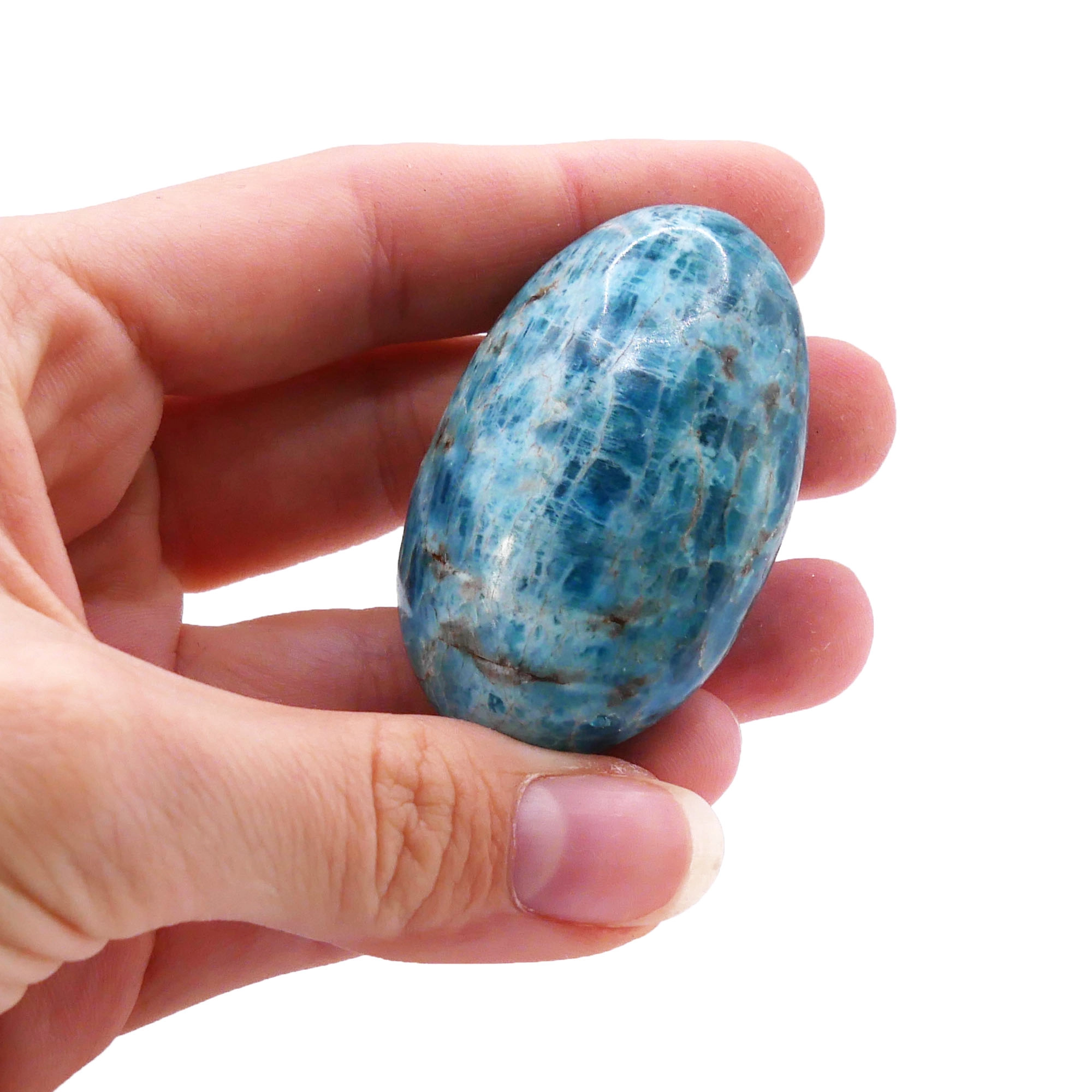 Otoczak apatytu oznaczony numerem 011 to wyjątkowy okaz naturalnego minerału, który w procesie bębnowania uzyskał gładką, zaokrągloną formę. Kamień ten wyróżnia się intensywnym, morskim odcieniem łączącym błękit z nutami zieleni. Jego lśniąca powierzchnia jest poprzecinana siecią naturalnych spękań i inkluzji, które są charakterystyczną cechą apatytu i świadczą o jego autentyczności. Egzemplarz nr 011 posiada własny, niepowtarzalny układ barw i struktur, odróżniający go od innych bryłek.