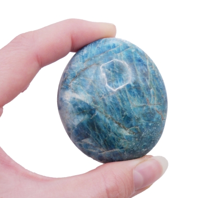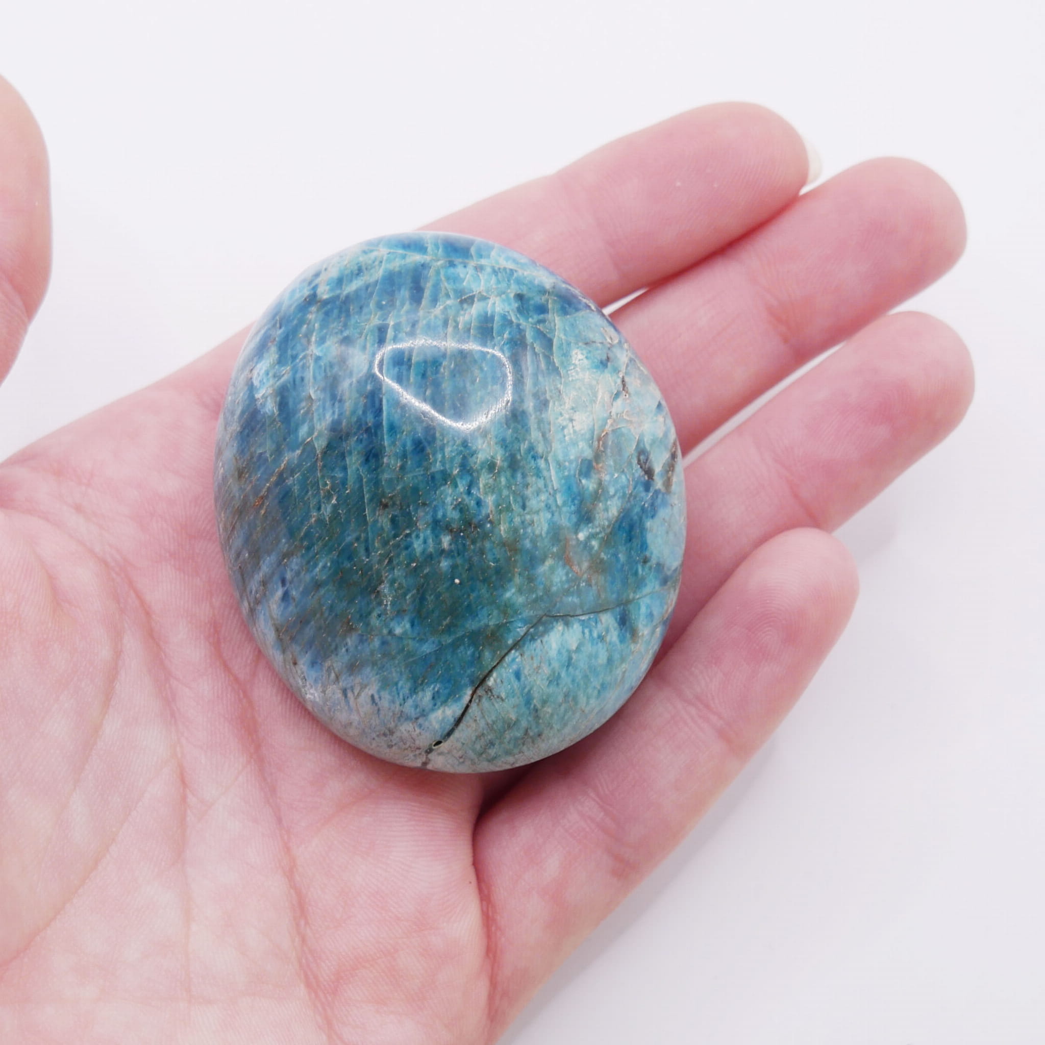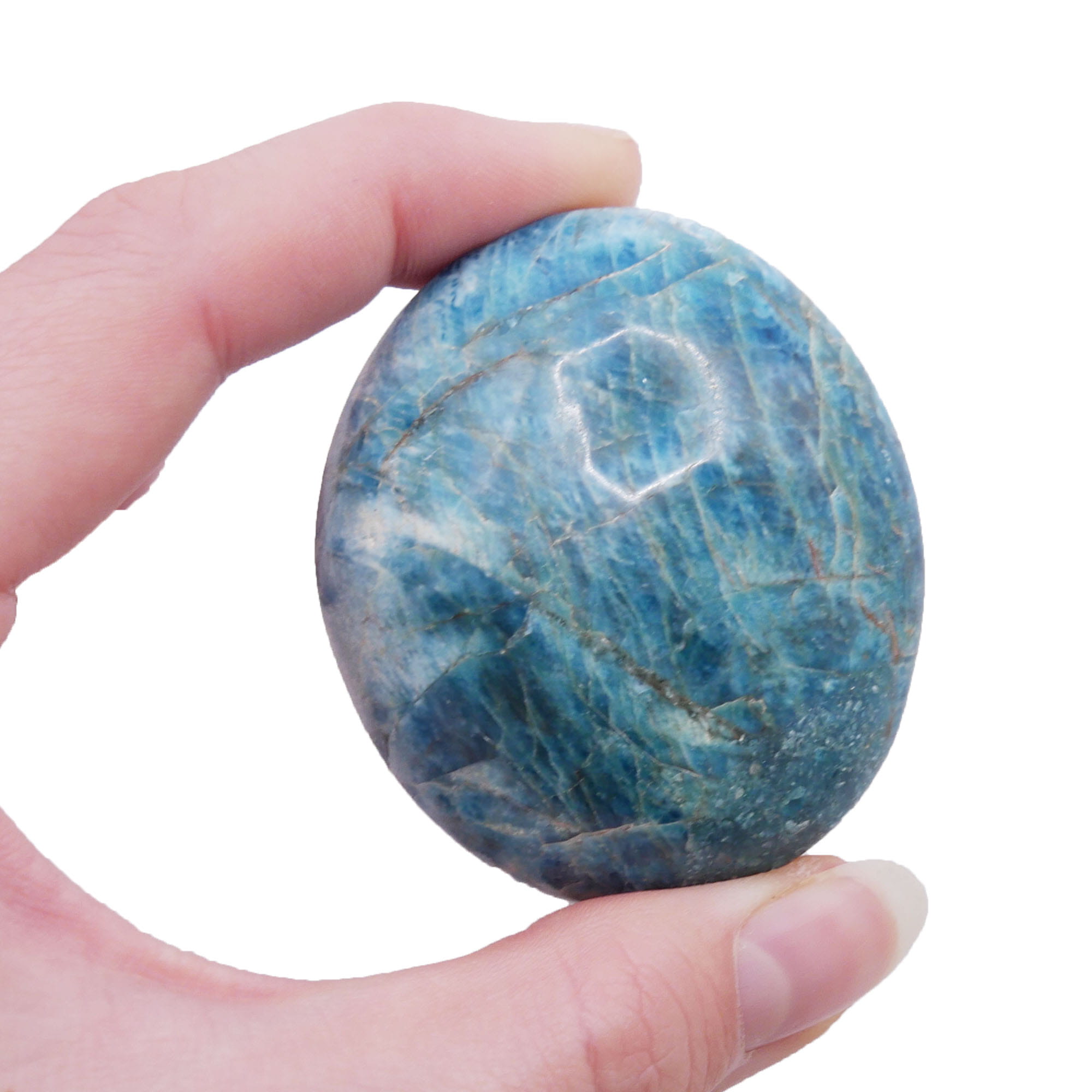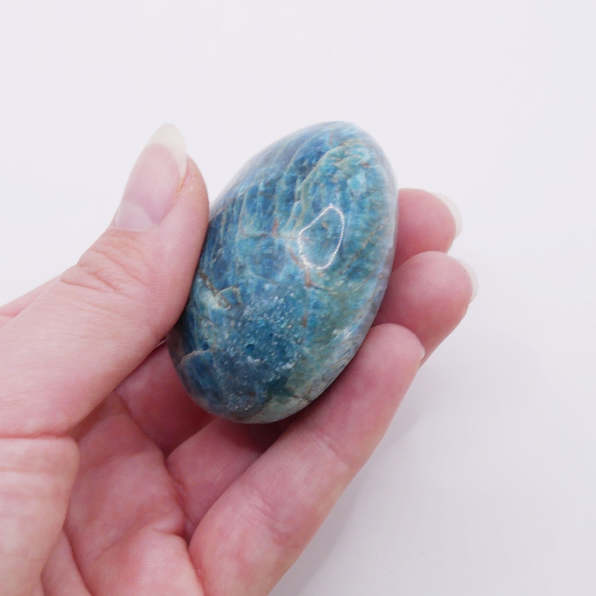 Prezentowany egzemplarz oznaczony numerem 012 to naturalny otoczak apatytu, który zachwyca nasyconą, głęboką barwą. W procesie obróbki nadano mu gładki, obły kształt, który doskonale leży w dłoni. Kamień charakteryzuje się bogatą strukturą wewnętrzną – pod lśniącą powierzchnią widoczne są naturalne inkluzje i załamania światła, tworzące unikalny, trójwymiarowy efekt. Kolorystyka tego okazu oscyluje wokół intensywnych odcieni morskiej toni i turkusu, co jest wizytówką wysokiej jakości apatytu.