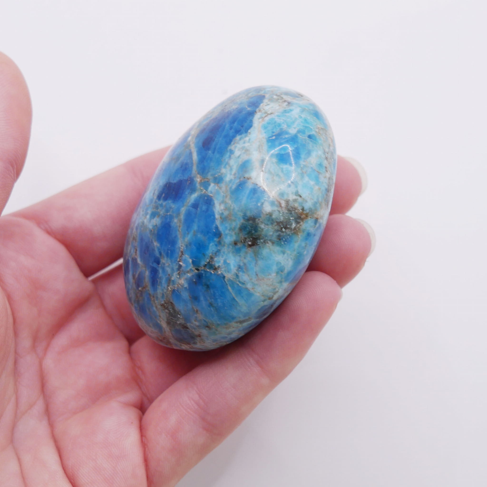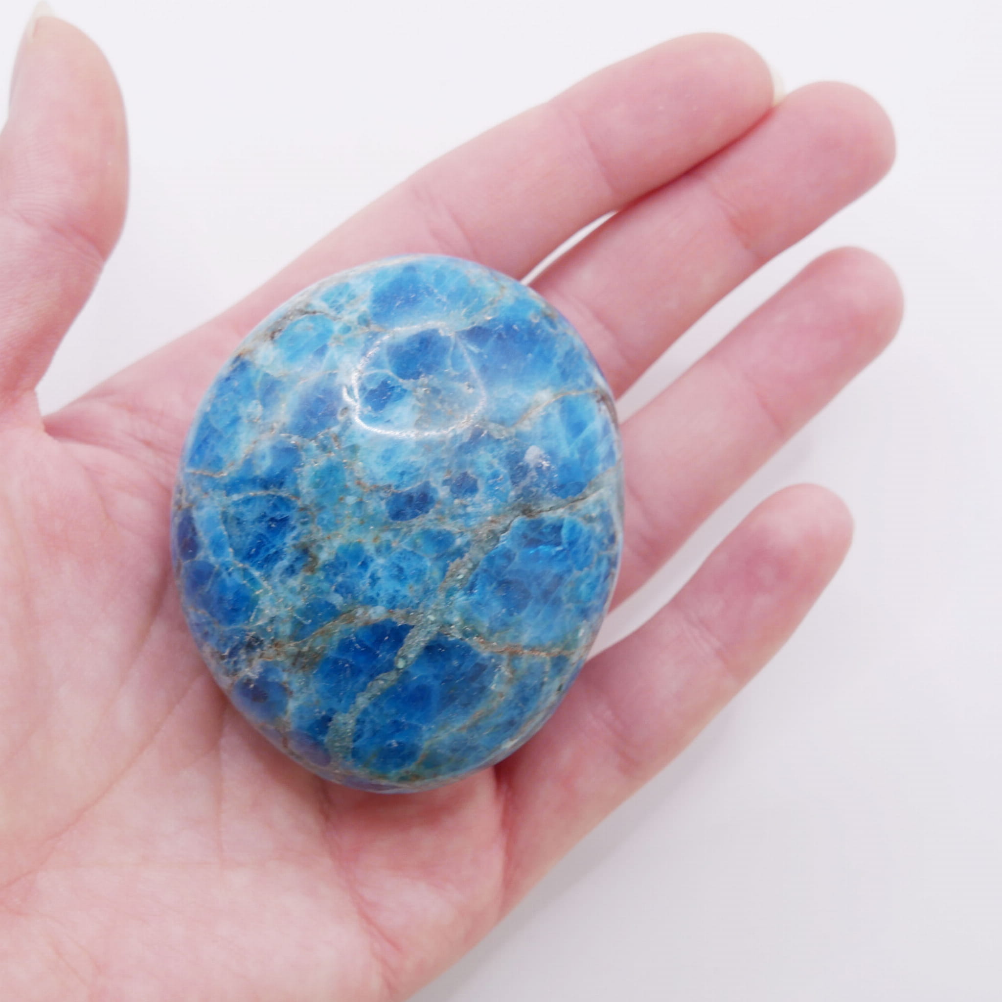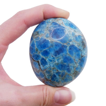 Egzemplarz apatytu oznaczony numerem 013 to naturalny minerał, który dzięki procesowi bębnowania zyskał opływową, przyjemną w dotyku formę. Jego powierzchnia odznacza się szklistym połyskiem, który pięknie współgra z intensywną, niebiesko-zieloną barwą kamienia. Wewnątrz bryły widoczne są liczne naturalne spękania i inkluzje, tworzące fascynującą, trójwymiarową mozaikę. Każda rysa i załamanie światła w tym okazie są unikalne i stanowią o jego naturalnym rodowodzie.