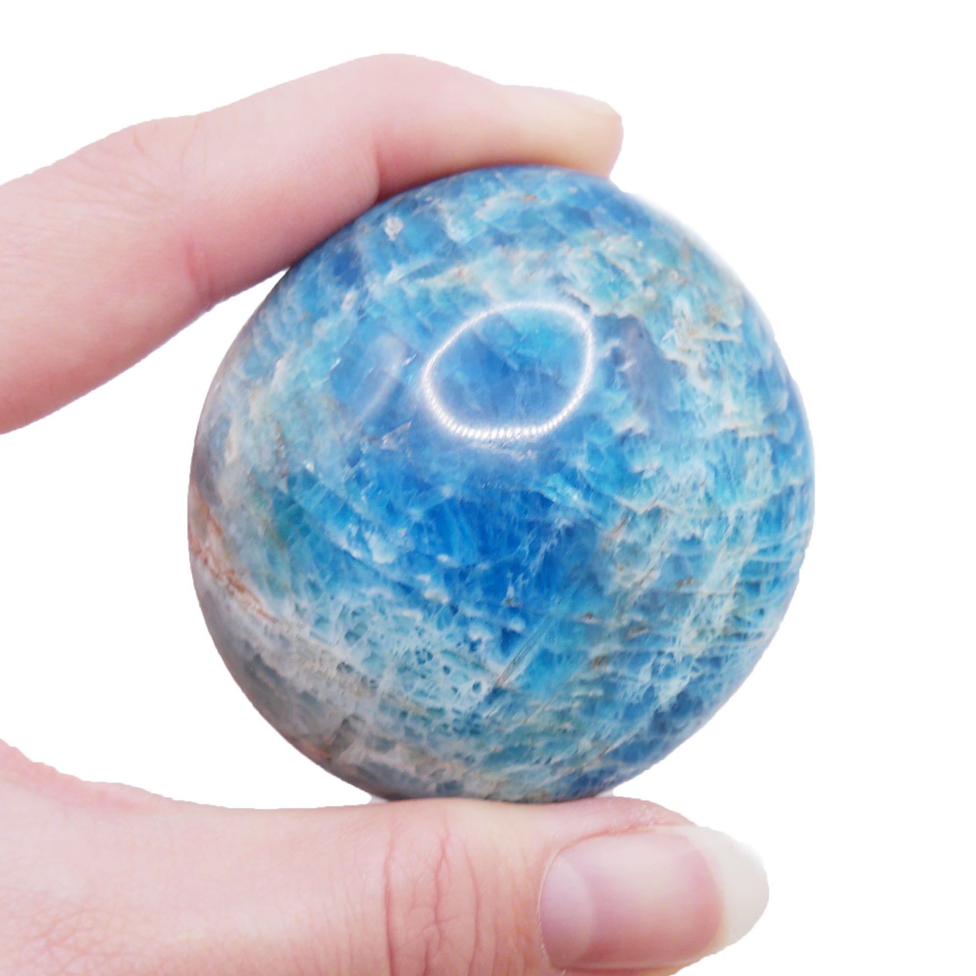 Prezentowany otoczak apatytu, oznaczony numerem 014, to naturalny minerał, który zachwyca swoją intensywną, niebiesko-zieloną kolorystyką. W procesie bębnowania nadano mu gładki, zaokrąglony kształt, który idealnie eksponuje szklisty połysk powierzchni. Wewnątrz kamienia można dostrzec charakterystyczną sieć naturalnych spękań i inkluzji, które załamują światło, tworząc efekt głębi. Egzemplarz ten jest niepowtarzalny dzięki swojemu indywidualnemu kształtowi i nasyceniu barw.