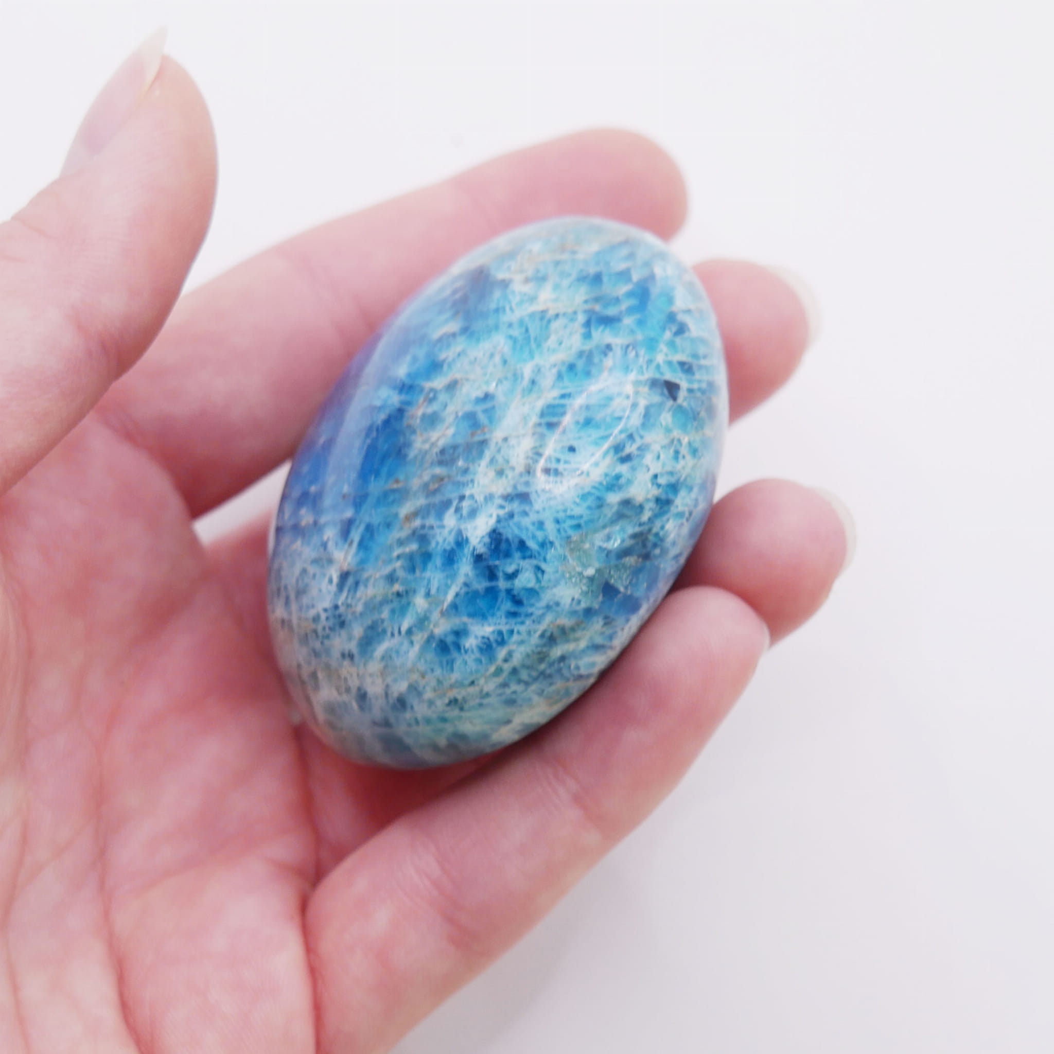 Ten kamień jest doskonałym przykładem naturalnego piękna ukrytego w minerałach. Jego kojąca, morska barwa przywodzi na myśl spokój oceanu, czyniąc go idealnym narzędziem do relaksacji i medytacji. Dzięki poręcznej formie sprawdzi się jako kamień osobisty, wspierający komunikację i ekspresję. Stanowi również wyjątkowy element dekoracyjny, który ożywi każdą kolekcję.
