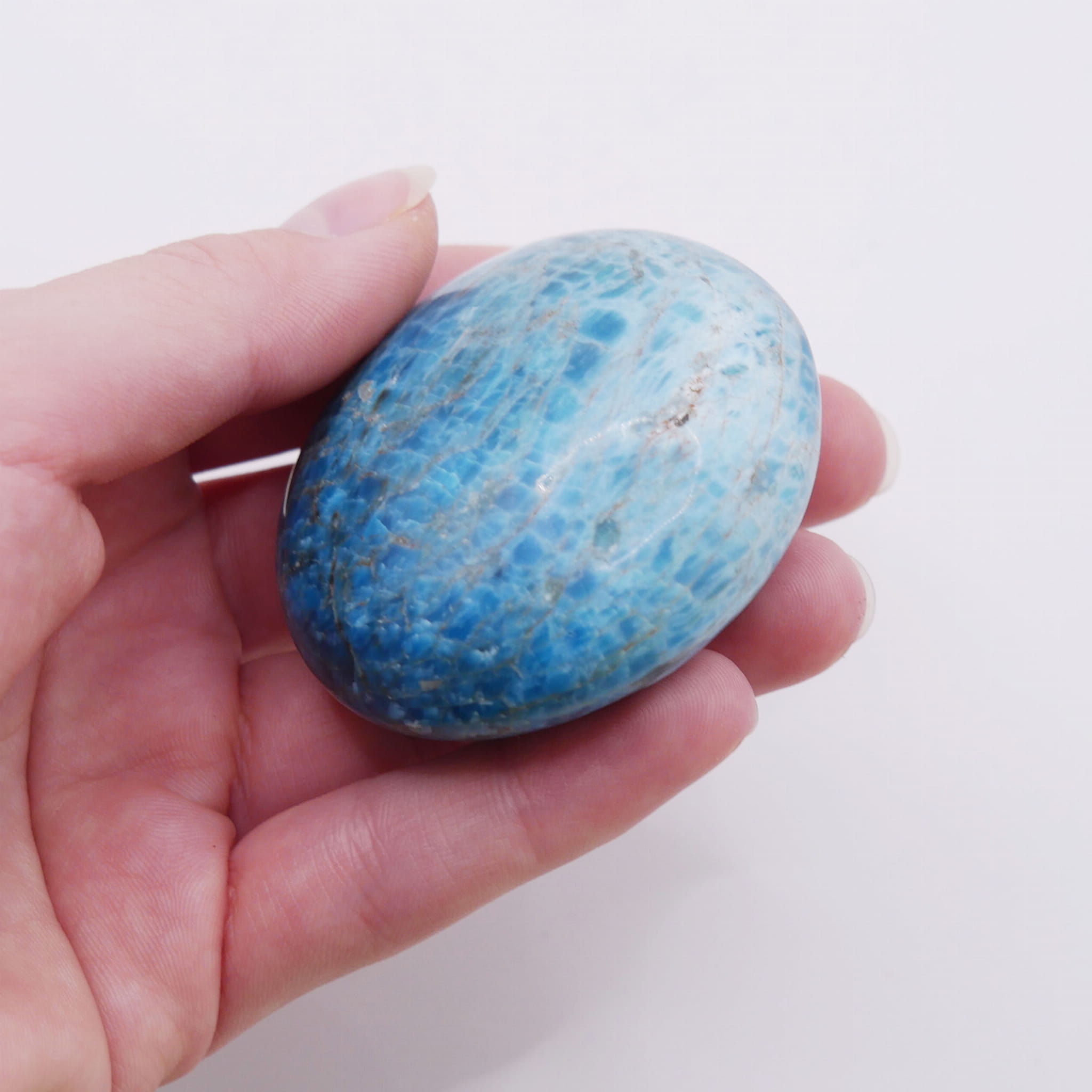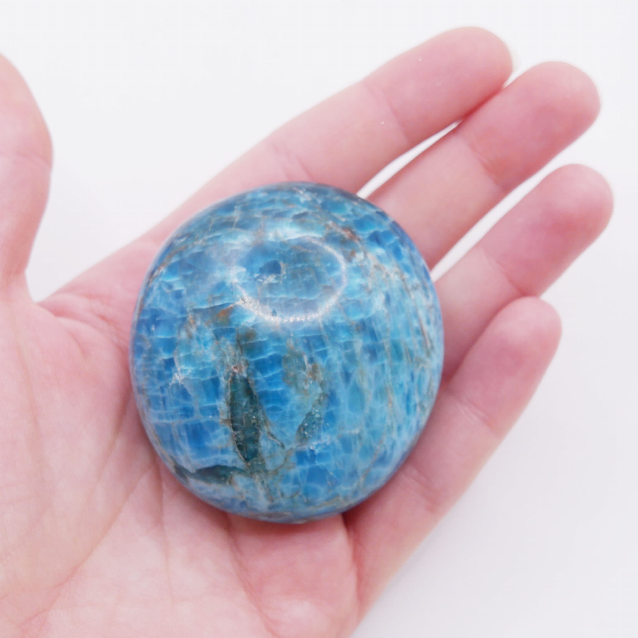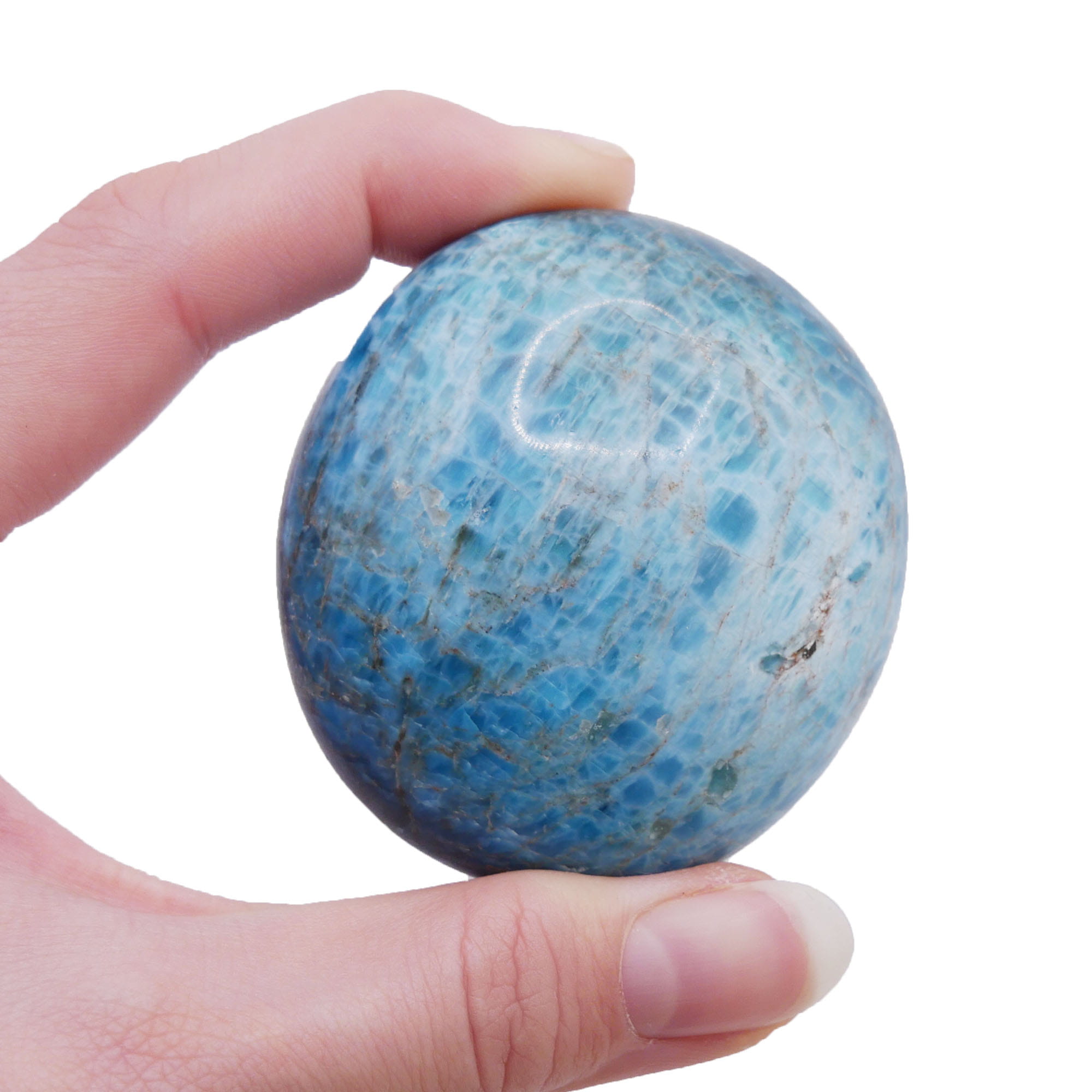Okaz apatytu nr 016 to naturalny minerał, który w procesie bębnowania uzyskał gładki, obły kształt. Wyróżnia się nasyconą, turkusowo-niebieską barwą, która przyciąga wzrok swoją intensywnością. Szklista powierzchnia kamienia pozwala zajrzeć w jego głąb, gdzie widoczne są charakterystyczne, naturalne spękania i inkluzje, tworzące fascynującą mozaikę. Ten konkretny egzemplarz posiada niepowtarzalny układ wewnętrznych struktur, co stanowi o jego wyjątkowości i autentyczności.