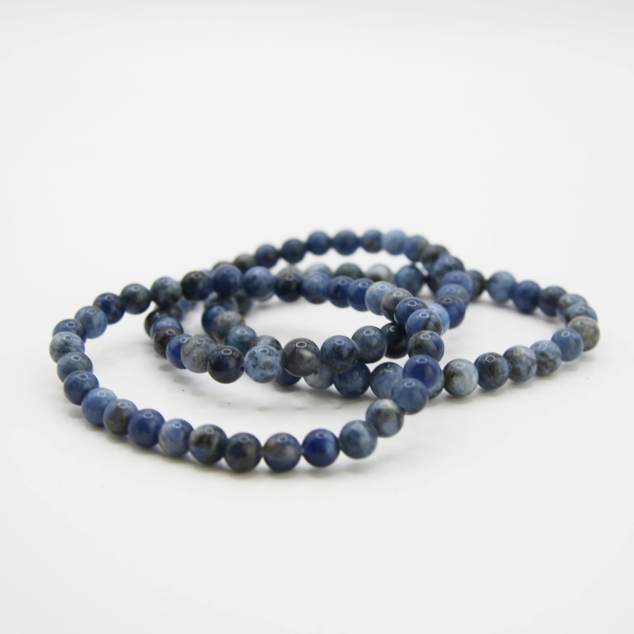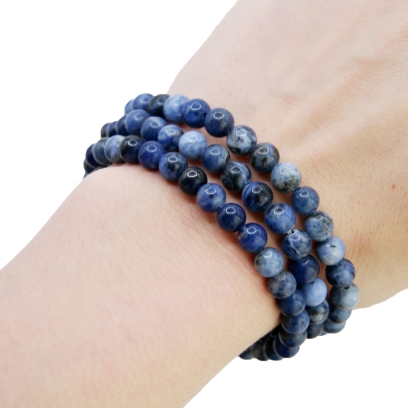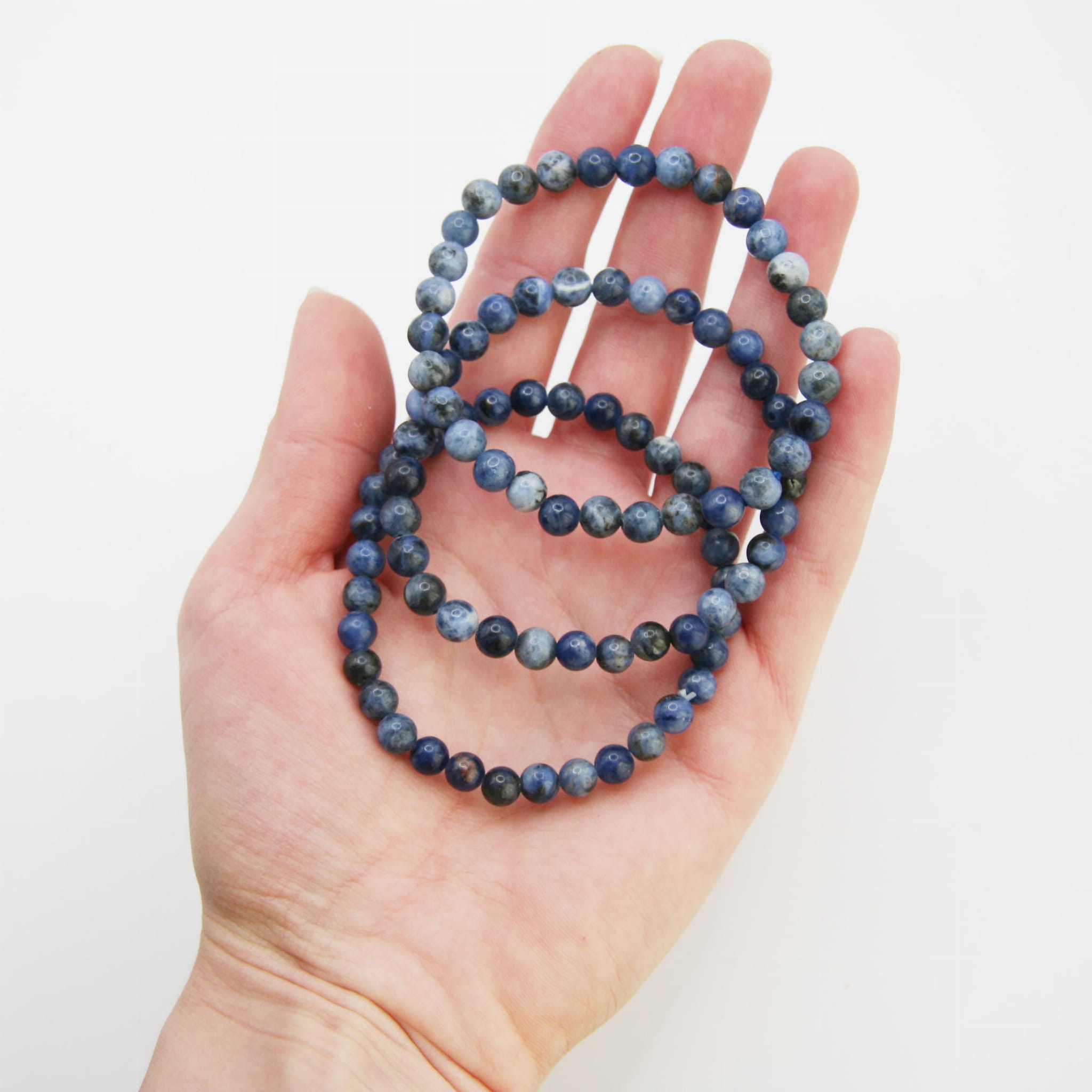 Oferujemy elastyczną bransoletkę złożoną z okrągłych, polerowanych koralików z naturalnego sodalitu. Bransoletka ma długość około 18 cm, a koraliki zostały nawleczone na wytrzymałą, białą gumkę jubilerską, która subtelnie komponuje się z barwą kamienia i zapewnia wygodę noszenia. Koraliki charakteryzują się głębokim, nasyconym niebieskim kolorem, urozmaiconym naturalnymi, białymi żyłkami lub plamkami kalcytu. Każdy koralik posiada swój unikalny wzór, co czyni każdą bransoletkę niepowtarzalną.