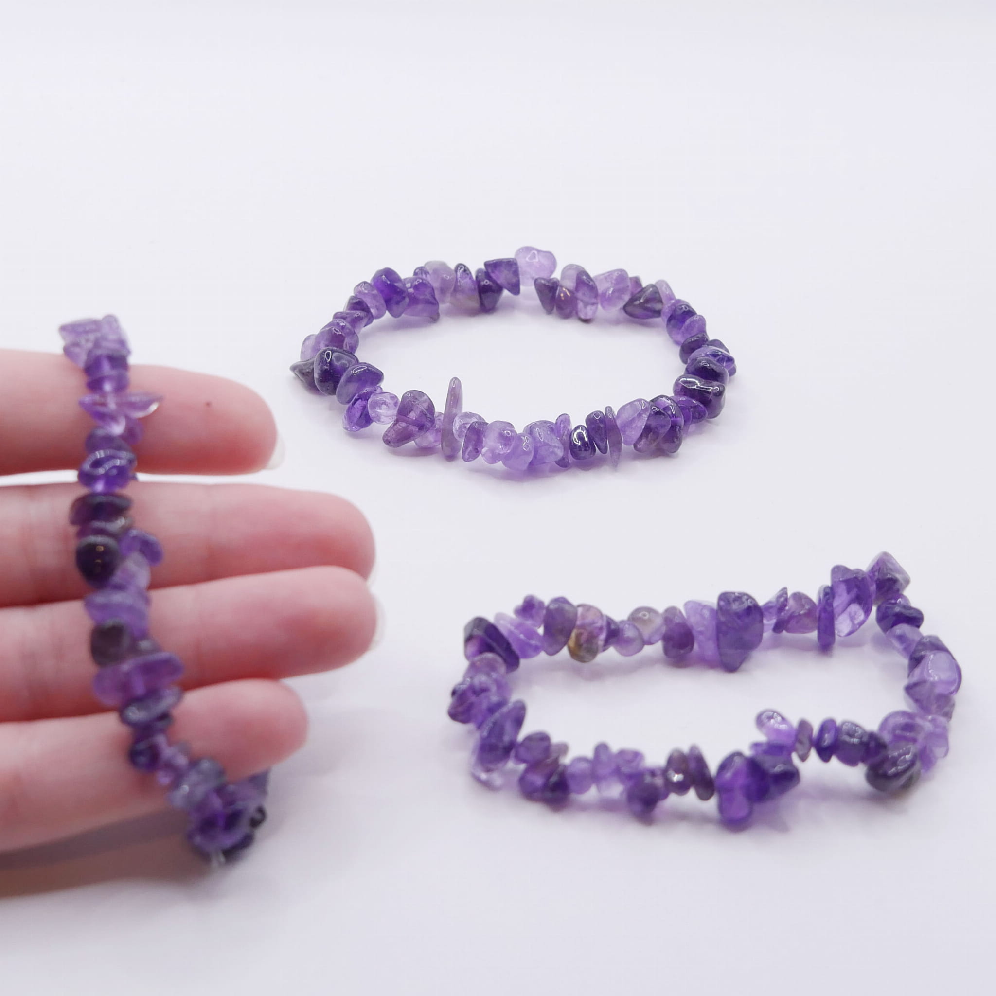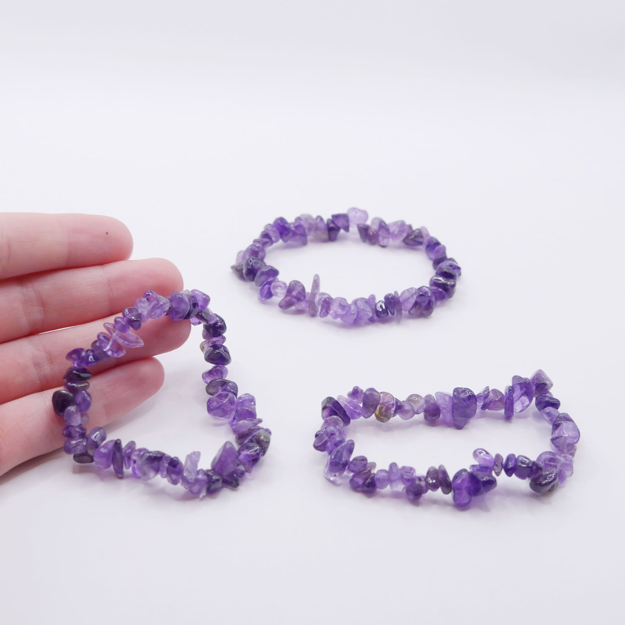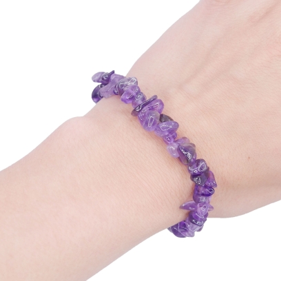 Oferujemy bransoletkę wykonaną z naturalnego ametystu w formie sieczki (małych, nieregularnych otoczaków). Drobne, gładko wypolerowane kamienie zostały nawleczone na wytrzymałą, elastyczną gumkę jubilerską. Bransoletka, bez rozciągania, ma obwód około 18 cm i wygodnie dopasowuje się do nadgarstka. Każdy kamyczek prezentuje charakterystyczne dla ametystu, fioletowe zabarwienie w różnych odcieniach, od jasnej lawendy po głęboką purpurę. Nieregularny kształt kamieni sprawia, że każda bransoletka jest niepowtarzalna.