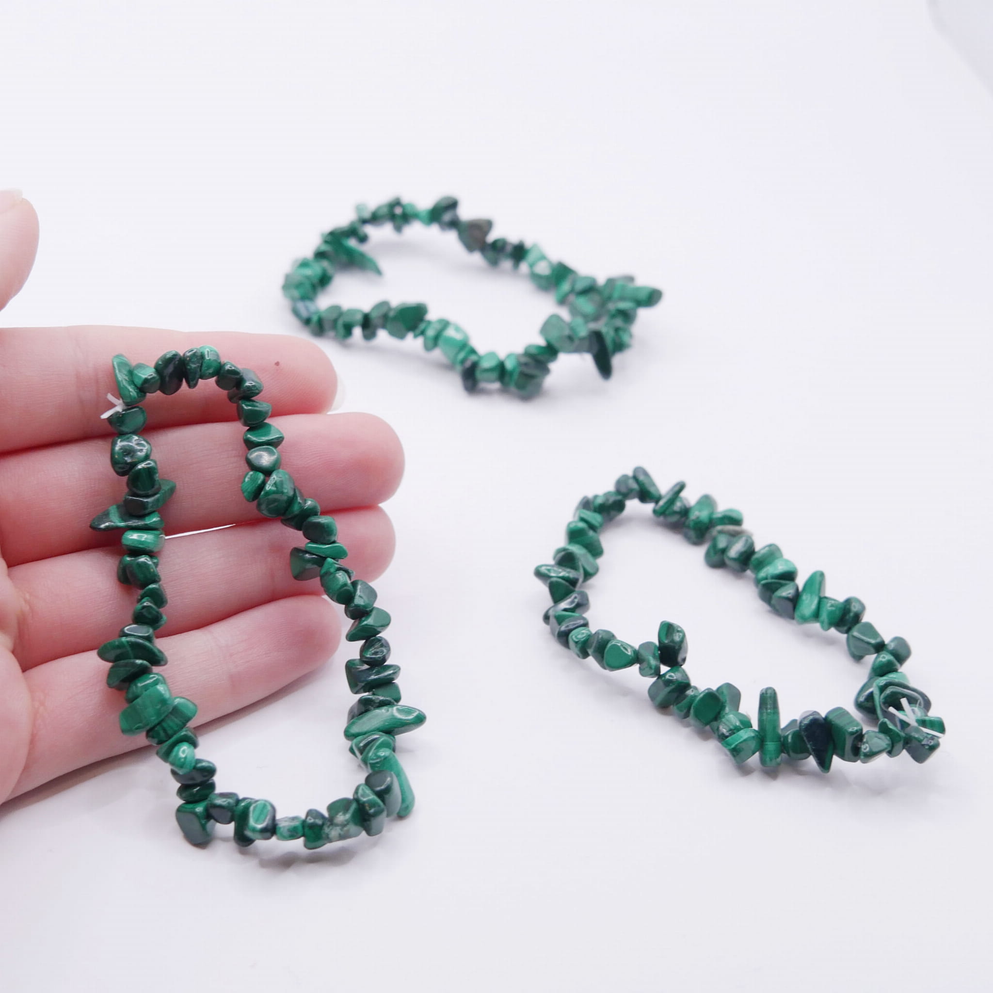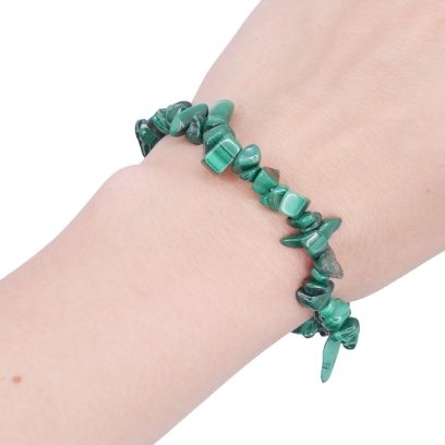 Oferujemy bransoletkę wykonaną z naturalnego malachitu w formie sieczki (małych, nieregularnych otoczaków). Drobne, gładko wypolerowane kamienie zostały nawleczone na wytrzymałą, elastyczną gumkę jubilerską. Bransoletka, bez rozciągania, ma obwód około 18 cm i wygodnie dopasowuje się do nadgarstka. Każdy kamyczek prezentuje charakterystyczne dla malachitu, intensywne odcienie zieleni oraz unikalne pasmowania i wzory, co sprawia, że każda bransoletka jest niepowtarzalna.