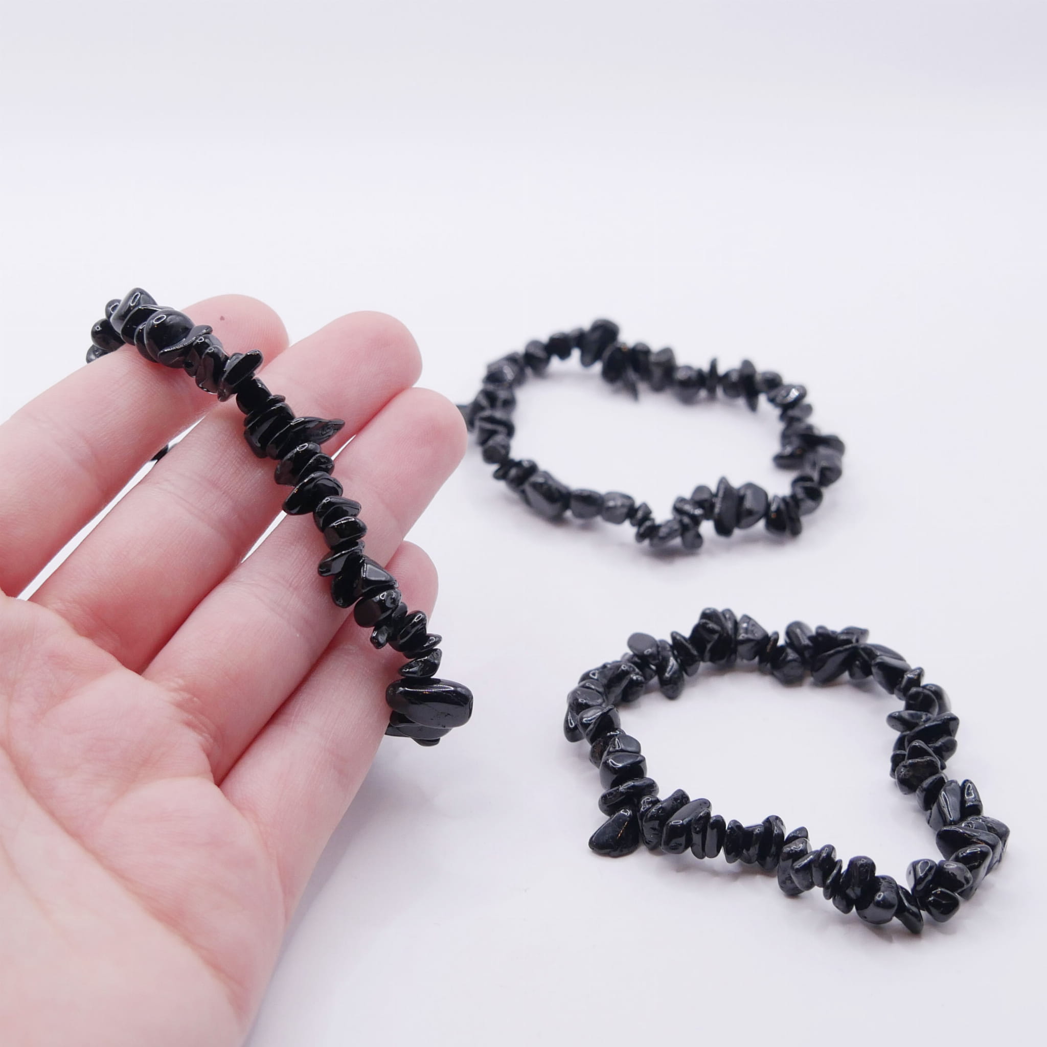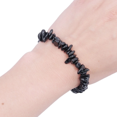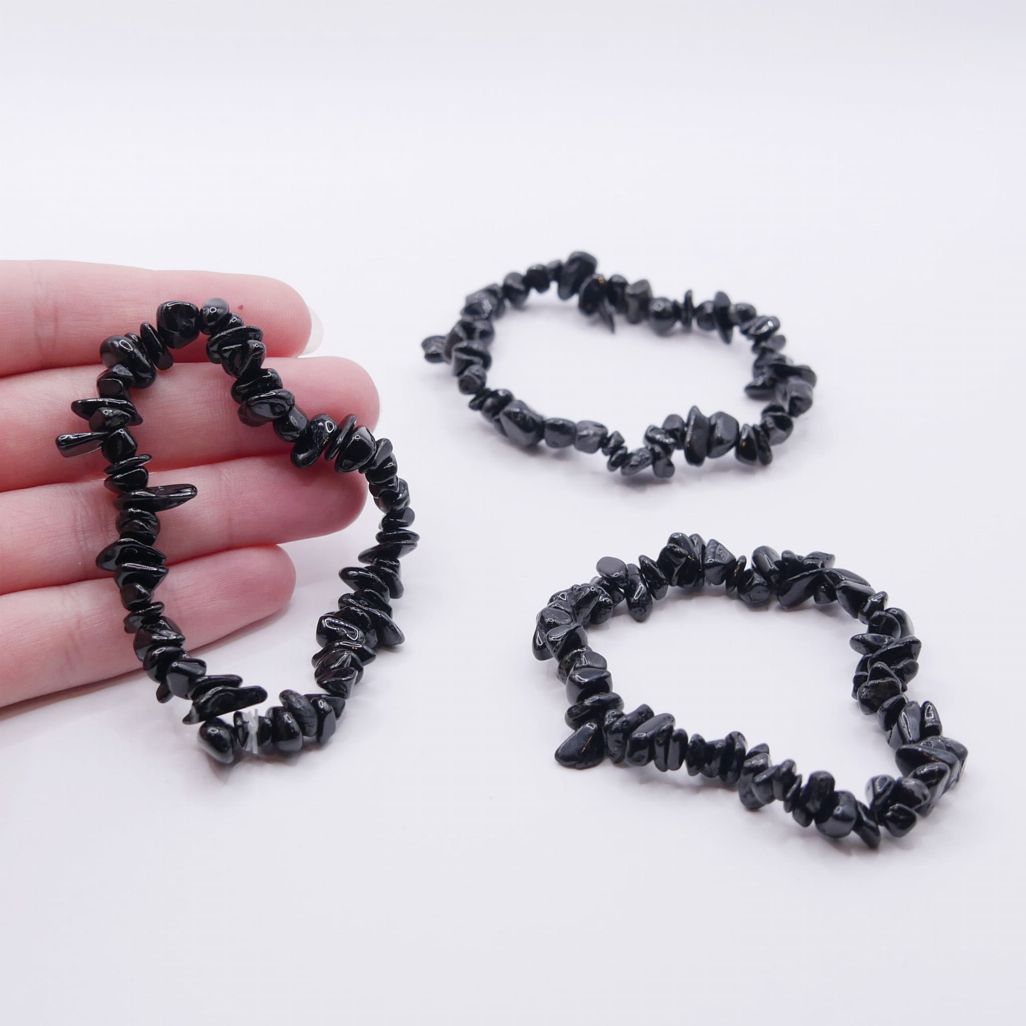 Oferujemy bransoletkę wykonaną z naturalnego czarnego onyksu w formie sieczki (małych, nieregularnych otoczaków). Drobne kamienie zostały nawleczone na wytrzymałą, elastyczną gumkę jubilerską. Bransoletka, bez rozciągania, ma obwód około 18 cm i wygodnie dopasowuje się do nadgarstka. Każdy kamyczek został wygładzony i wypolerowany, zachowując jednocześnie nieregularny kształt, co nadaje bransoletce unikalną fakturę i wygląd. Charakteryzuje się głęboką, czarną barwą i eleganckim połyskiem.