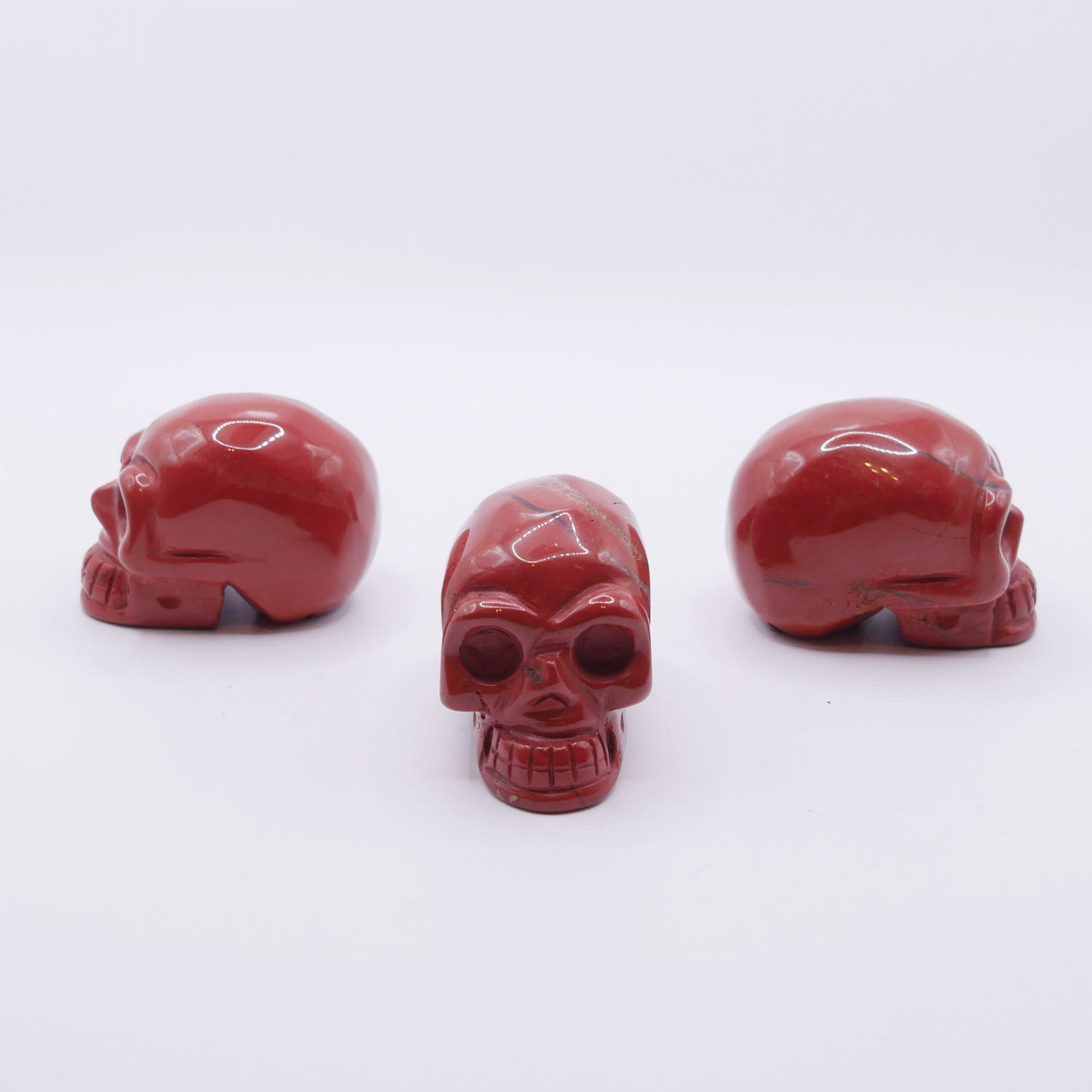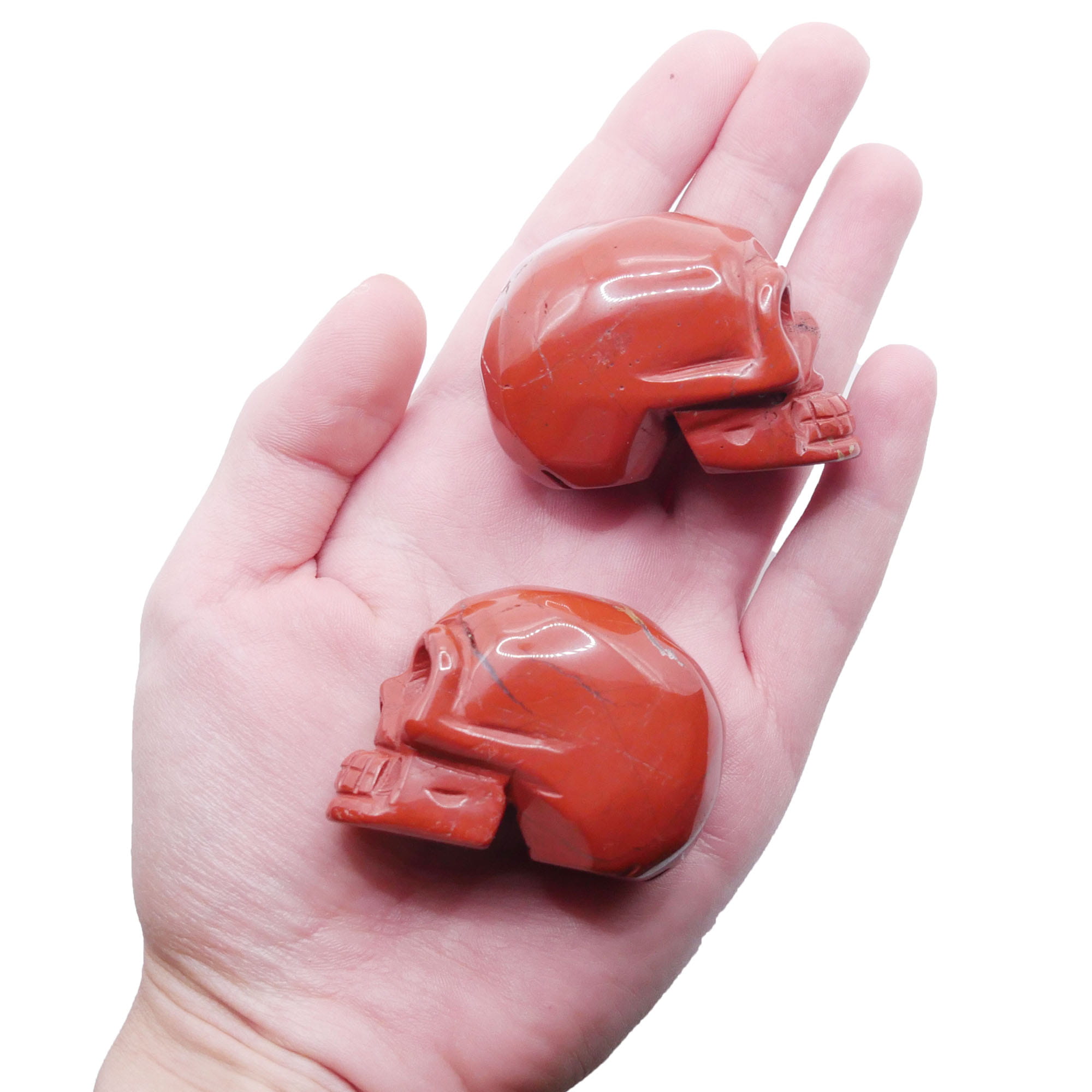 Oferujemy figurki w kształcie czaszki, które zostały ręcznie wyrzeźbione z naturalnego czerwonego jaspisu. Każda figurka ma około 50 mm długości i posiada starannie wypolerowaną, gładką powierzchnię. Polerowanie pięknie eksponuje charakterystyczną dla czerwonego jaspisu, intensywną, ziemistą czerwień oraz jego naturalną strukturę. Ze względu na naturalną zmienność kamienia i ręczne wykonanie, każda figurka jest unikatowa pod względem odcienia, subtelnych wzorów i detali rzeźbienia.