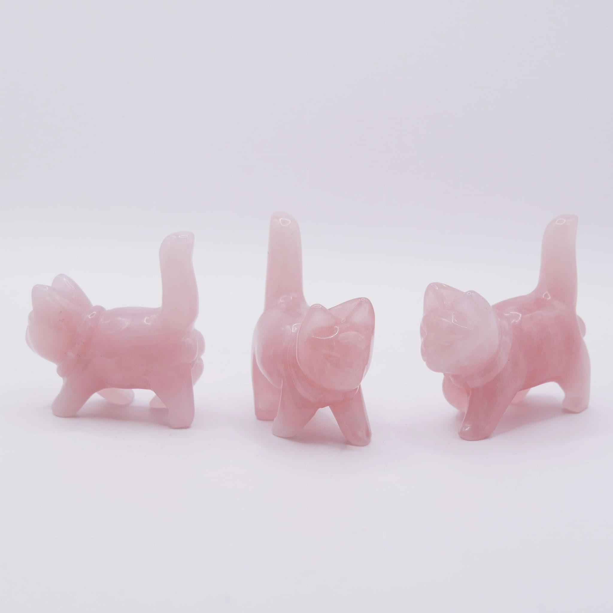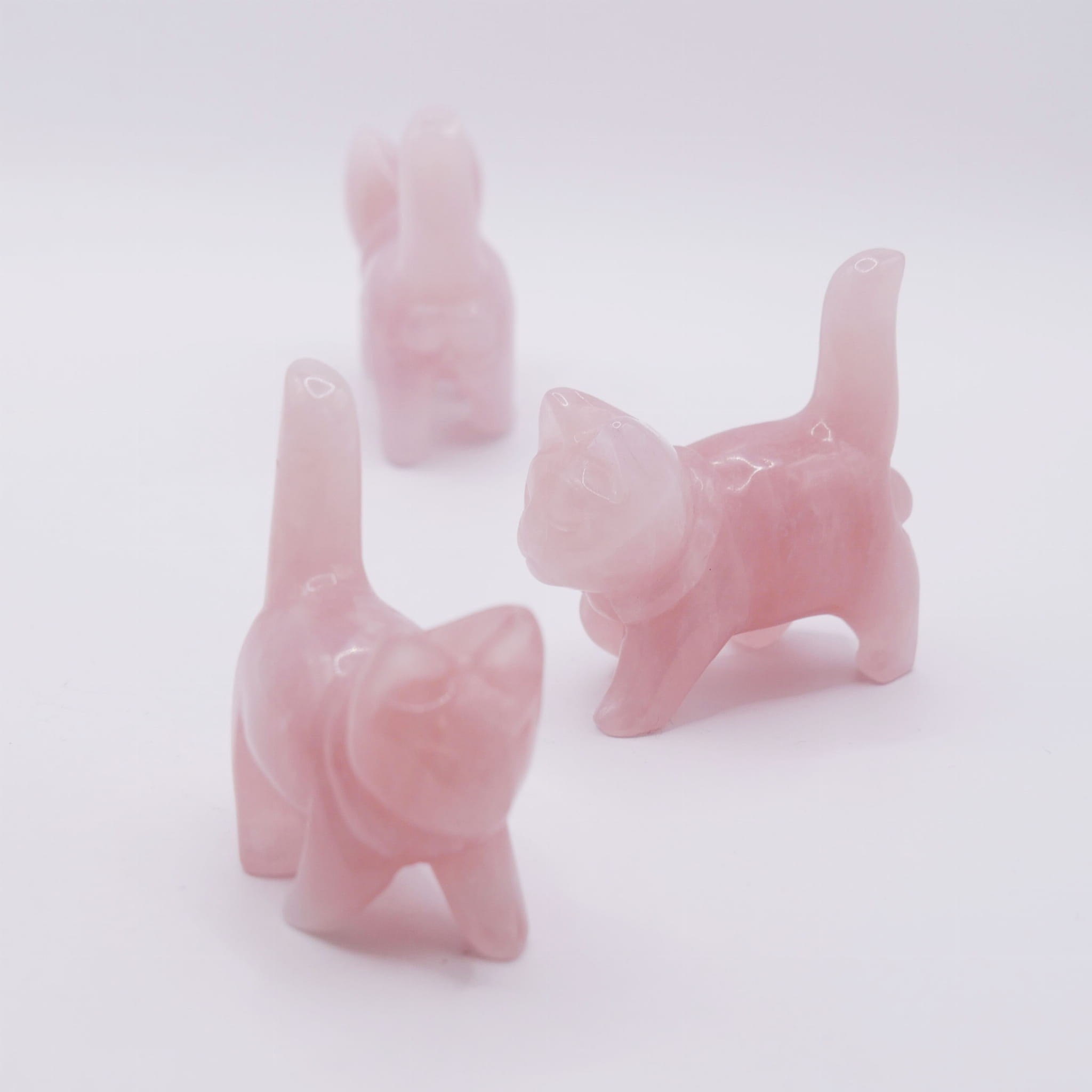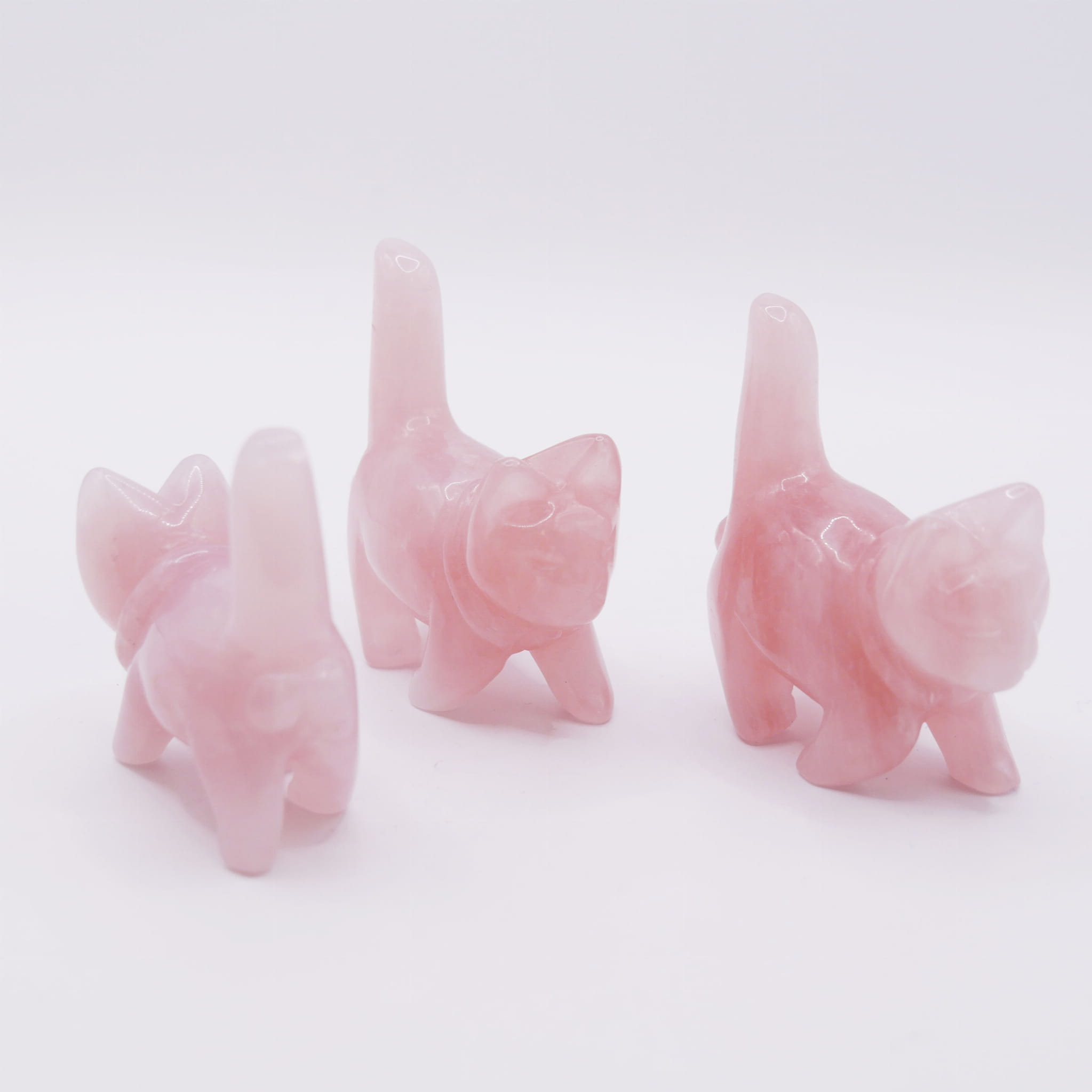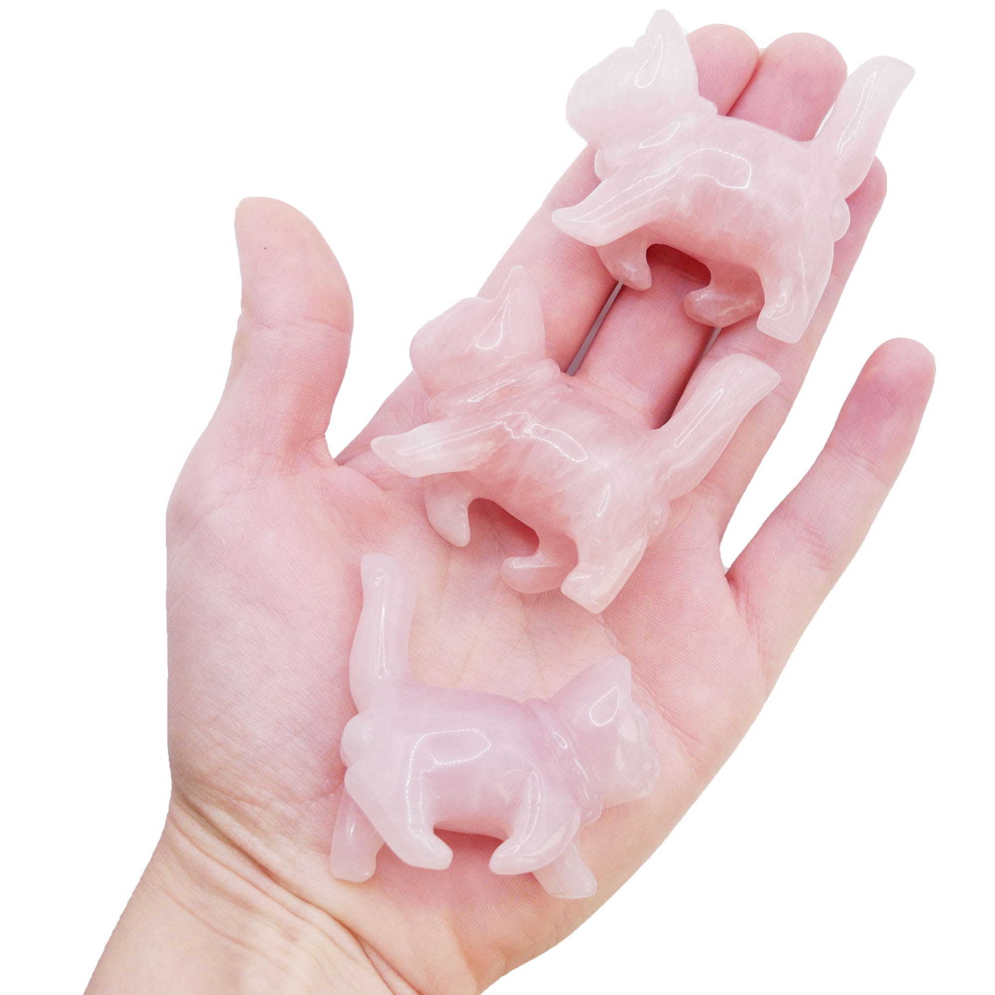 Oferujemy urocze figurki w kształcie kota, ręcznie wyrzeźbione z naturalnego kwarcu różowego. Każda figurka ma wysokość około 50 mm i odznacza się starannie wypolerowaną, gładką powierzchnią. Kamień prezentuje charakterystyczne, delikatne odcienie różu oraz subtelną, często mleczną przejrzystość. Ze względu na naturalne pochodzenie materiału i ręczny proces obróbki, każdy egzemplarz jest unikatowy pod względem nasycenia barwy i ewentualnych wewnętrznych struktur (inkluzji).