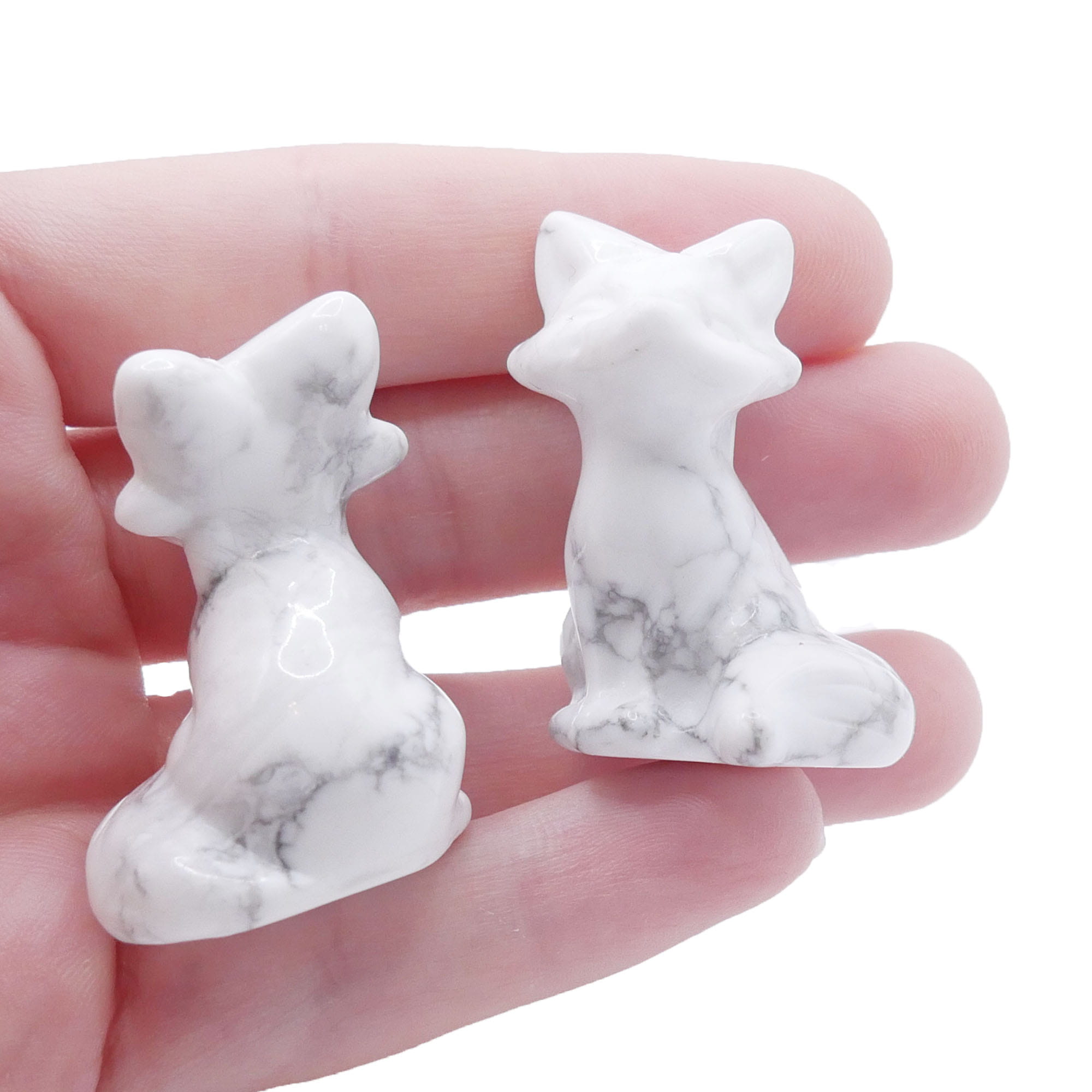 Oferujemy figurki w kształcie lisa, które zostały ręcznie wyrzeźbione z naturalnego howlitu. Każda figurka ma około 40 mm wielkości (w najdłuższym wymiarze) i posiada starannie wypolerowaną, gładką powierzchnię. Polerowanie pięknie eksponuje charakterystyczną dla howlitu białą barwę, którą przecina unikalna sieć szarych lub czarnych żyłek, przypominająca wzór marmuru. Ze względu na naturalną zmienność kamienia i ręczne wykonanie, każda figurka jest unikatowa pod względem układu wzorów i detali rzeźbienia.
