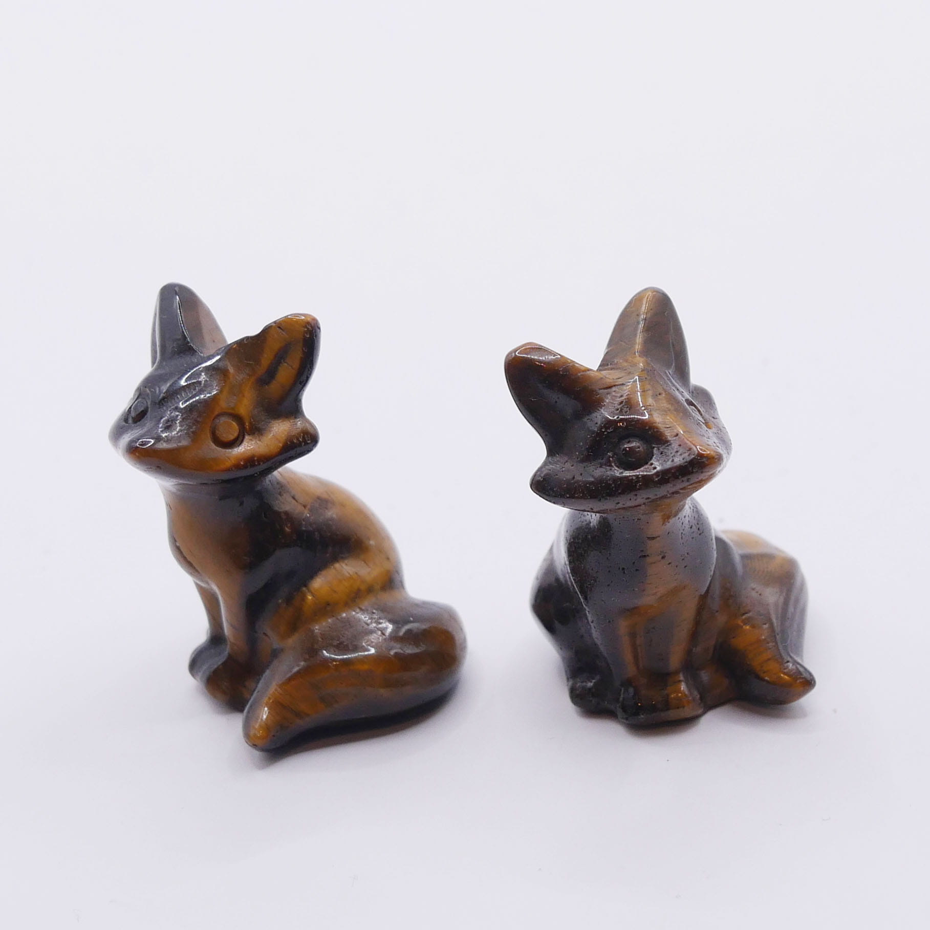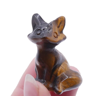 Oferujemy figurki w kształcie lisa, które zostały ręcznie wyrzeźbione z naturalnego tygrysiego oka. Każda figurka ma około 40 mm wielkości (w najdłuższym wymiarze) i posiada starannie wypolerowaną, gładką powierzchnię. Polerowanie pięknie eksponuje charakterystyczne dla tygrysiego oka złocisto-brązowe pasma oraz dynamiczny, jedwabisty połysk (tzw. efekt kociego oka), który zmienia się w zależności od kąta patrzenia. Ze względu na naturalną zmienność kamienia i ręczne wykonanie, każda figurka jest unikatowa pod względem układu wzorów, odcieni i drobnych detali rzeźbienia.