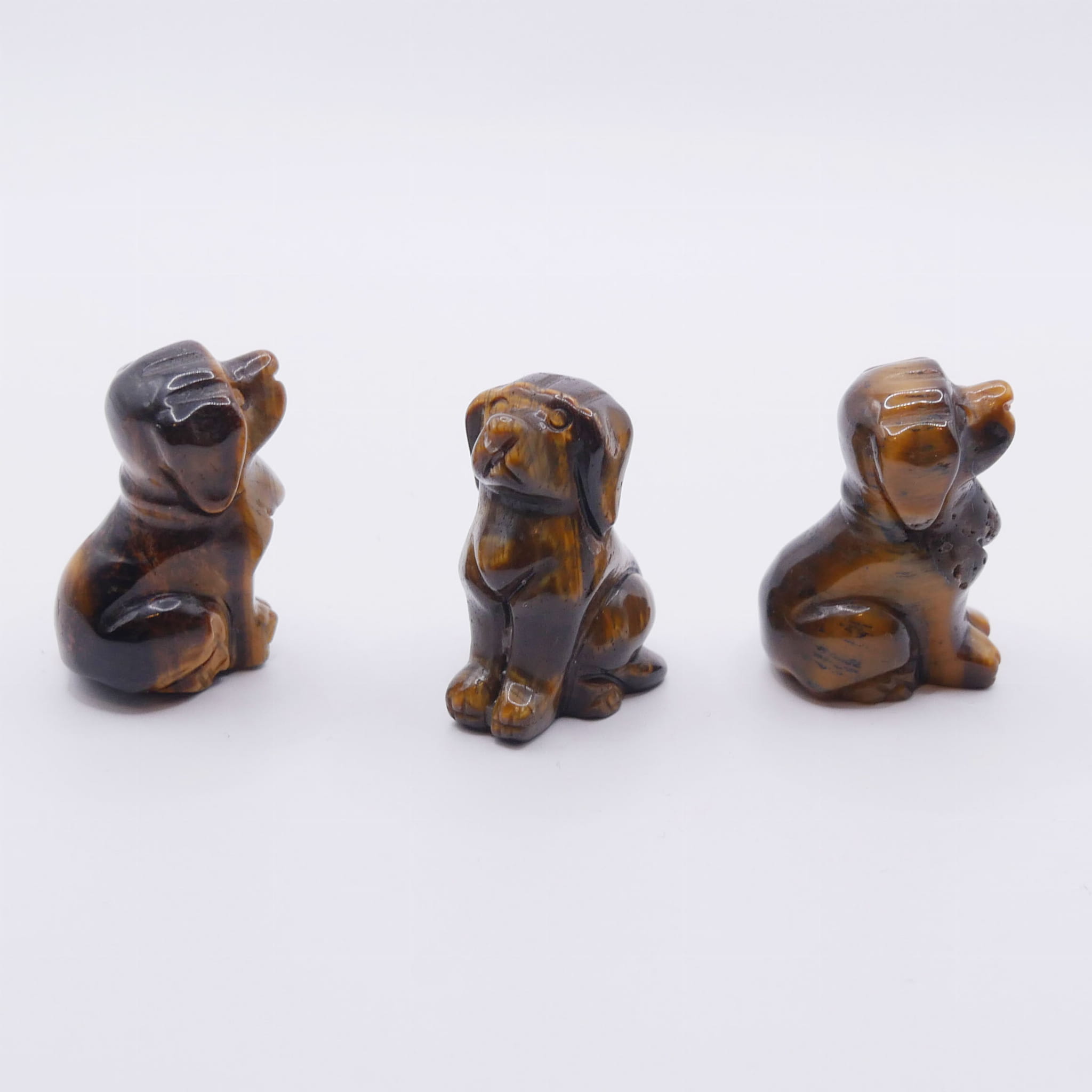 Oferujemy urocze figurki w kształcie psa, które zostały ręcznie wyrzeźbione z naturalnego tygrysiego oka. Każda figurka ma około 35 mm wysokości i posiada starannie wypolerowaną, gładką powierzchnię. Polerowanie pięknie eksponuje charakterystyczne dla tygrysiego oka złocisto-brązowe pasma oraz dynamiczny, jedwabisty połysk (tzw. efekt kociego oka), który zmienia się w zależności od kąta patrzenia. Ze względu na naturalną zmienność kamienia i ręczne wykonanie, każda figurka jest unikatowa pod względem układu wzorów, odcieni i drobnych detali rzeźbienia.