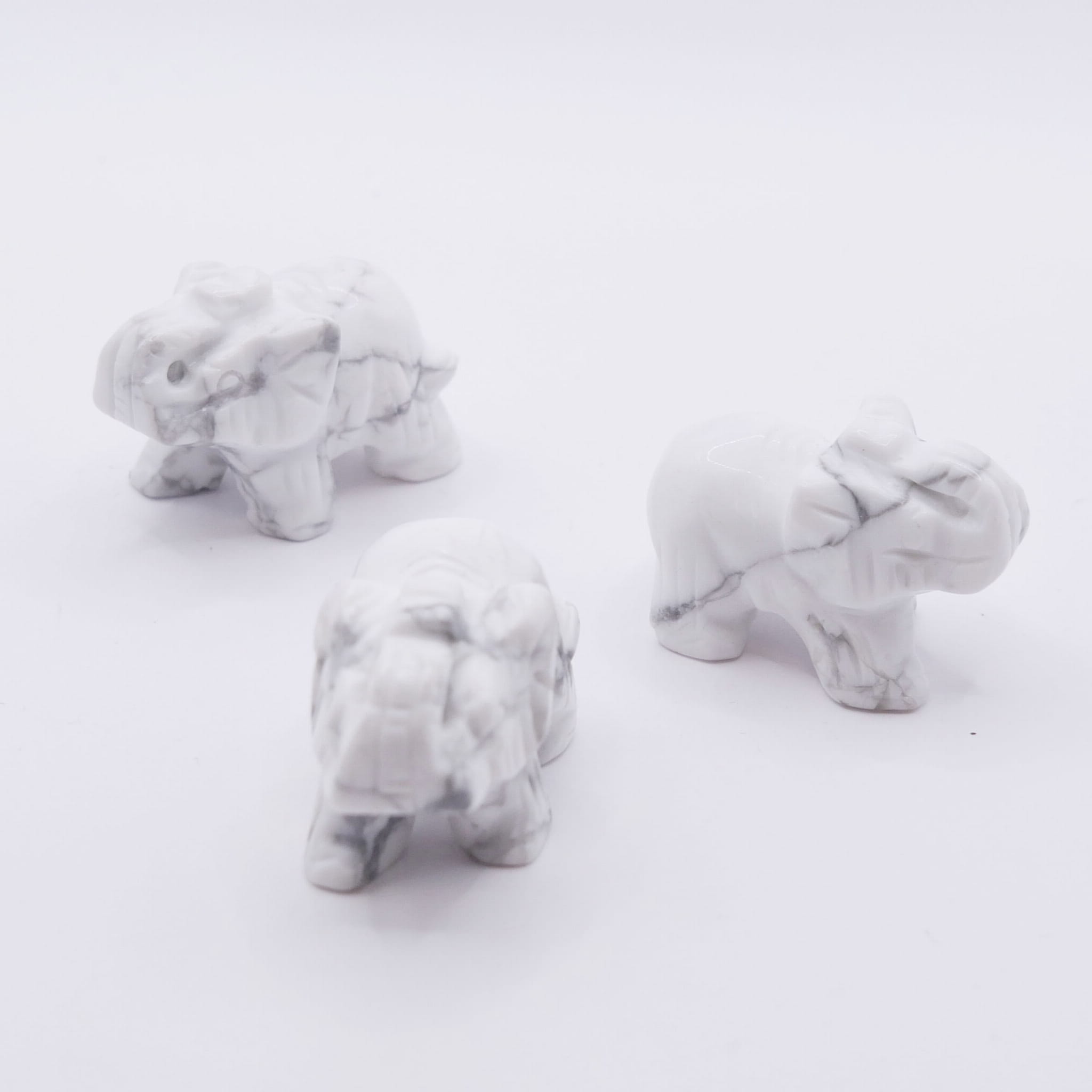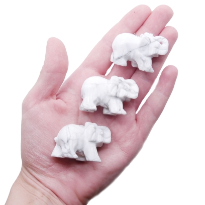 Oferujemy figurki w kształcie słonia, które zostały ręcznie wyrzeźbione z naturalnego howlitu. Każda figurka ma około 40 mm wielkości (w najdłuższym wymiarze) i posiada starannie wypolerowaną, gładką powierzchnię. Polerowanie pięknie eksponuje charakterystyczną dla howlitu białą barwę, którą przecina unikalna sieć szarych lub czarnych żyłek, przypominająca wzór marmuru. Ze względu na naturalną zmienność kamienia i ręczne wykonanie, każda figurka jest unikatowa pod względem układu wzorów i detali rzeźbienia.