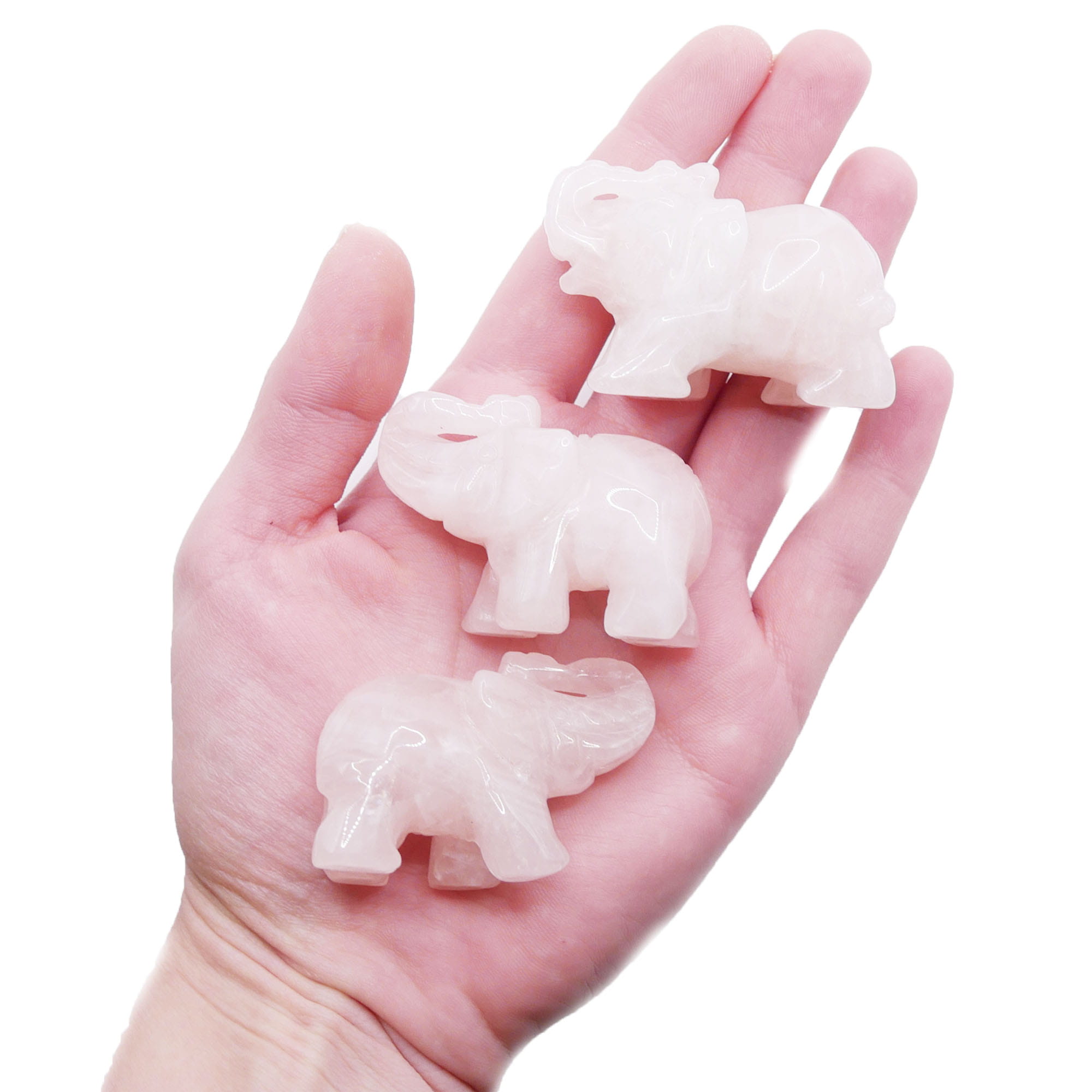 Oferujemy figurki w kształcie słonia, które zostały ręcznie wyrzeźbione z naturalnego kwarcu różowego. Każda figurka mierzy około 50 mm szerokości i posiada gładką, starannie wypolerowaną powierzchnię. Polerowanie pięknie eksponuje charakterystyczny, delikatny różowy odcień oraz subtelną, często mleczną przejrzystość tego kamienia. Naturalne różnice w nasyceniu barwy i strukturze kwarcu, a także ręczne wykonanie, sprawiają, że każda figurka słonia jest unikatowym egzemplarzem.