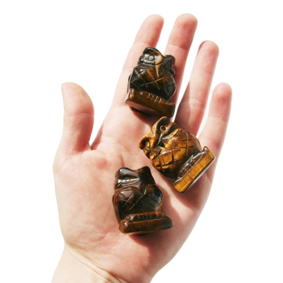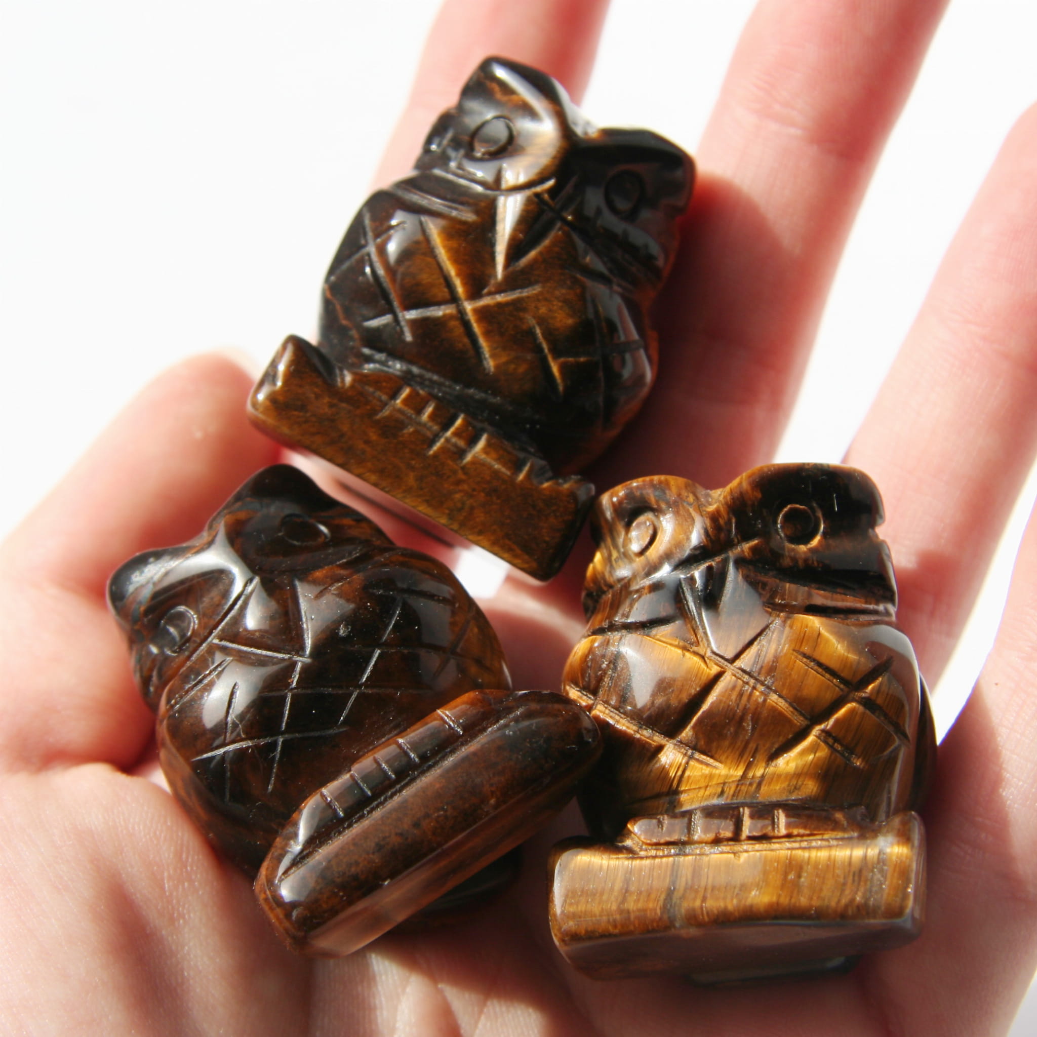 Oferujemy figurki sowy, które zostały ręcznie wyrzeźbione z naturalnego tygrysiego oka. Każda figurka ma około 40 mm wysokości i posiada starannie wypolerowaną powierzchnię, która pięknie eksponuje charakterystyczne dla tego kamienia złocisto-brązowe pasma oraz dynamiczny, jedwabisty połysk (tzw. efekt kociego oka). Unikalny układ pasm i intensywność migotliwości, a także drobne różnice wynikające z ręcznego rzeźbienia detali, sprawiają, że każda sowa jest niepowtarzalnym egzemplarzem.