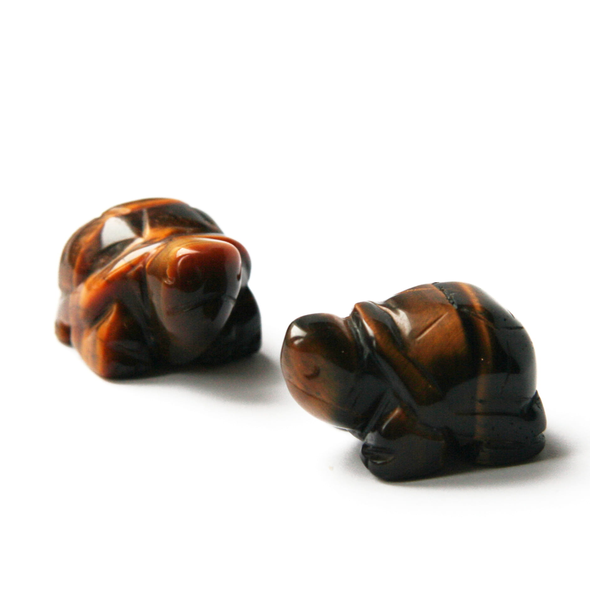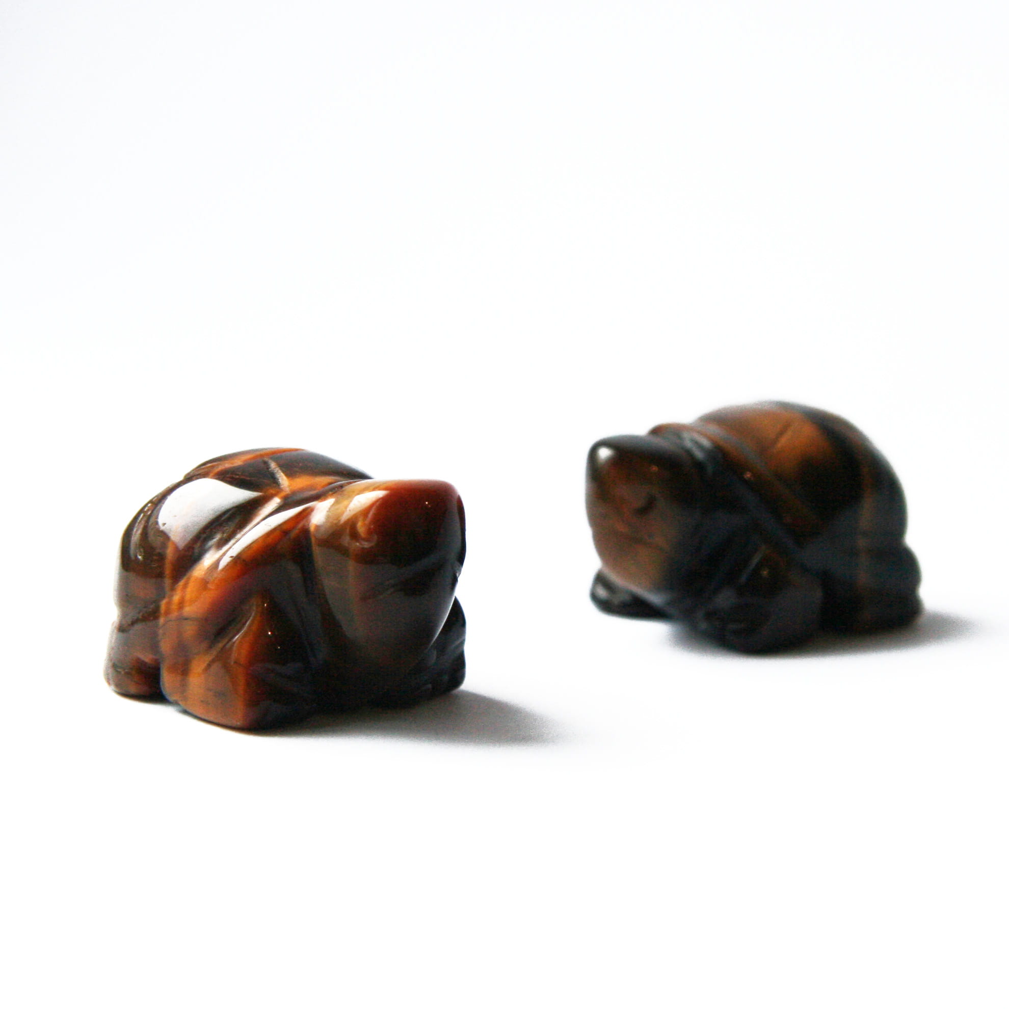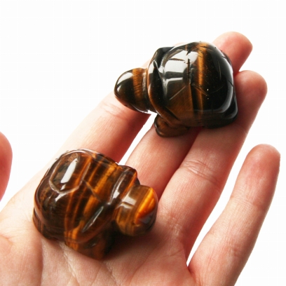 Oferujemy figurki w kształcie żółwia, które zostały ręcznie wyrzeźbione z naturalnego tygrysiego oka. Każda figurka mierzy około 40 mm długości i posiada gładką, starannie wypolerowaną powierzchnię. Polerowanie doskonale eksponuje charakterystyczne dla tygrysiego oka złocisto-brązowe pasma oraz dynamiczny efekt migotliwości (tzw. kocie oko). Unikalny układ wzorów i intensywność połysku w kamieniu, a także ręczne wykonanie, sprawiają, że każdy żółw jest niepowtarzalnym egzemplarzem.