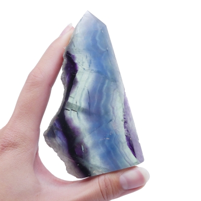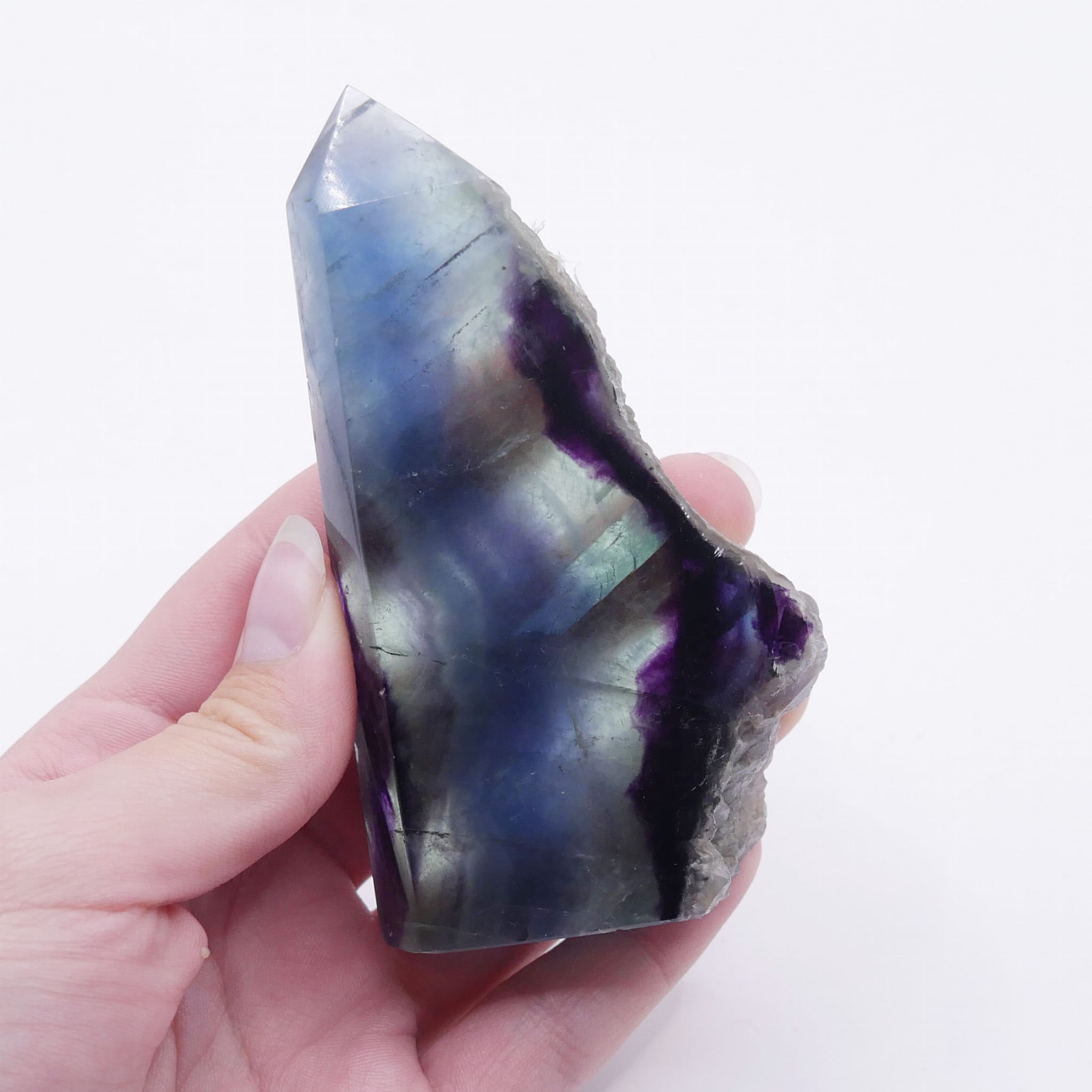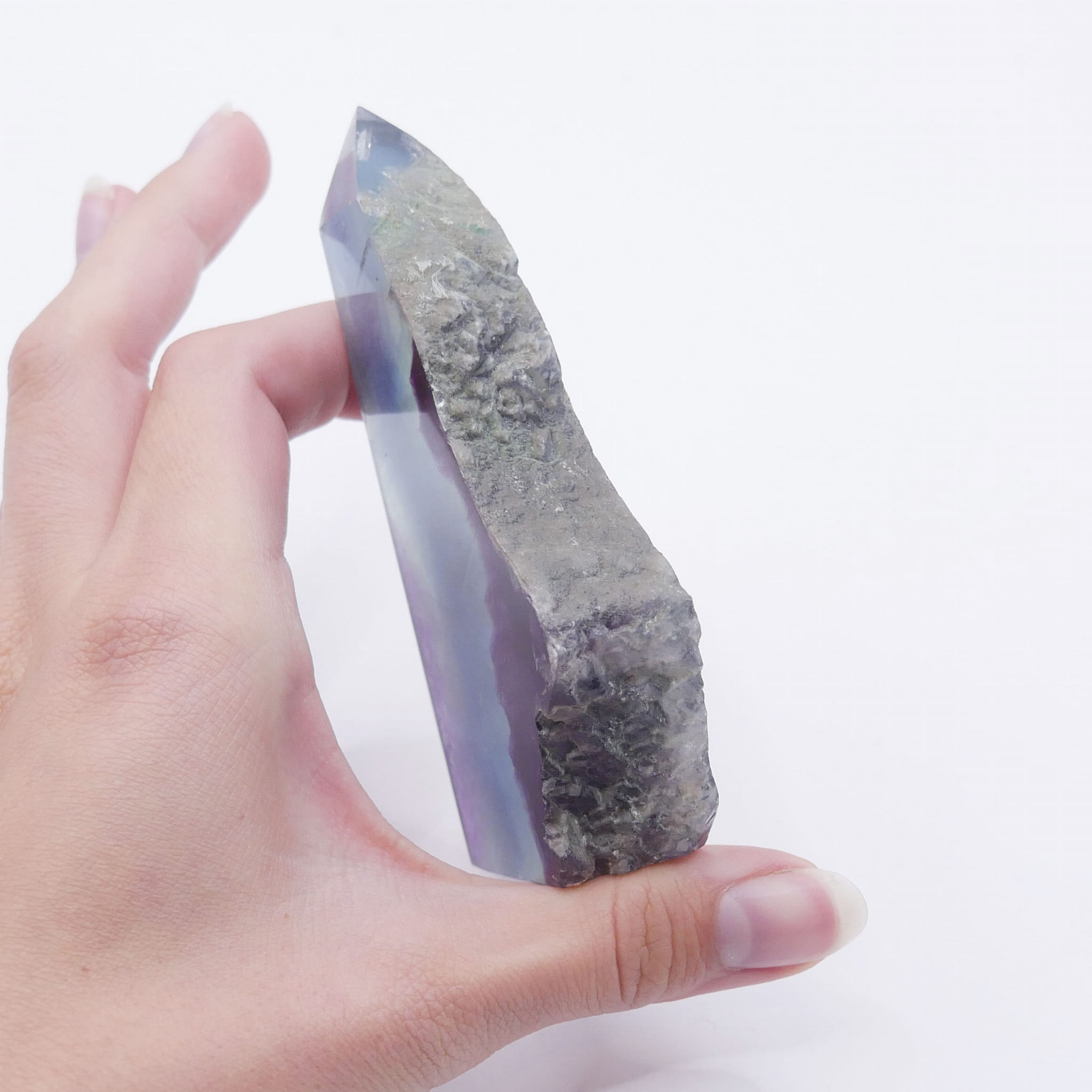 Forma stojąca fluorytu nr 01 zachwyca kontrastem między gładką, polerowaną powierzchnią a surową krawędzią. Polerowanie wydobywa głębię i przejrzystość barw, podczas gdy surowy fragment świadczy o autentyczności i naturalnym pochodzeniu kamienia. Jest to wyjątkowy obiekt kolekcjonerski oraz atrakcyjna, barwna ozdoba, która pięknie prezentuje się na biurku, półce czy parapecie.