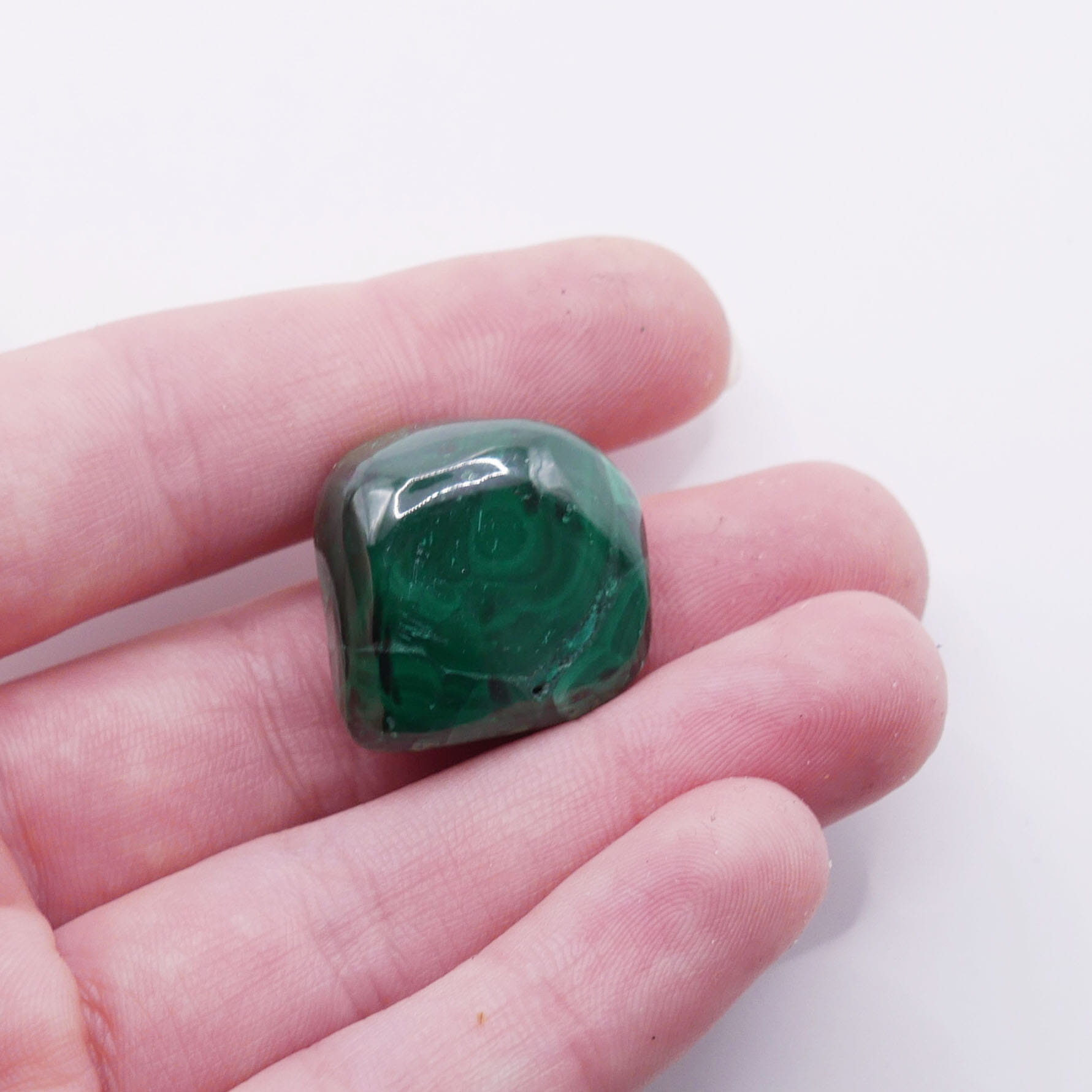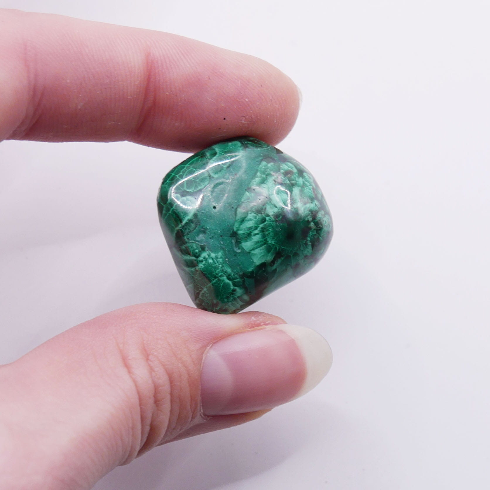 Egzemplarz malachitu oznaczony numerem 031 to naturalny minerał, który w wyniku starannej obróbki bębnowej uzyskał przyjemną, obłą formę. Jego gładka, lśniąca powierzchnia stanowi tło dla wyjątkowej kompozycji zieleni – od żywych, jasnych tonów po głębokie, nasycone barwy. Precyzyjny szlif eksponuje niepowtarzalny układ kontrastowych pasm i naturalnych zdobień, który jest wizytówką tego okazu i gwarantuje jego unikalność.