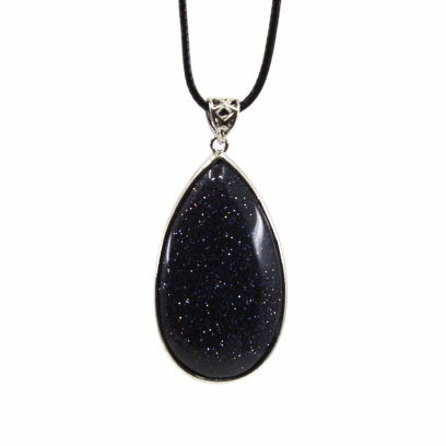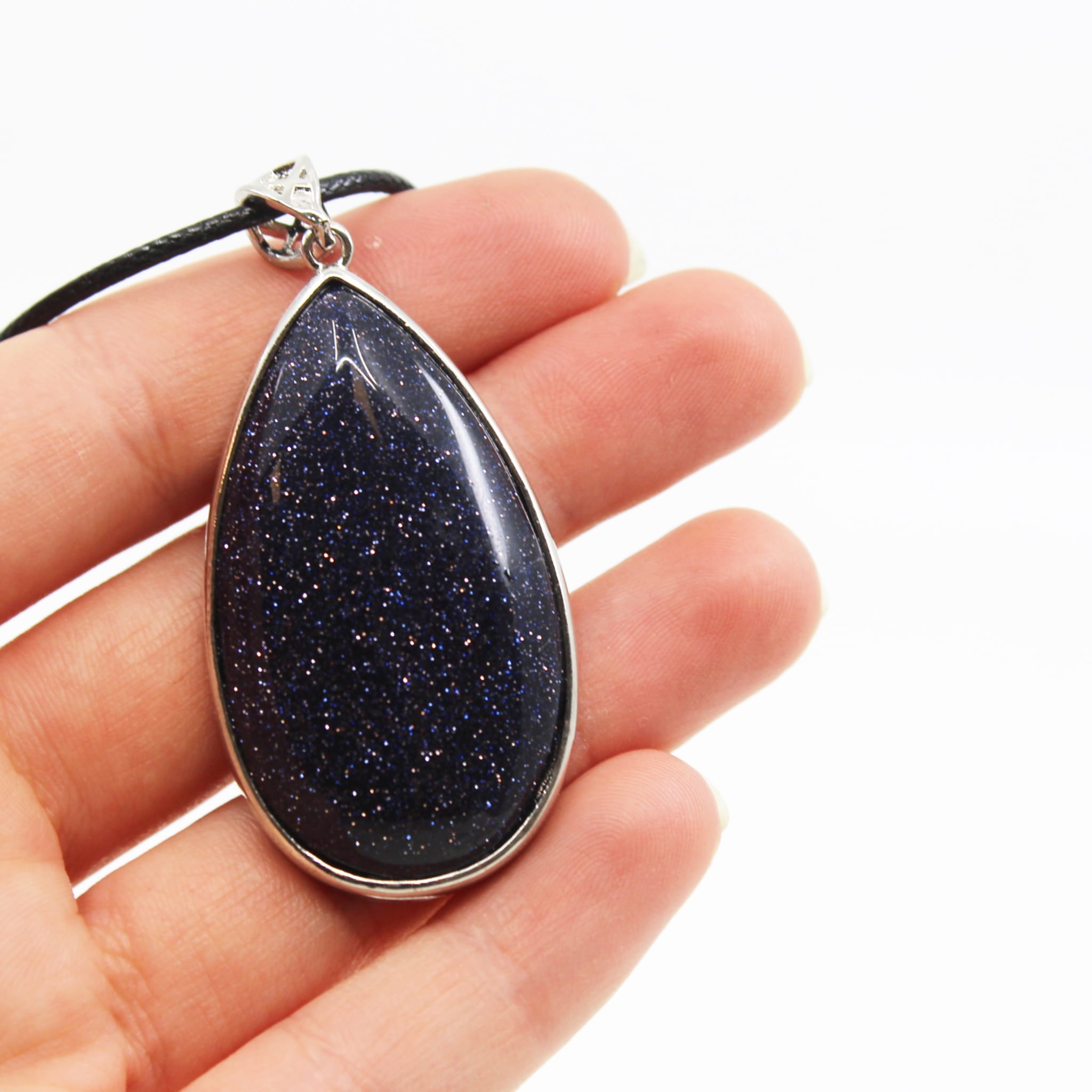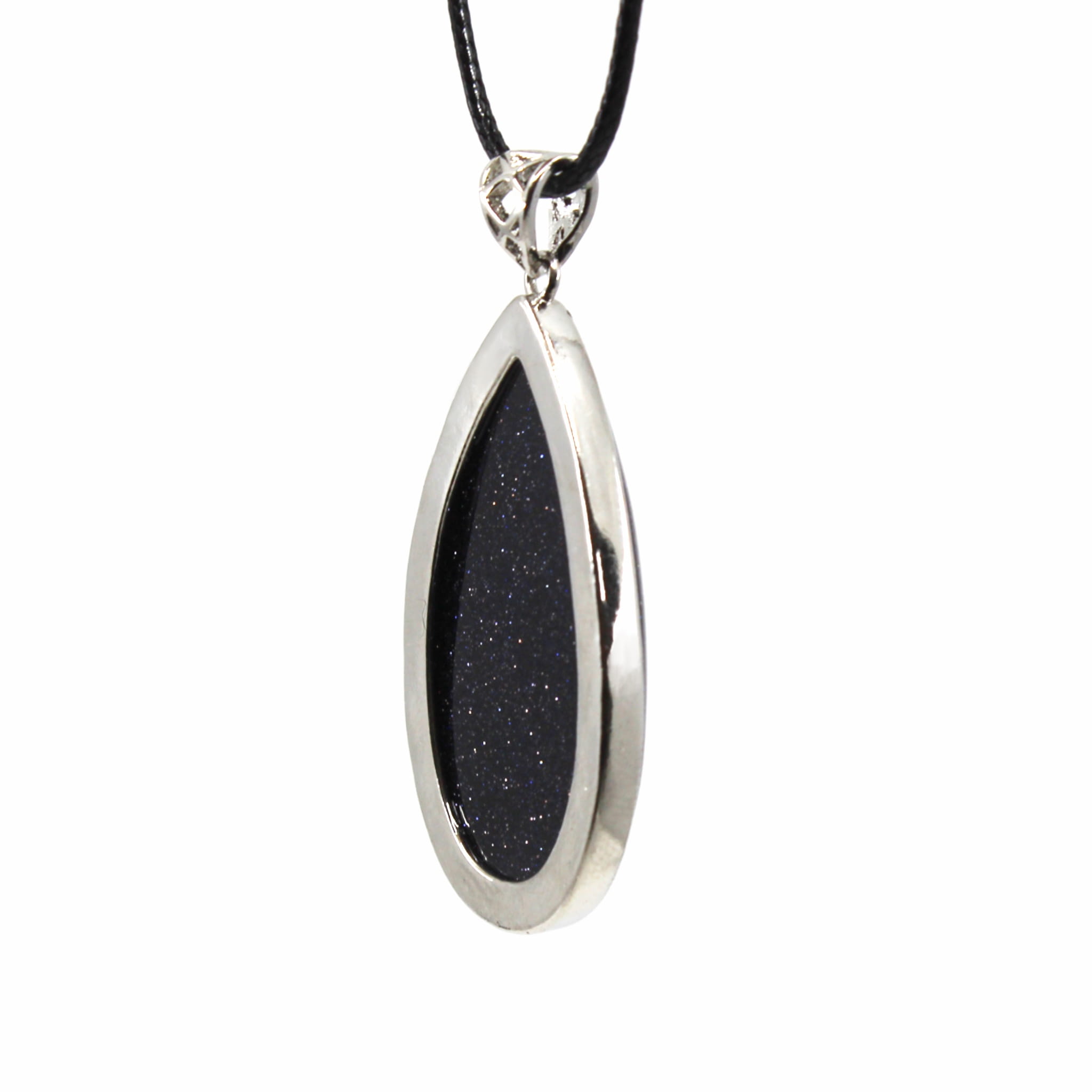 Prezentujemy intrygujący naszyjnik w kształcie łezki, wykonany z Nocy Kairu – efektownego kamienia syntetycznego. Jego cechą charakterystyczną jest głęboka, granatowa (niemal czarna) barwa oraz tysiące błyszczących drobinek zatopionych w masie, które tworzą spektakularny efekt rozgwieżdżonego nieba. Każda polerowana łezka została oprawiona w metalowy stop w kolorze srebrnym. Naszyjnik jest sprzedawany w komplecie z czarnym, woskowanym rzemykiem i zapięciem ze stali chirurgicznej. Rozmieszczenie iskrzących drobinek jest unikalne dla każdego egzemplarza.