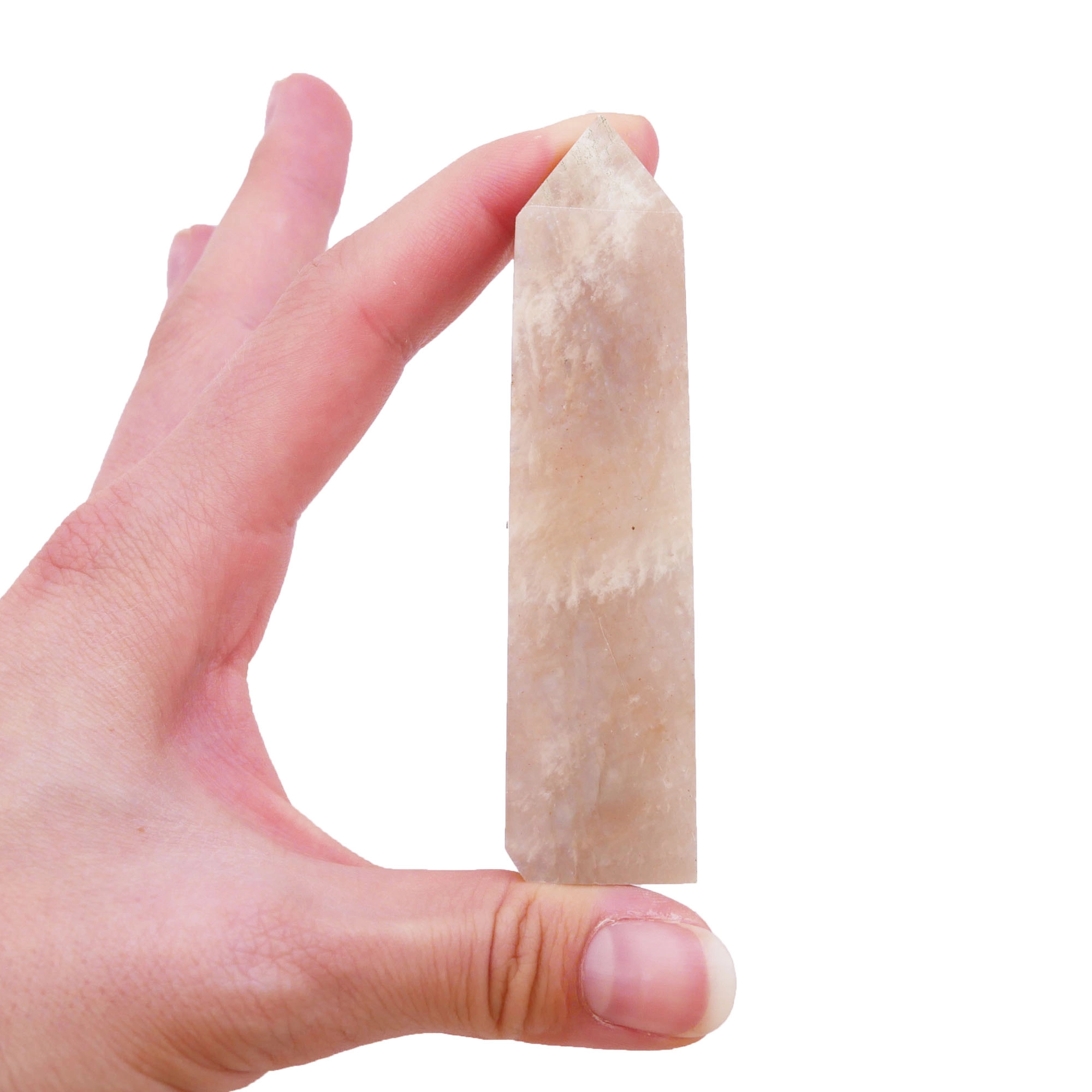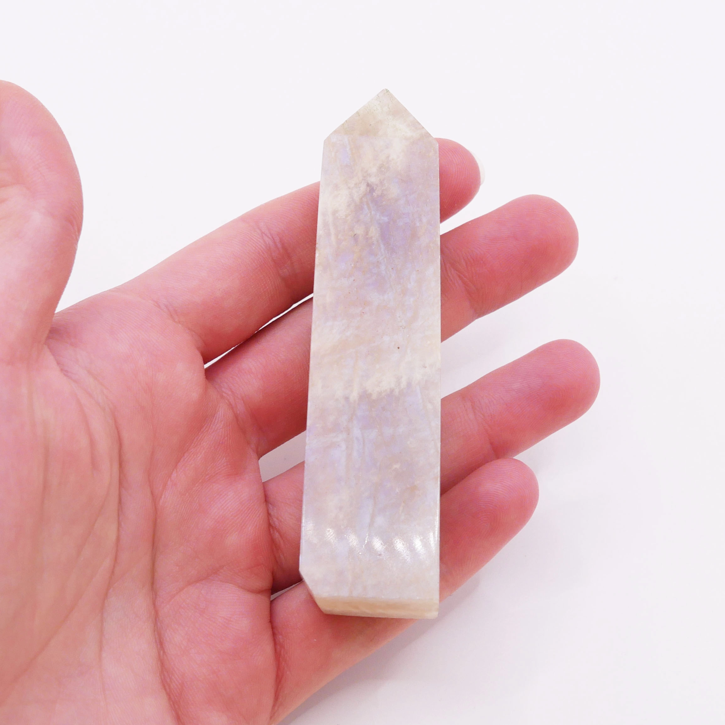 Obelisk z kamienia księżycowego nr 09 to jedyny w swoim rodzaju okaz, precyzyjnie oszlifowany z naturalnego minerału. Posiada klasyczną formę wieży z gładkimi, starannie wypolerowanymi ścianami i ostrym wierzchołkiem. Kamień odznacza się charakterystyczną, perłową, mleczną barwą. Jego powierzchnia, przy odpowiednim oświetleniu, może ukazywać zjawisko adularyzacji – delikatną, srebrzysto-niebieską poświatę. Egzemplarz nr 09 wyróżnia się indywidualną strukturą wewnętrzną, w tym naturalnymi spękaniami i inkluzjami, które nadają mu niepowtarzalny charakter.