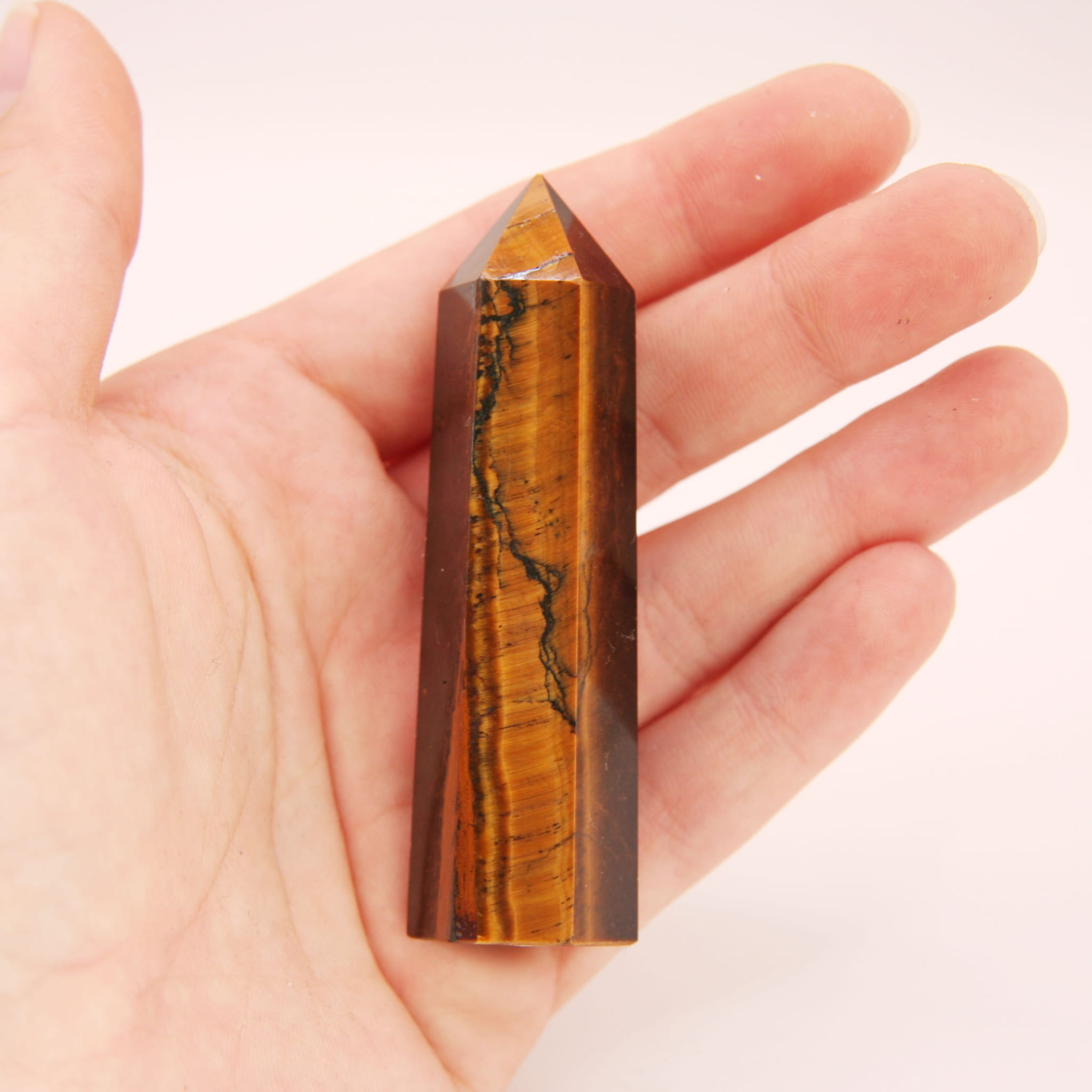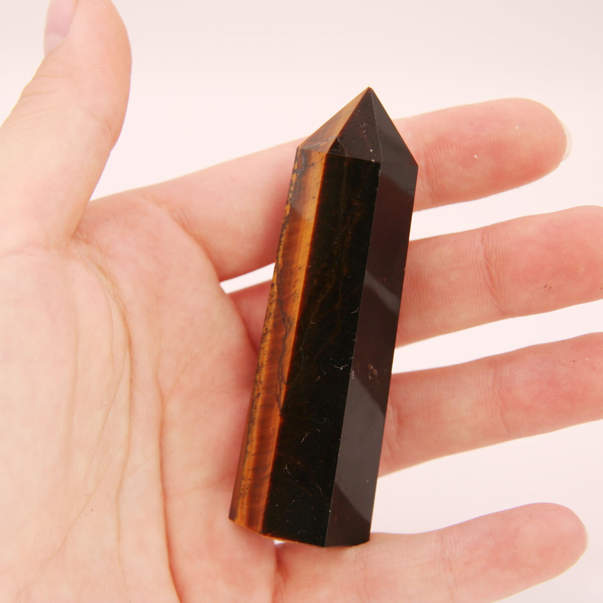 Oferowany unikatowy obelisk został starannie wykonany z naturalnego tygrysiego oka i mierzy około 74 mm wysokości. Posiada klasyczną formę obelisku z polerowanymi fasetami i szpiczastym wierzchołkiem. Wykonany z naturalnego tygrysiego oka, zachwyca złocisto-brązowymi pasmami i charakterystycznym, jedwabistym połyskiem (efektem kociego oka), który 'żyje' w zależności od kąta padania światła. Układ wzorów i intensywność połysku są unikalne dla tego konkretnego egzemplarza.