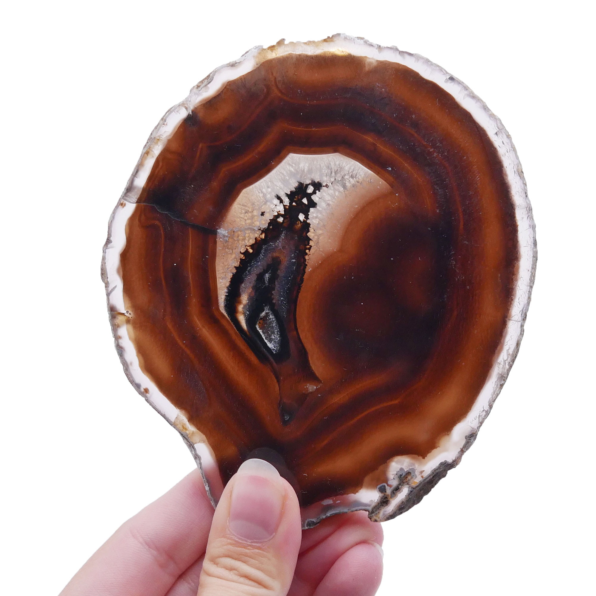 Oferowany unikatowy plaster, oznaczony numerem 060, został wykonany z naturalnego agatu o głębokim, czarnym zabarwieniu. Jest to cienka płytka o nieregularnym kształcie, której obie powierzchnie zostały starannie wypolerowane, nadając im lustrzany połysk i gładkość. Surowe krawędzie podkreślają naturalne pochodzenie kamienia. Mimo dominującej czerni, pod światło można dostrzec subtelne, wewnętrzne struktury typowe dla agatu, które są niepowtarzalne dla tego egzemplarza.