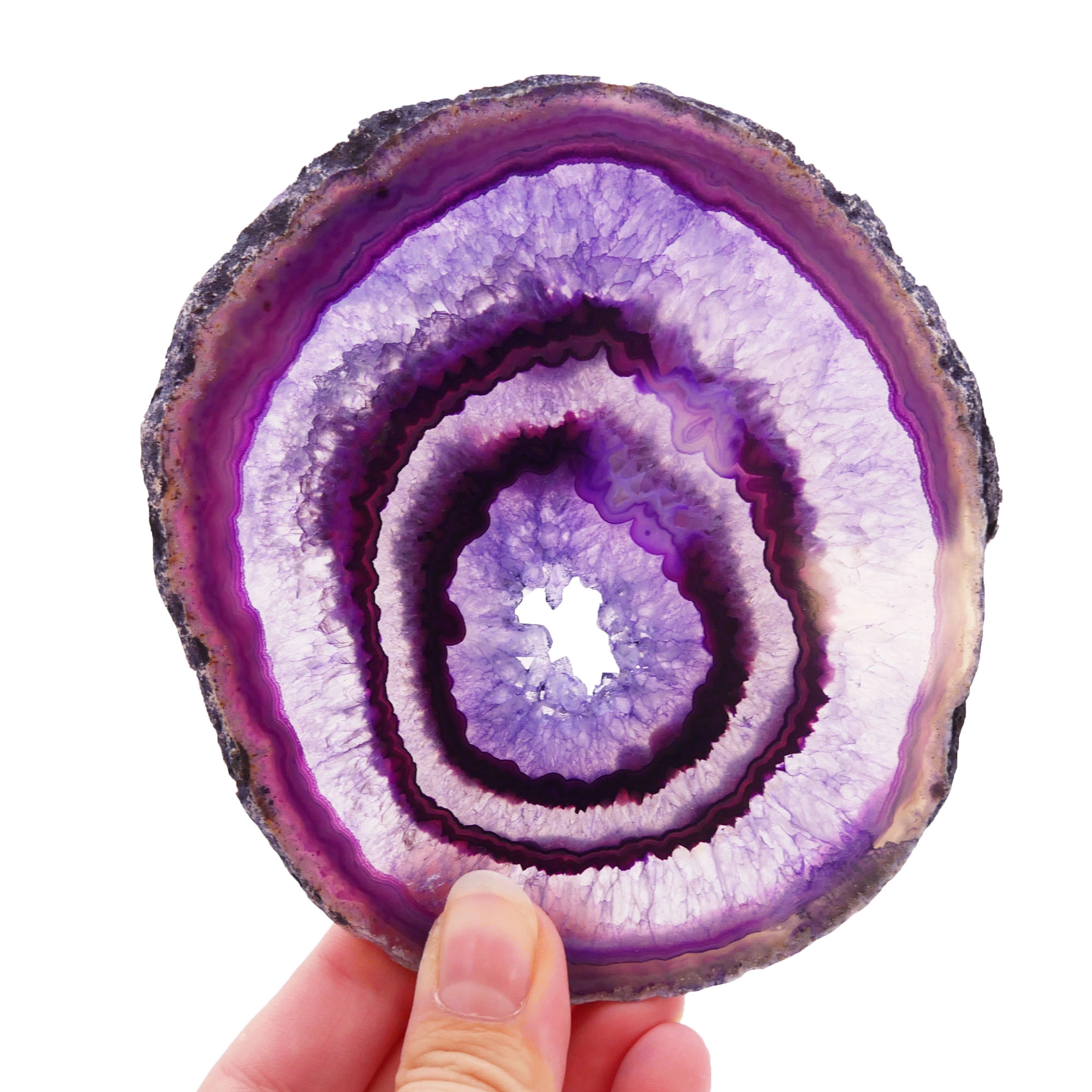 Plaster agatu o numerze 033 to poprzeczny przekrój przez naturalną formację chalcedonu, ukazujący procesy warstwowego osadzania się krzemionki. Okaz ten charakteryzuje się wyraźną strukturą pasmową, w której przenikają się nasycone odcienie fioletu, bieli oraz szarości. W centralnej części plastra znajduje się skupisko krystalicznego kwarcu, stanowiące naturalne jądro bryły. Dzięki mikrokrystalicznej budowie minerał ten wykazuje właściwości translucencji – pod wpływem światła przechodzącego ujawniają się detale wewnętrznych smużeń oraz precyzyjne ułożenie poszczególnych stref mineralnych.