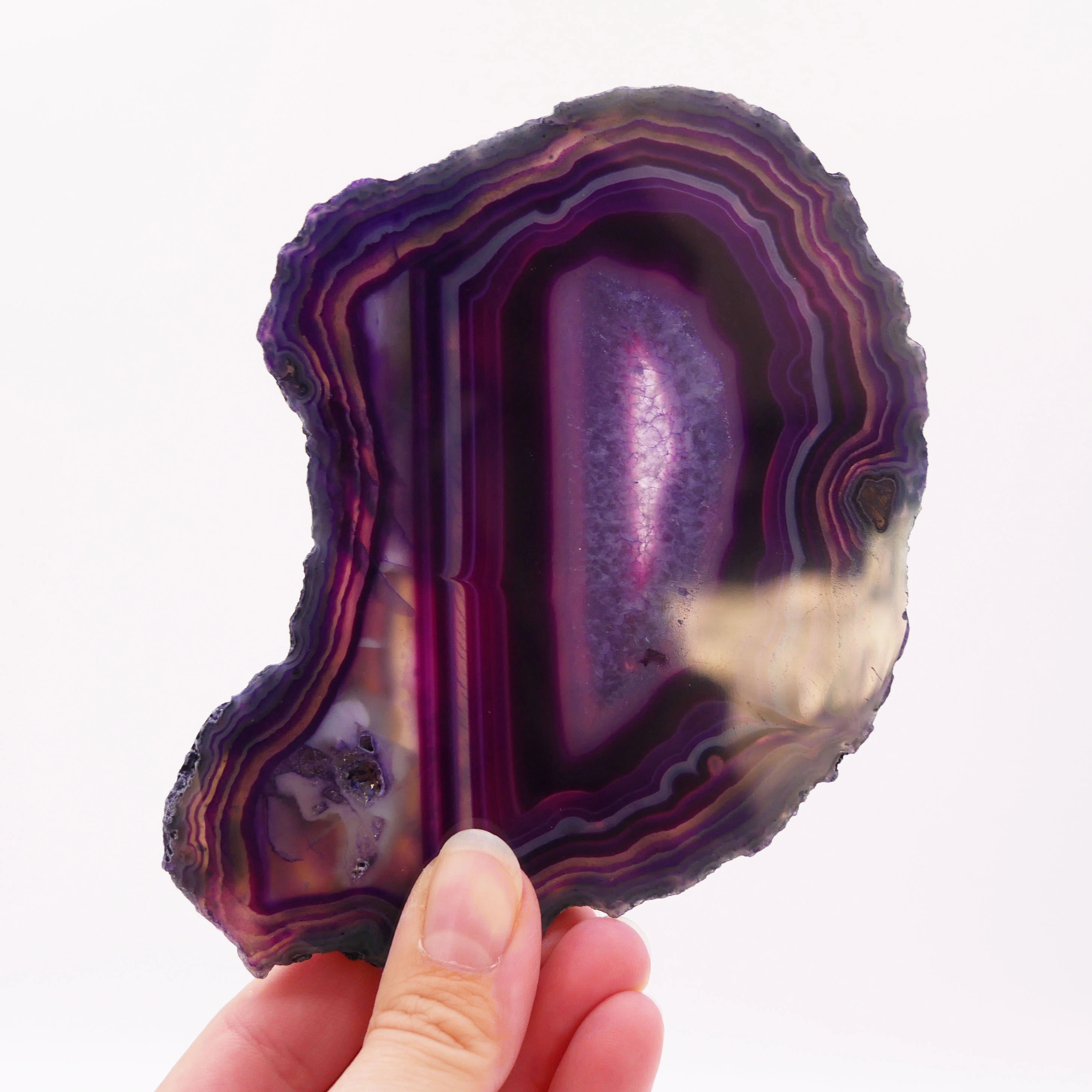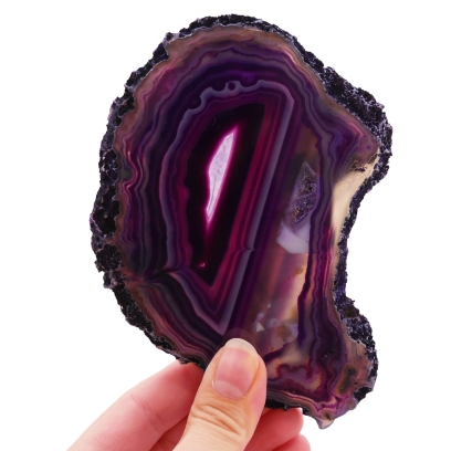 Dzięki dwustronnemu polerowaniu i żywej, fioletowej barwie, ten plaster agatu (nr 042) wspaniale prezentuje się pod światło, ujawniając swoje wewnętrzne piękno i przejrzystość. Może służyć jako elegancka podstawka pod drobne przedmioty, oryginalna ozdoba parapetu lub jako cenny element kolekcji unikatowych agatów. Jego indywidualny wzór stworzony przez naturę czyni go wyjątkowym okazem.