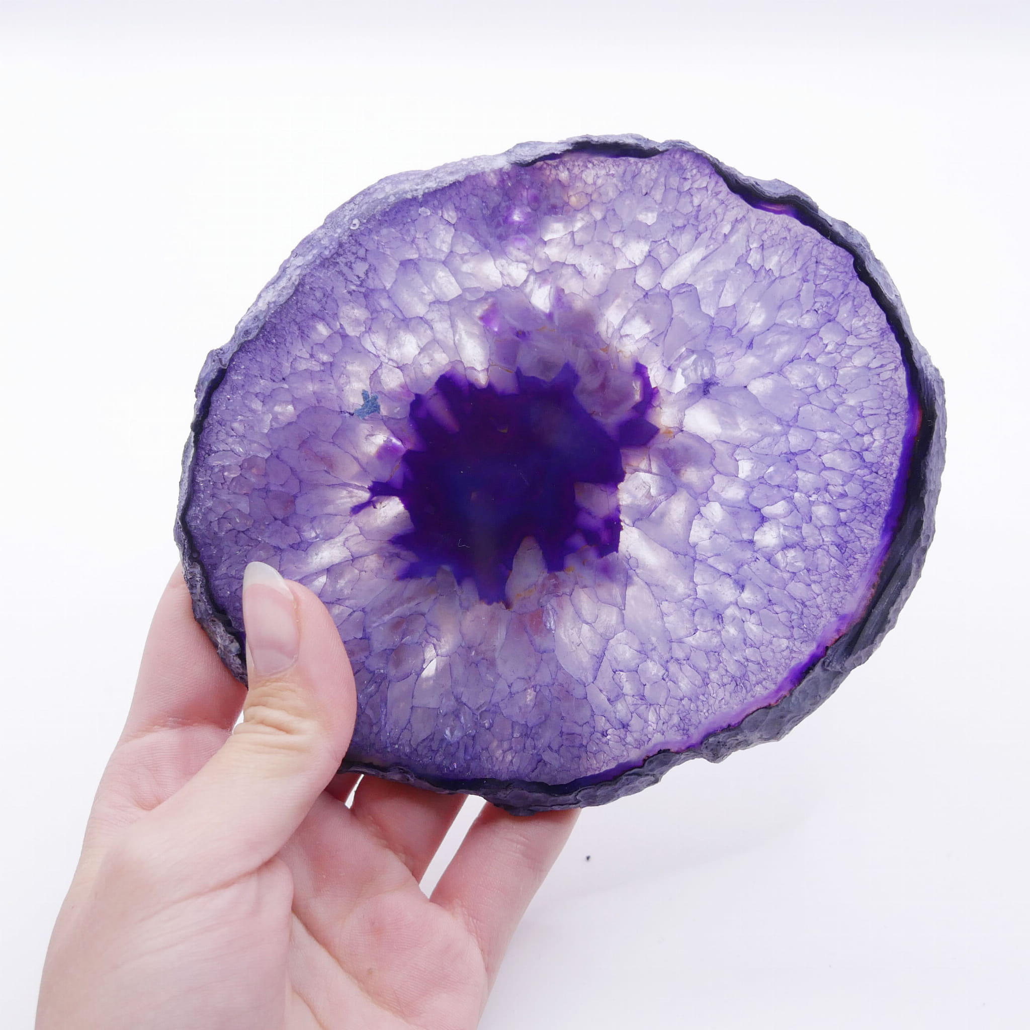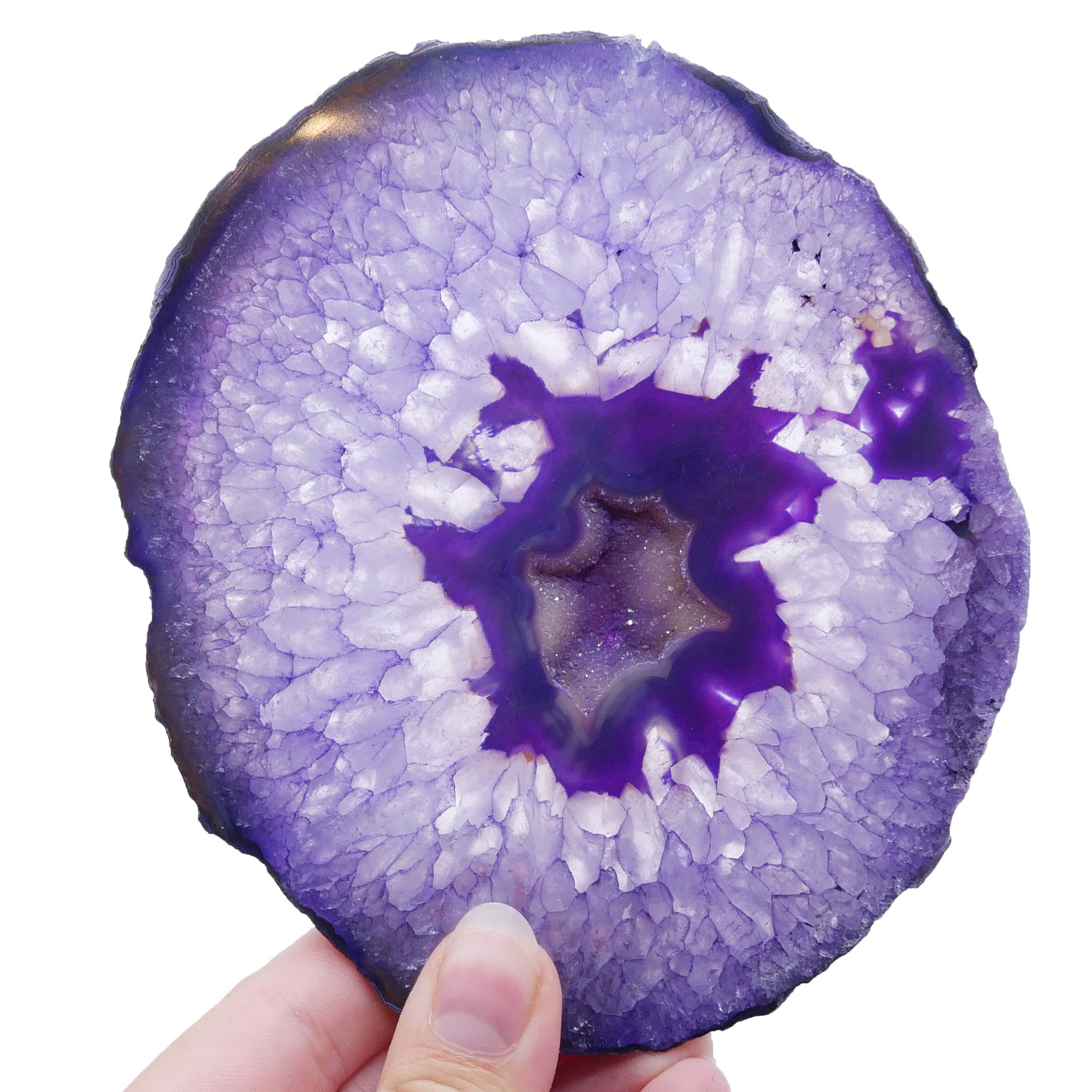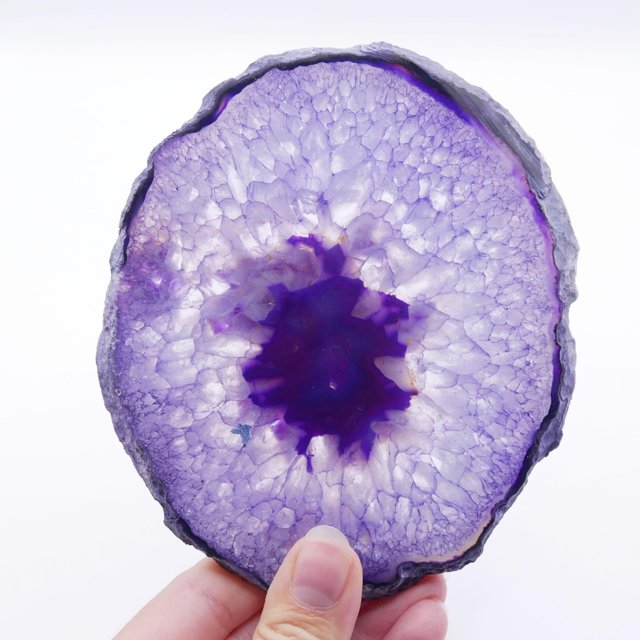 Ten fioletowy plaster agatu (nr 043) posiada ogromny potencjał dekoracyjny, zwłaszcza przy ekspozycji z użyciem światła, które przenikając przez kamień, podkreśla jego głęboką barwę i wewnętrzną strukturę. Może służyć jako luksusowa podstawka, oryginalny element witrażowy lub po prostu jako unikatowy okaz kolekcjonerski, prezentujący indywidualne piękno naturalnego agatu.