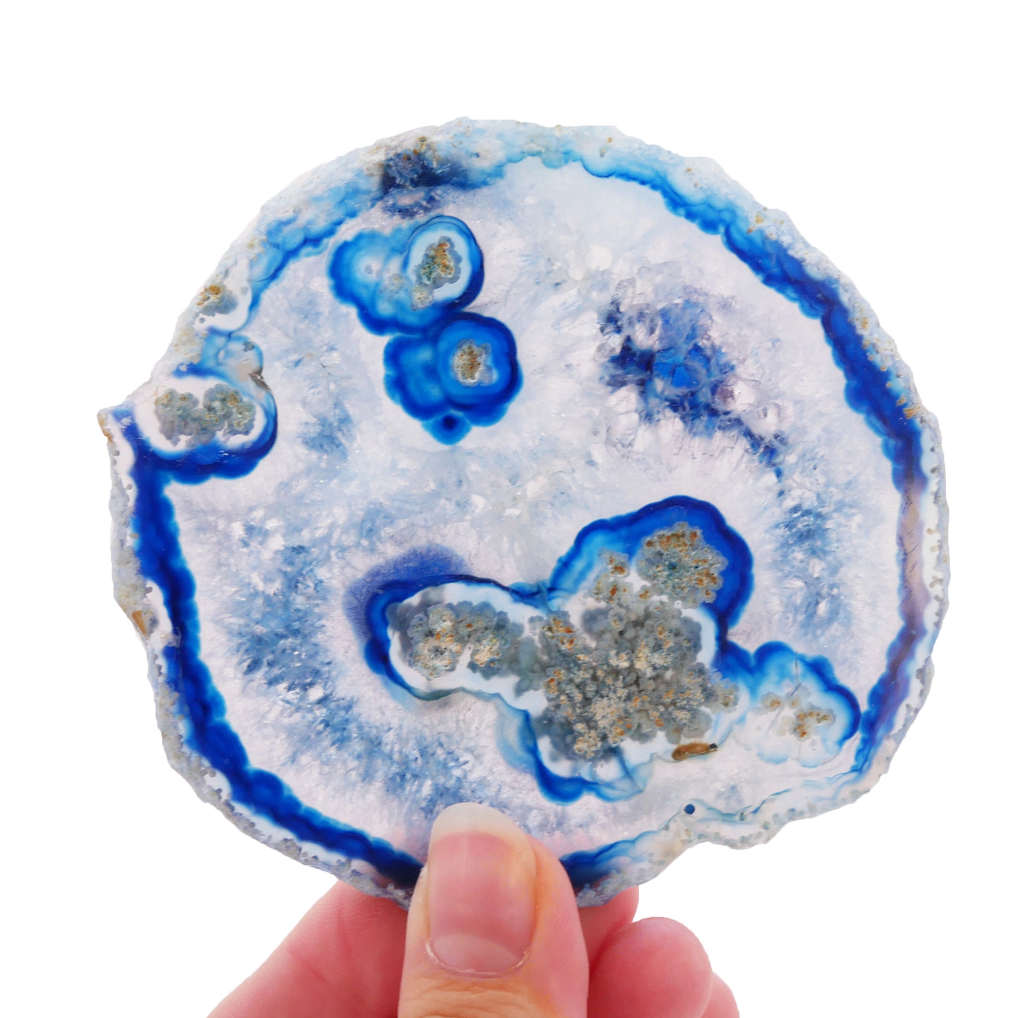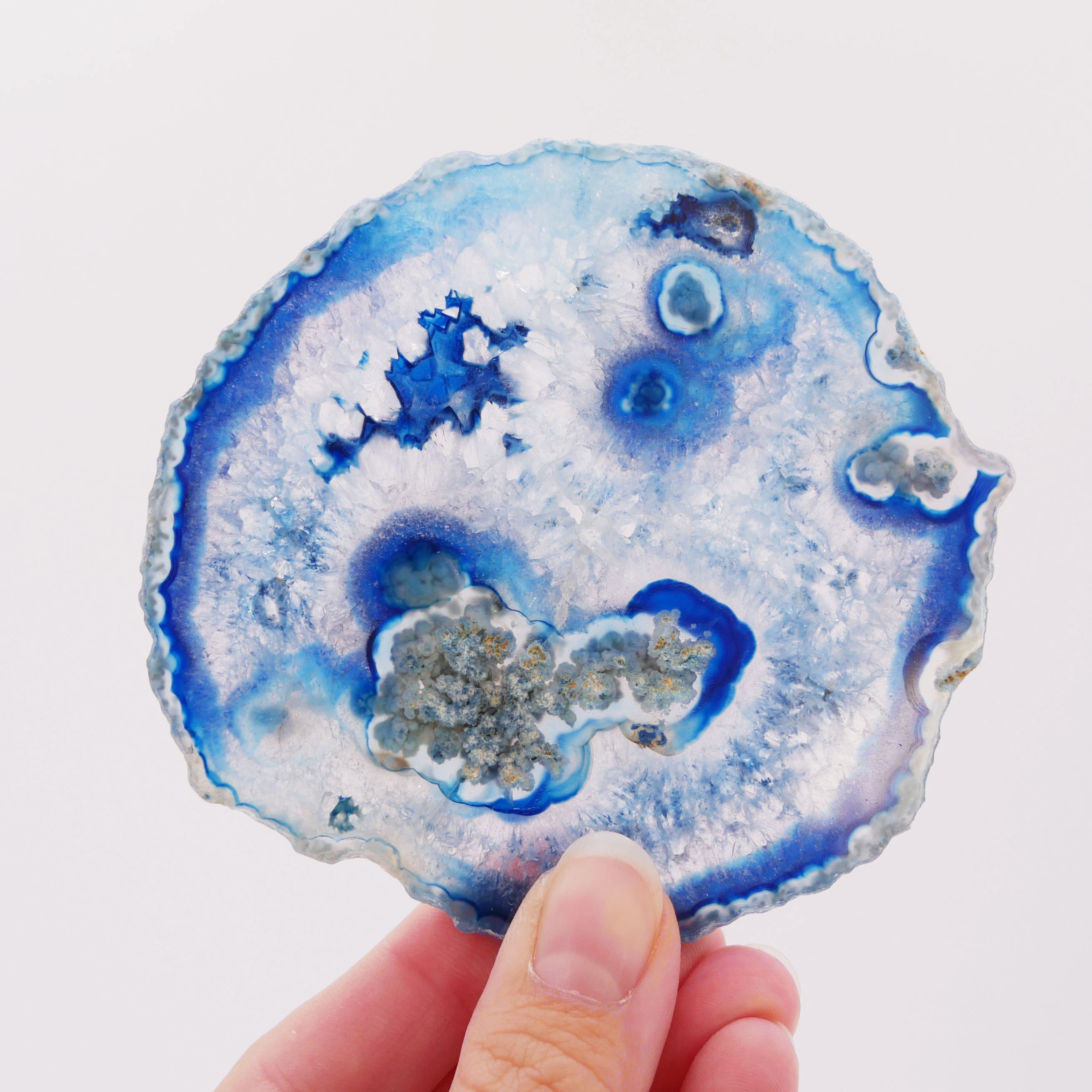 Prezentowany egzemplarz oznaczony numerem 039 to wyjątkowy plaster naturalnego agatu, który urzeka intensywnym, niebieskim zabarwieniem. Jest to cienka płytka o nieregularnym kształcie, której obie płaskie powierzchnie zostały starannie wypolerowane, uzyskując idealną gładkość i szklisty połysk. Zewnętrzna krawędź pozostała surowa, tworząc naturalną, kamienną ramę dla barwnego wnętrza. Polerowanie eksponuje właściwy tylko temu okazowi (nr 039) system pasm i cieniowań w różnorodnych odcieniach błękitu.