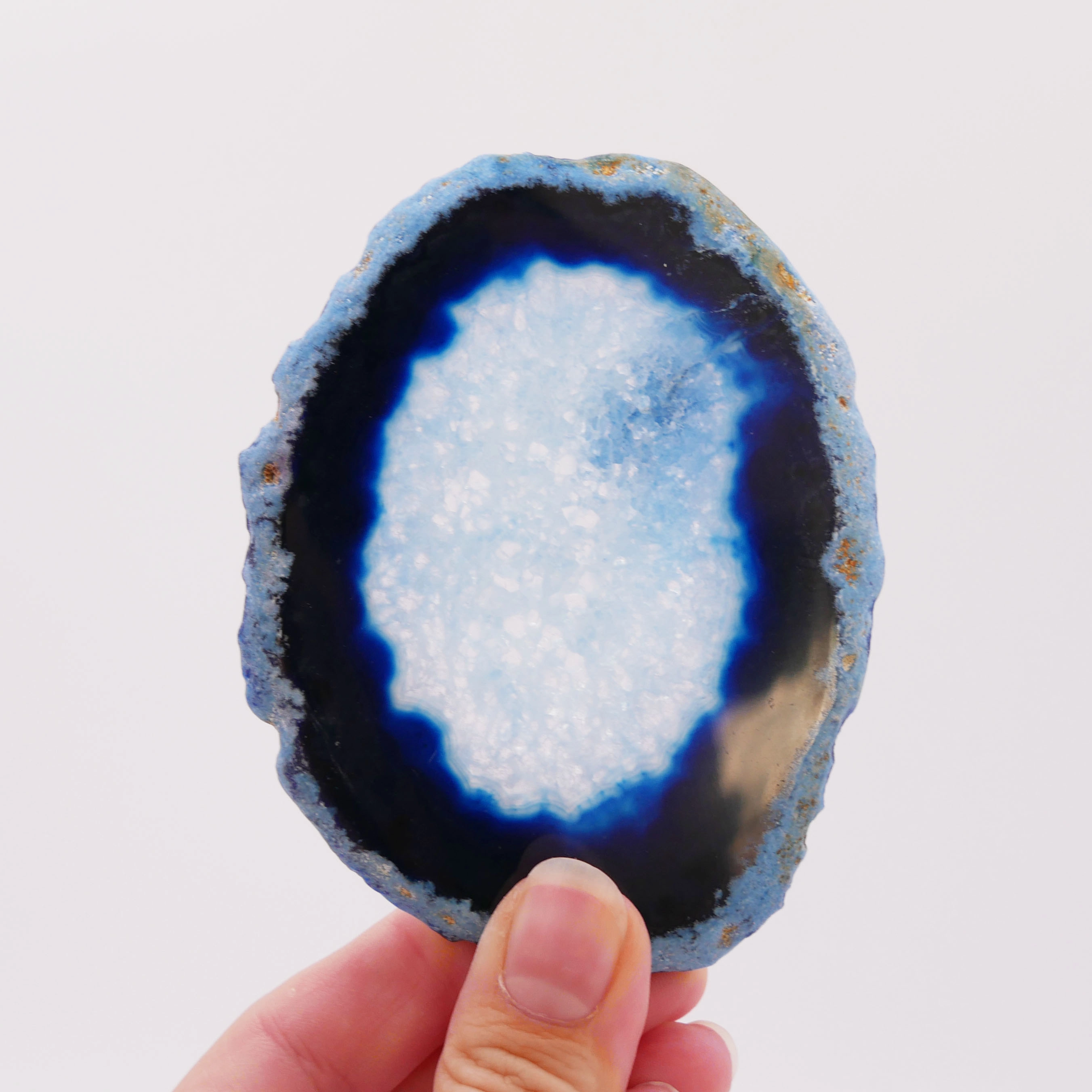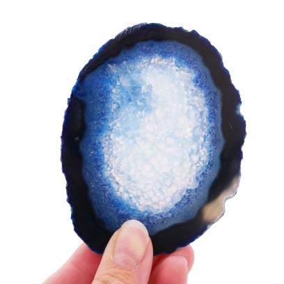 Plaster agatu o numerze 040 to poprzeczny przekrój przez naturalną bułę mineralną, ukazujący procesy krystalizacji chalcedonu. Charakterystyczne dla tego okazu są koncentryczne pasma w odcieniach błękitu, szarości i bieli, które układają się w regularne, faliste wzory. W centralnej części plastra widoczne jest krystaliczne wypełnienie kwarcu, co jest typowe dla formowania się geod. Dzięki mikrokrystalicznej budowie, kamień wykazuje właściwości translucencji, co pozwala na obserwację uwarstwień wewnątrz bryły, zwłaszcza przy ekspozycji pod światło.