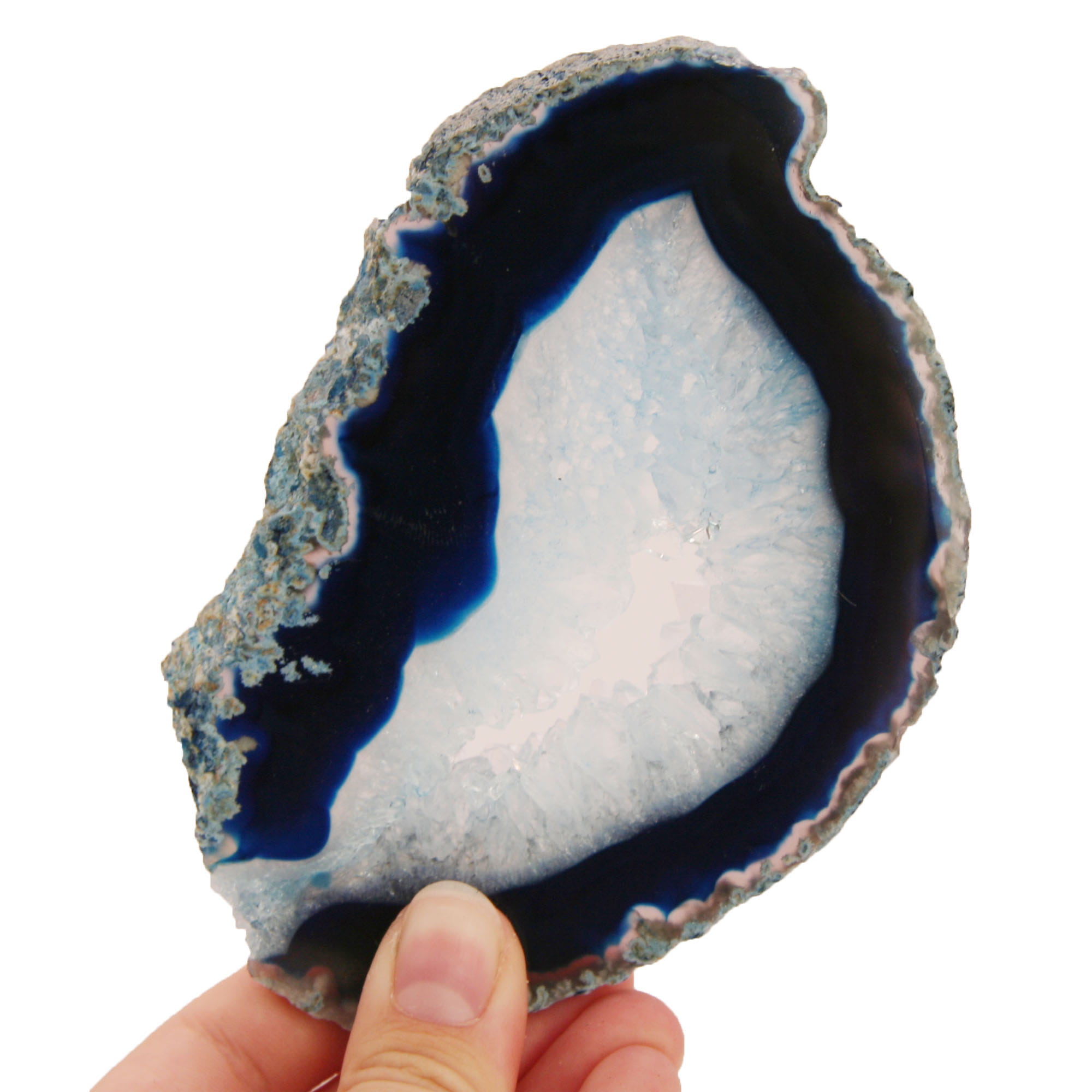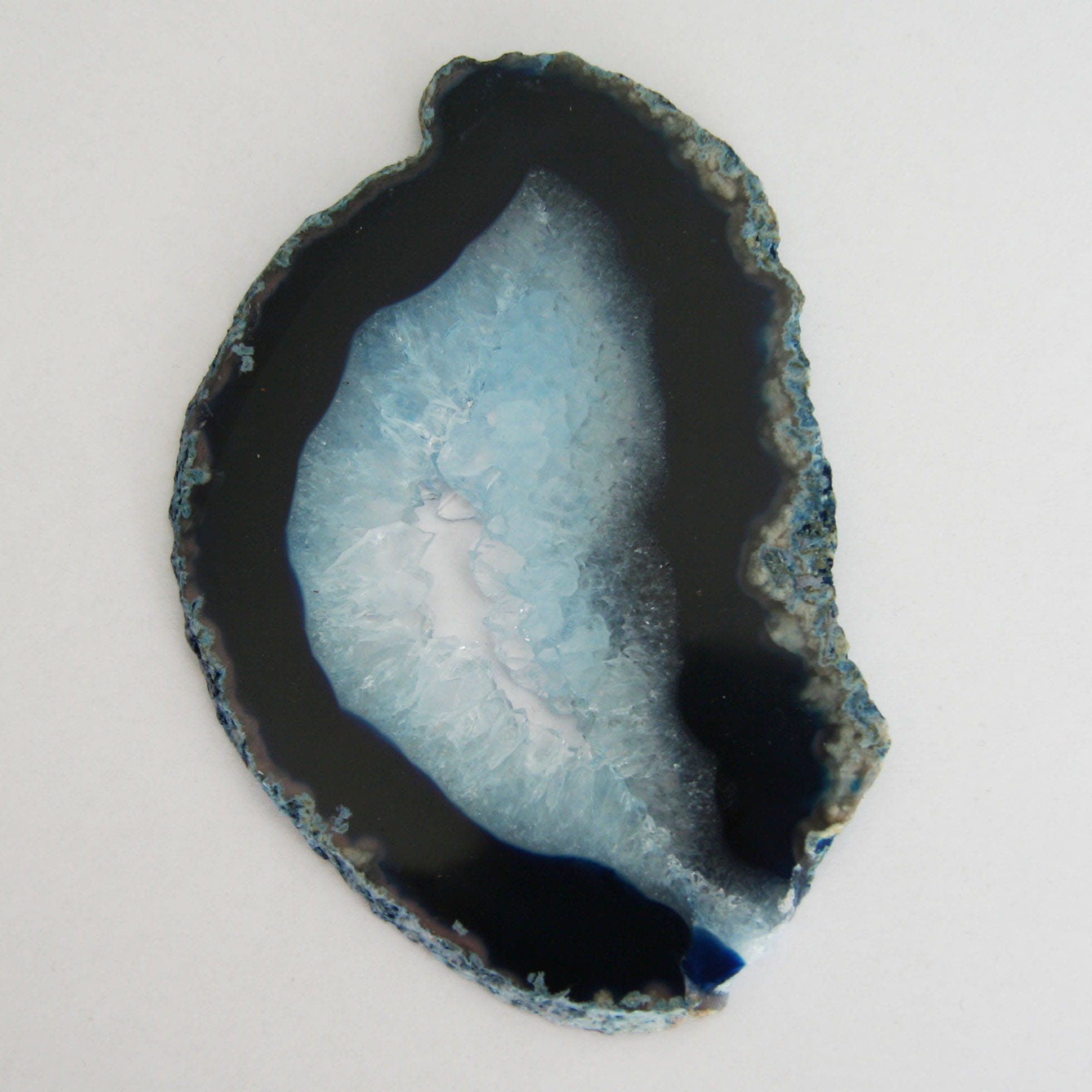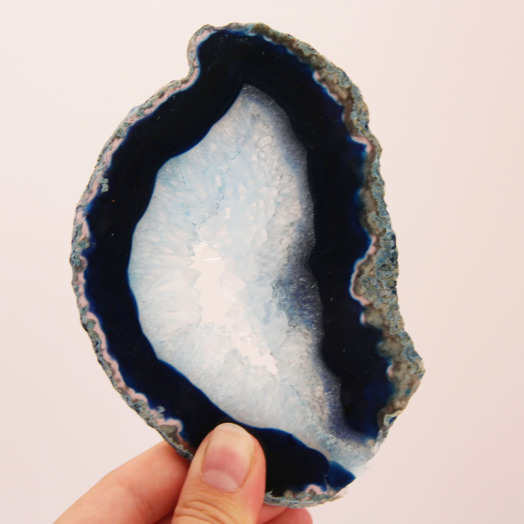 Oferowany plaster agatu, oznaczony numerem 044, jest niepowtarzalnym okazem naturalnego minerału. Jest to cienki plaster wycięty z agatu, wyróżniający się żywym, niebieskim kolorem. Obie powierzchnie zostały starannie wypolerowane, nadając im wysoki połysk i idealną gładkość. Polerowanie eksponuje charakterystyczny dla tego egzemplarza (nr 044), indywidualny układ pasm i struktur w różnych odcieniach błękitu, widocznych dzięki dobrej przejrzystości kamienia.