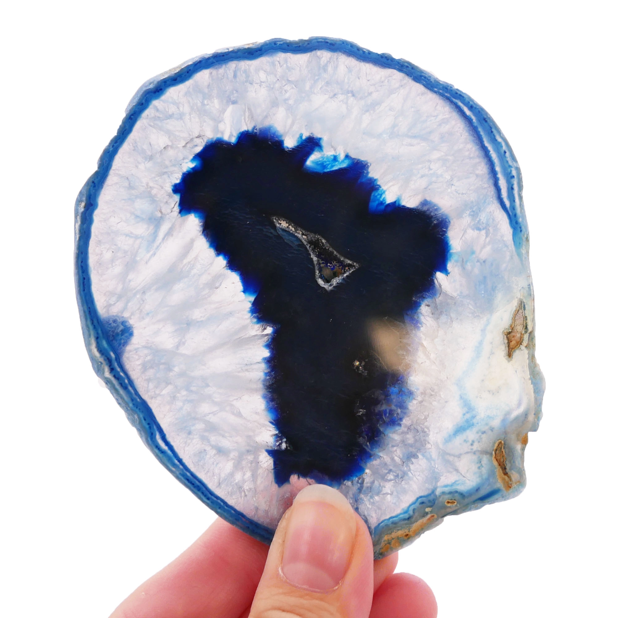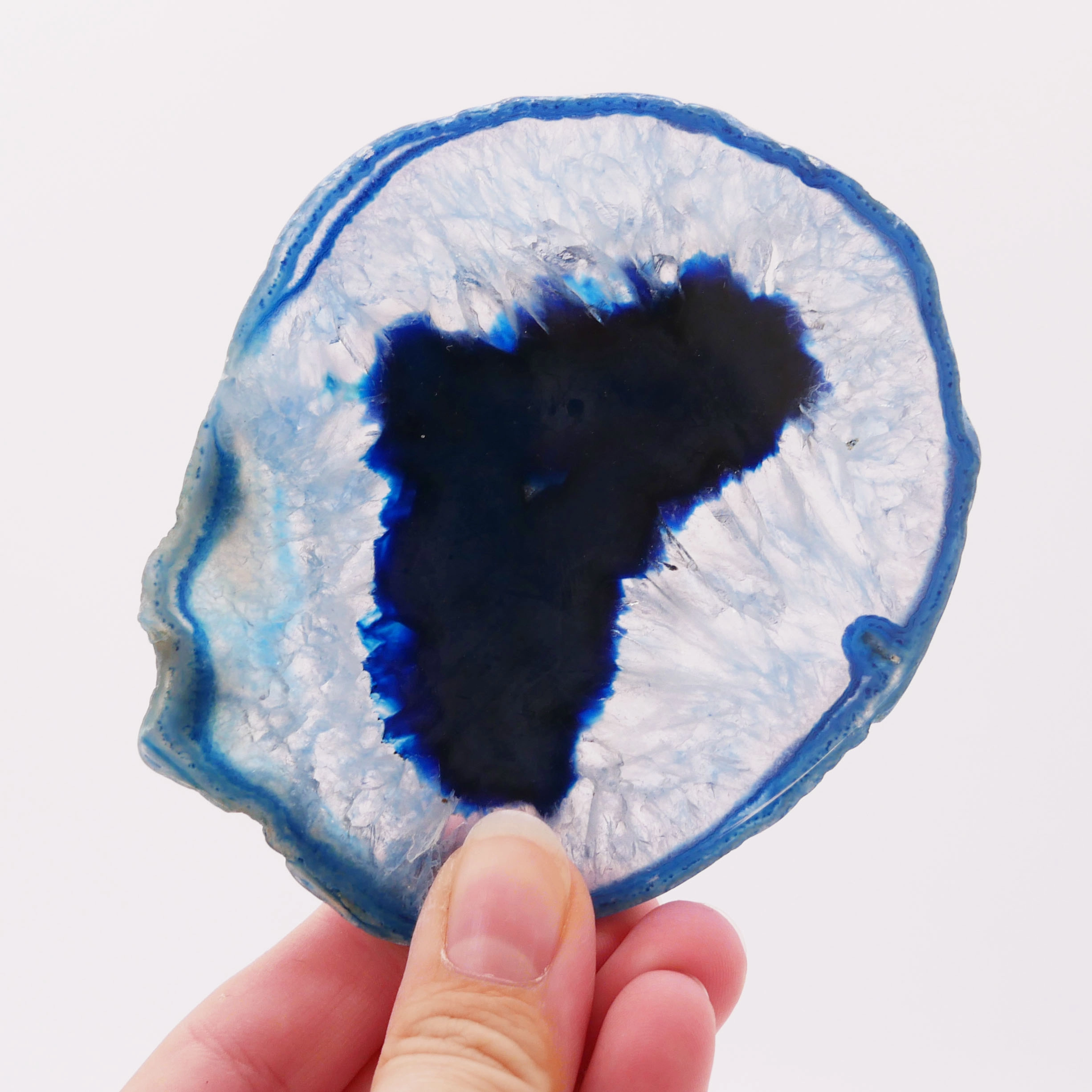 Prezentowany okaz oznaczony numerem 067 to niepowtarzalny plaster naturalnego agatu, wyróżniający się głębokim, morskim odcieniem błękitu. Jest to cienka płytka wycięta z bryły, której obie płaskie strony zostały wypolerowane na wysoki połysk, co nadało im taflę przypominającą szkło. Zewnętrzna krawędź zachowała swoją pierwotną, surową fakturę, stanowiąc naturalne obramowanie. Polerowanie wydobywa indywidualny dla tego egzemplarza (nr 067) rysunek warstw, tworzących hipnotyzujące kręgi i linie.