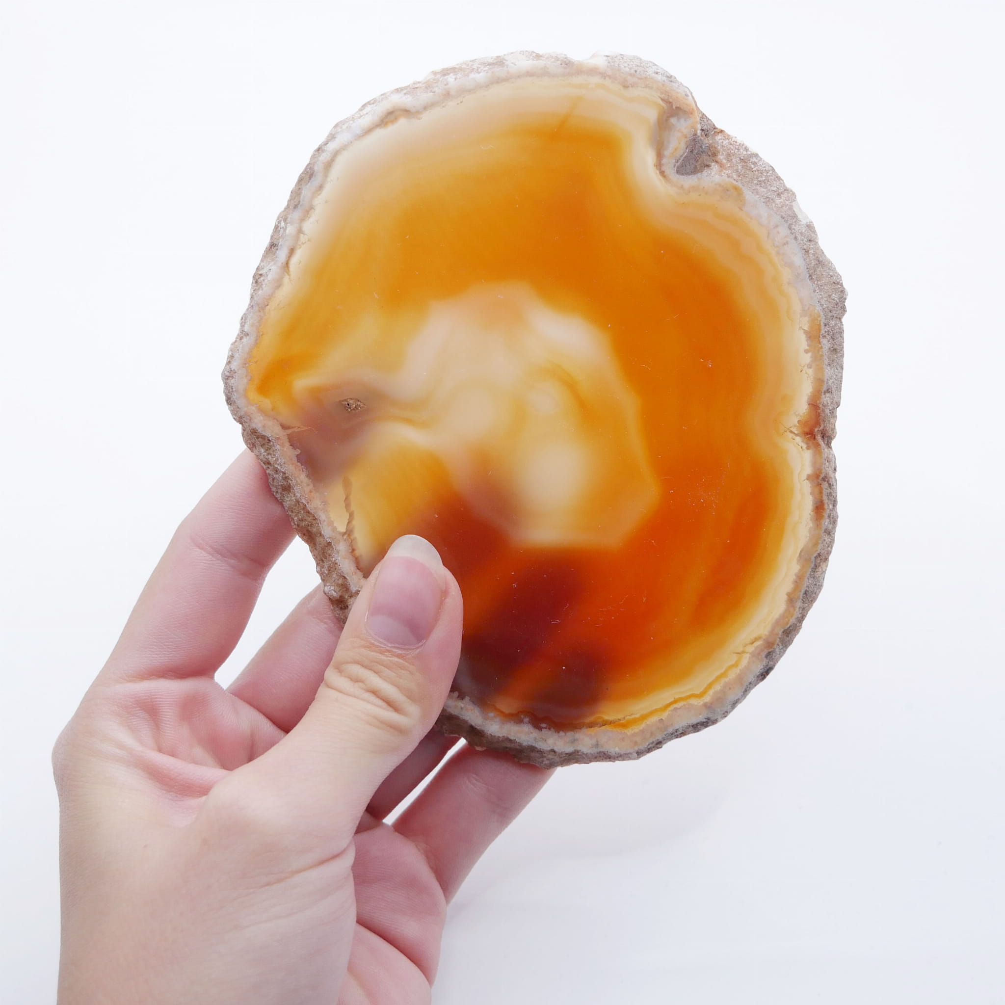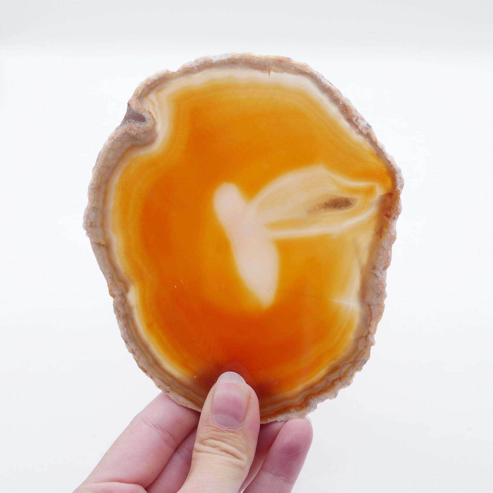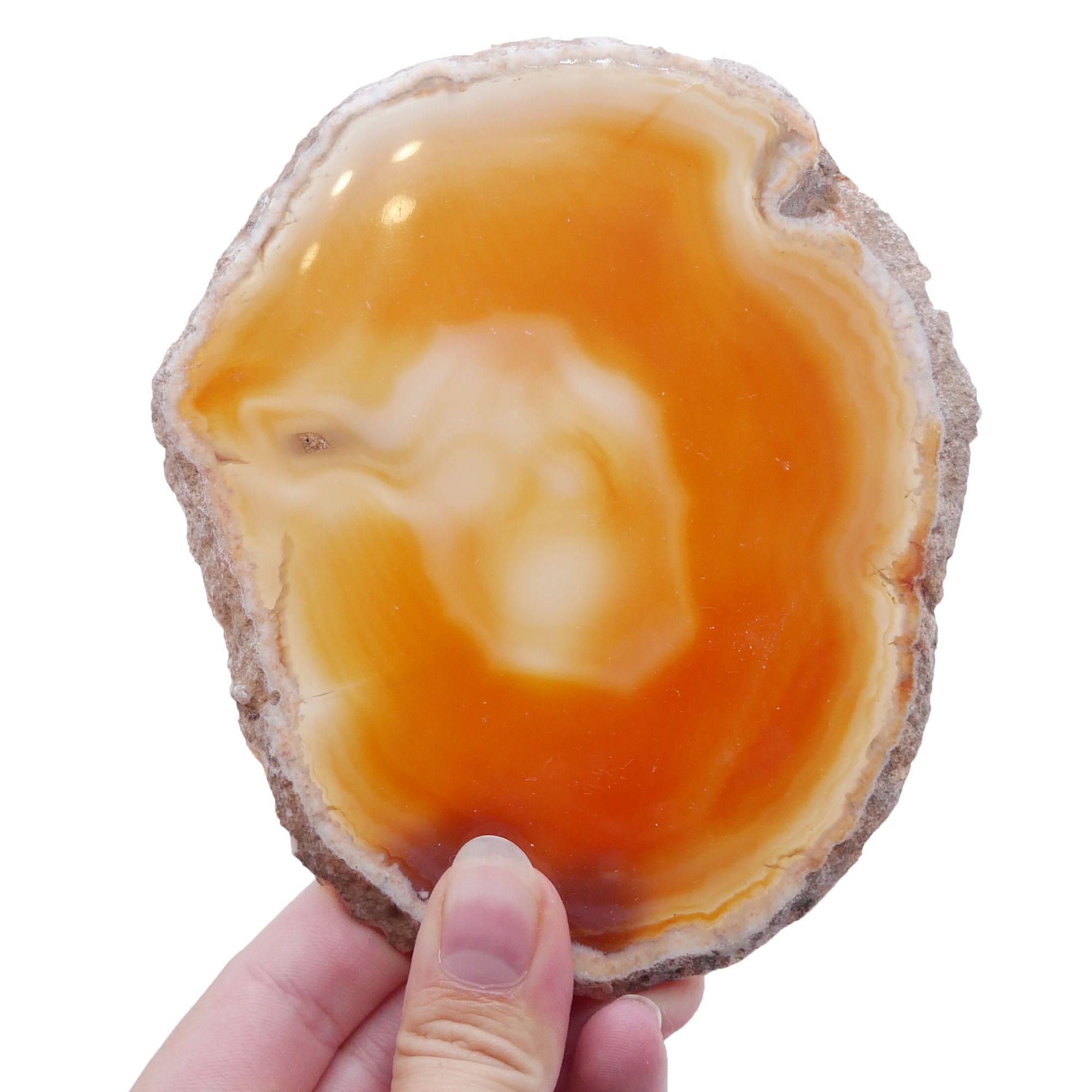 Ten pomarańczowy plaster agatu (nr 055) posiada dużą wartość jako unikatowy obiekt naturalny i dekoracyjny akcent. Jego indywidualny wzór stworzony przez naturę czyni go idealnym jako cenny okaz kolekcjonerski, elegancka podstawka o ciepłej barwie lub element dekoracyjny, który pięknie rozprasza światło, wnosząc do wnętrza energię i optymizm.