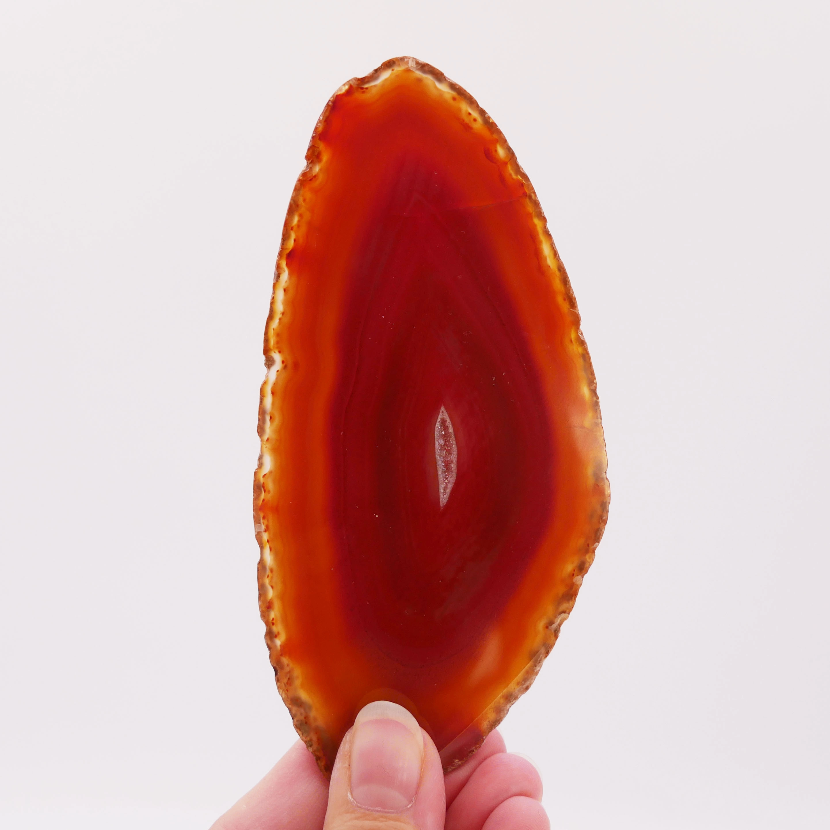 Egzemplarz oznaczony numerem 062 to unikatowy plaster naturalnego agatu, który przyciąga wzrok nasyconym, pomarańczowym zabarwieniem. Jest to cienka płytka o nieregularnym obrysie, której obie strony zostały wypolerowane na wysoki połysk, uwydatniając gładkość i blask kamienia. Zewnętrzna krawędź pozostała surowa, co stanowi naturalną ramę dla barwnego wnętrza. Polerowanie eksponuje charakterystyczny dla tego okazu (nr 062) układ warstw i pasm w ciepłych tonacjach oranżu, brzoskwini i bieli.