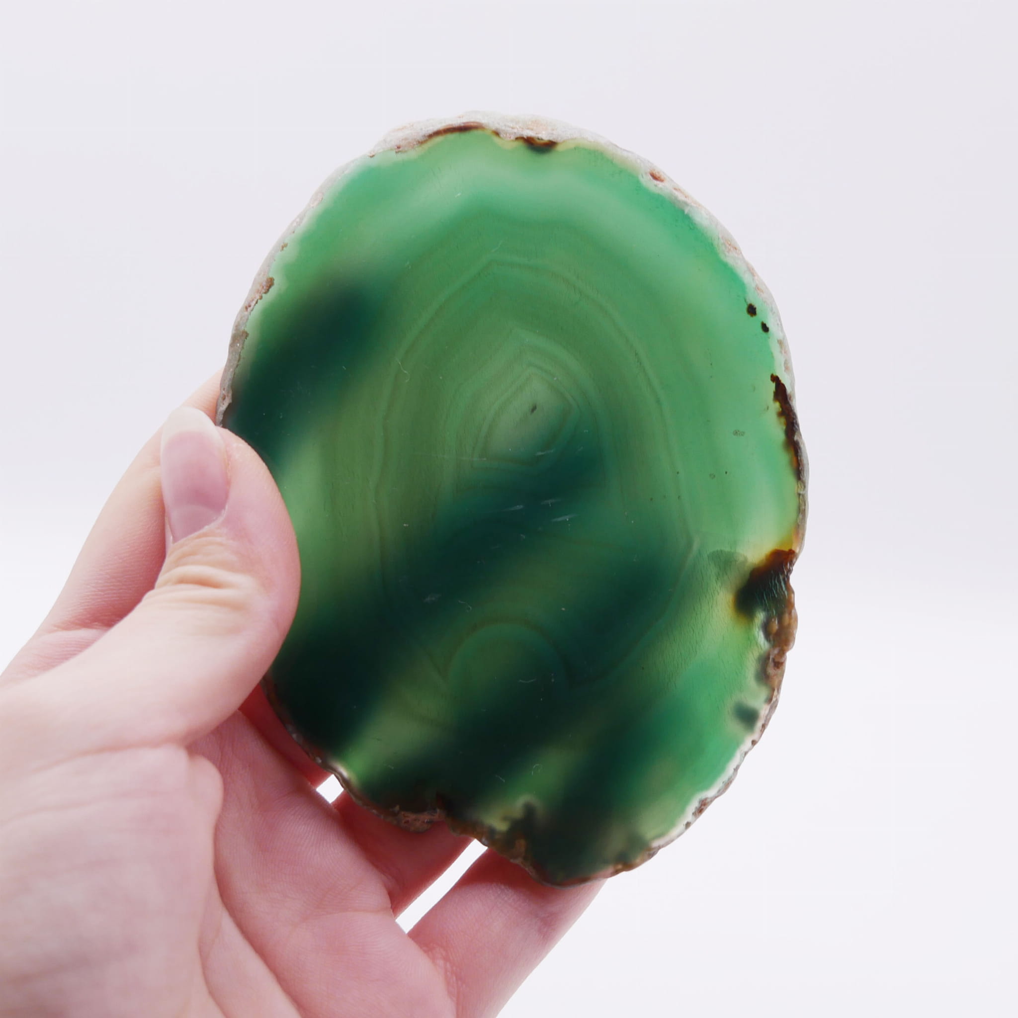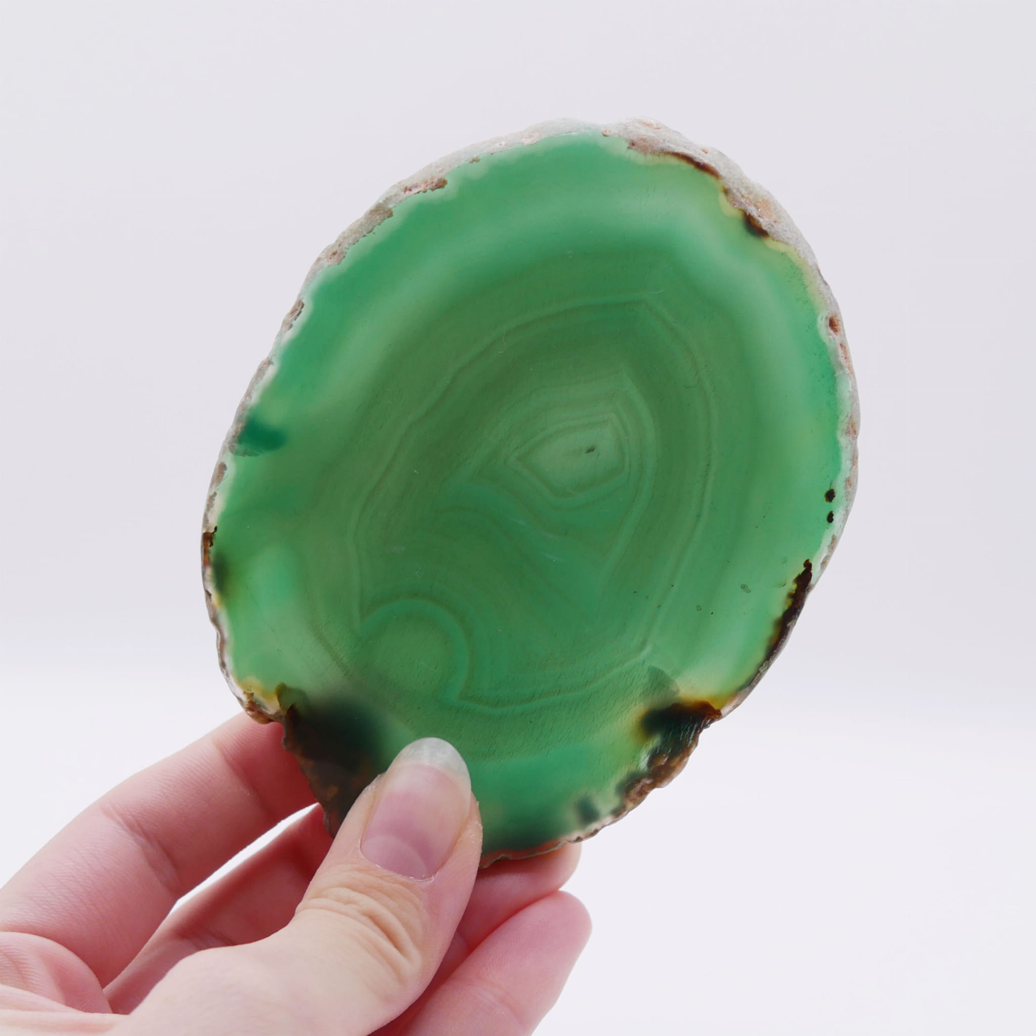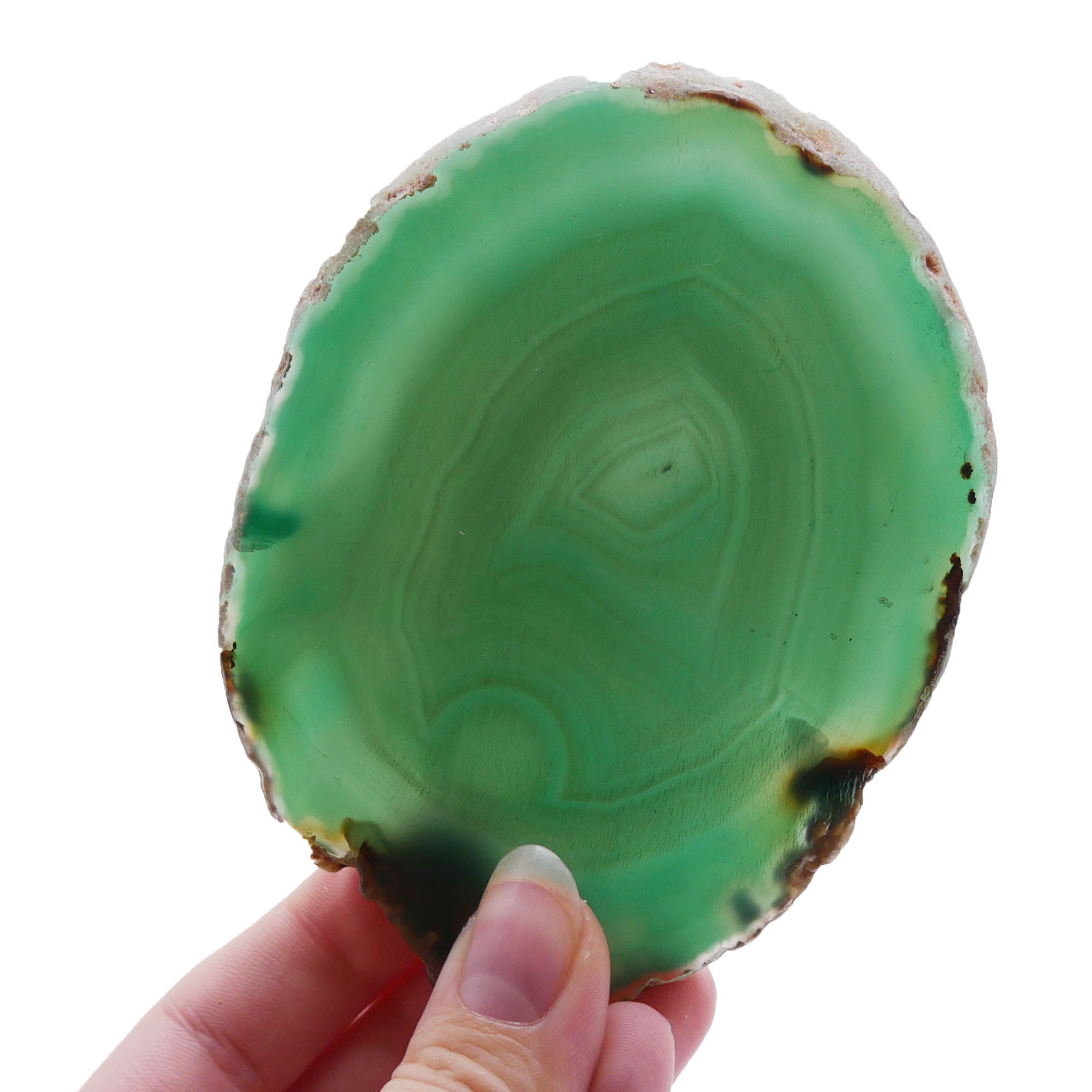 Prezentowany egzemplarz oznaczony numerem 064 to wyjątkowy plaster naturalnego agatu, wyróżniający się głębokim, zielonym zabarwieniem. Jest to cienka płytka o nieregularnym kształcie, której obie płaskie powierzchnie poddano starannemu polerowaniu, uzyskując wysoki połysk i idealną gładkość. Zewnętrzna krawędź pozostała w stanie surowym, co dodaje całości naturalnego, dzikiego charakteru. Polerowanie uwydatnia charakterystyczny dla tego okazu (nr 064) układ warstw i pasm w różnorodnych tonacjach zieleni.