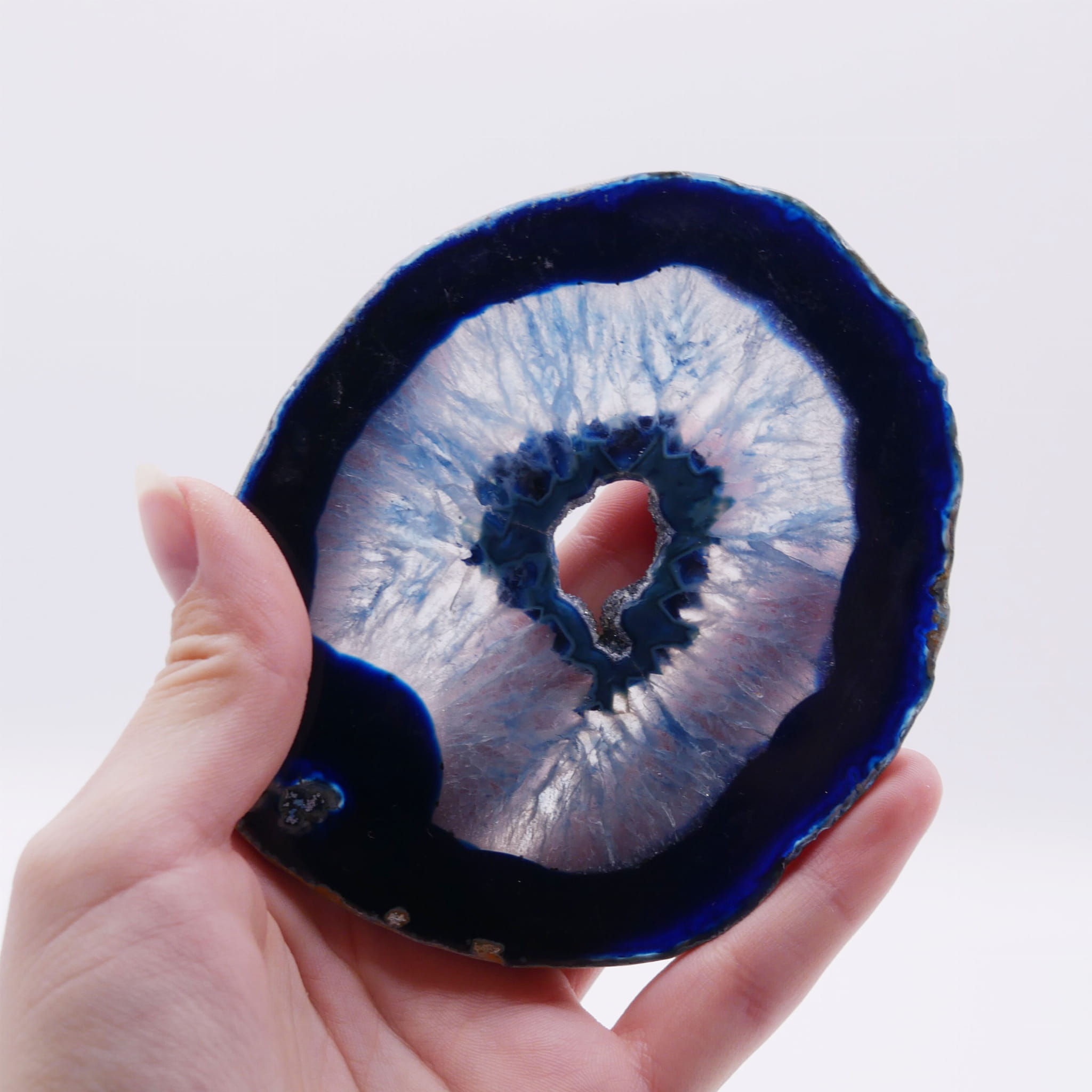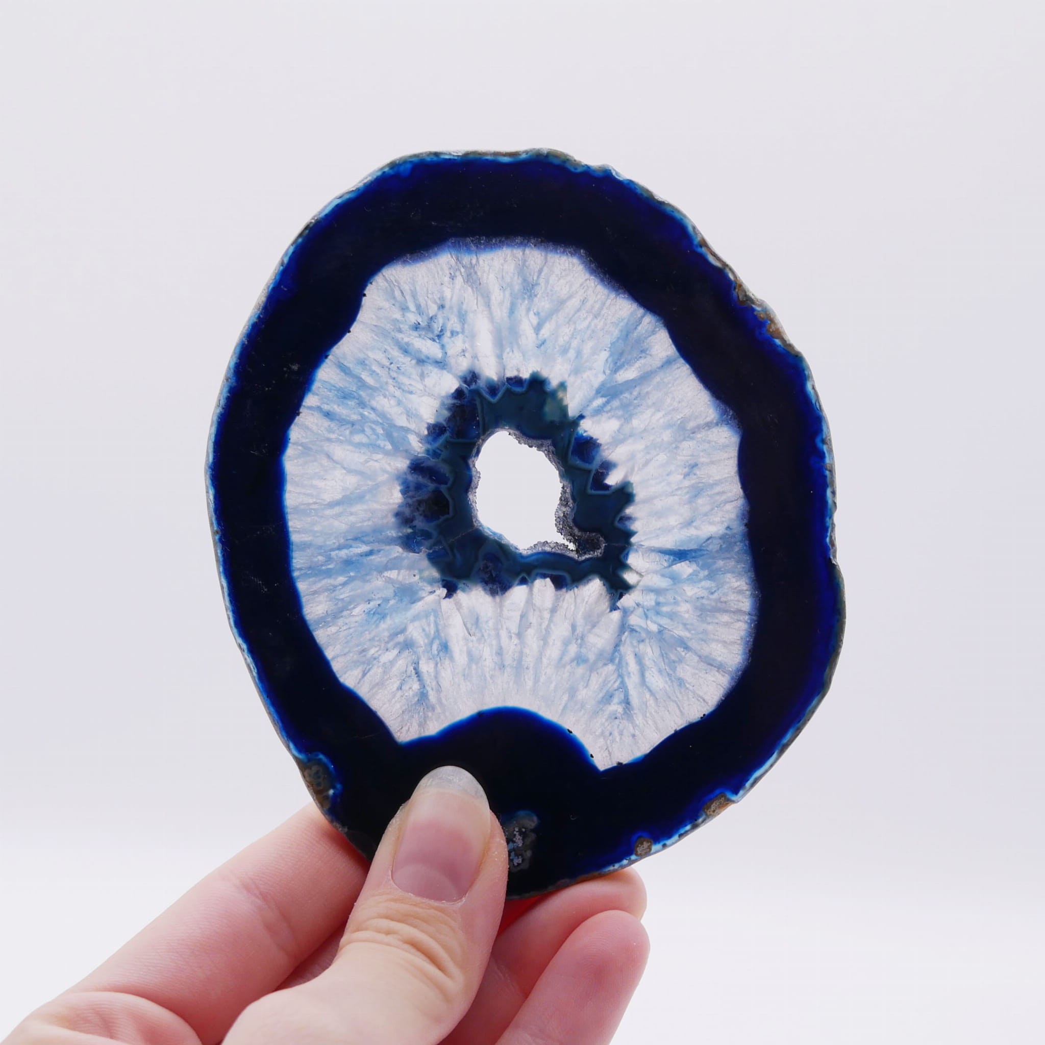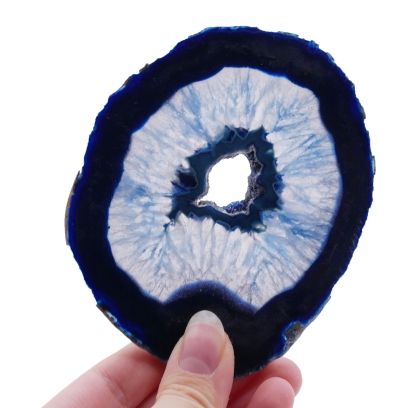 Oferowany plaster agatu, oznaczony numerem 017, to wyjątkowy fragment minerału charakteryzujący się żywym, niebieskim zabarwieniem. Jest to cienka płytka wycięta z agatu, która została starannie wypolerowana po obu stronach, co nadaje jej wysoki połysk i gładkość. Polerowanie doskonale eksponuje wewnętrzną strukturę kamienia z charakterystycznym dla agatu, unikalnym układem pasm i wzorów w różnych odcieniach błękitu. Jako egzemplarz nr 017, posiada własny, niepowtarzalny charakter.
