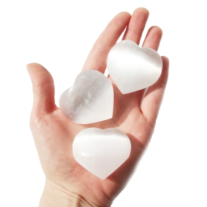 Oferujemy polerowane serca wykonane z naturalnego selenitu, o przybliżonym rozmiarze około 40 mm. Każde serce zostało starannie uformowane i wypolerowane, aby uzyskać gładką, przyjemną w dotyku powierzchnię. Polerowanie pięknie eksponuje charakterystyczny dla selenitu jedwabisty połysk oraz jego delikatną, mleczną lub półprzezroczystą strukturę, często z widocznymi naturalnymi włóknami. Ze względu na naturalną zmienność kamienia i ręczne wykonanie, każde serce jest unikatowym egzemplarzem pod względem wewnętrznej struktury i precyzji kształtu.