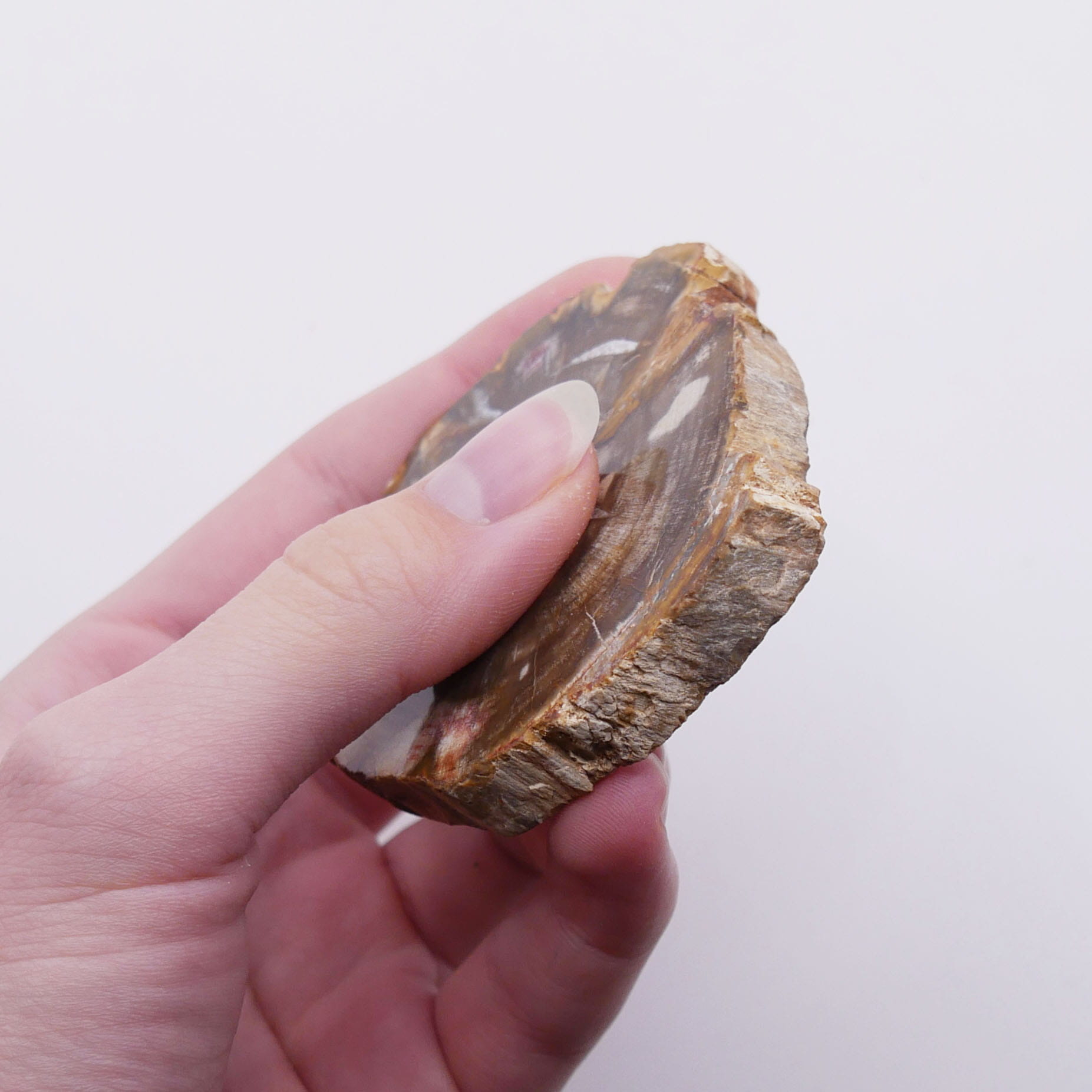 Prezentowany okaz, oznaczony numerem 017, to wyjątkowy plaster skamieniałego drewna, będący trwałym świadectwem historii geologicznej. Stanowi on przekrój przez prehistoryczny pień, którego obie płaskie powierzchnie zostały starannie wypolerowane. Dzięki temu zabiegowi doskonale widoczna jest zmineralizowana struktura drewna, w tym układ słojów, zatopiona w naturalnych barwach ziemi. Zewnętrzna krawędź zachowała swoją surową, chropowatą formę, przypominając o organicznym rodowodzie minerału. Jako unikat, egzemplarz ten wyróżnia się niepowtarzalnym kształtem i rysunkiem.
