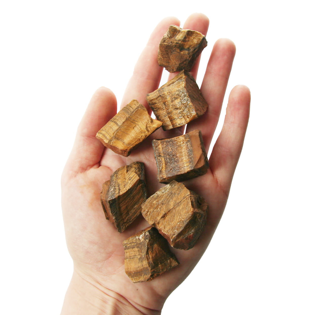 Oferujemy naturalne, surowe bryłki tygrysiego oka o przybliżonym rozmiarze w przedziale 30-40 mm. Każdy kamień zachowuje swoją pierwotną, nieobrobioną formę, prezentując nieregularny kształt i naturalną fakturę powierzchni. W strukturze bryłki widoczne są charakterystyczne dla tygrysiego oka złocisto-brązowe pasma. Nawet w surowej postaci, pod odpowiednim kątem, można dostrzec subtelny, jedwabisty połysk (tzw. efekt kociego oka), choć jest on mniej wyraźny niż w kamieniach polerowanych. Każda bryłka jest unikatowa pod względem kształtu, układu pasm i intensywności naturalnego połysku.